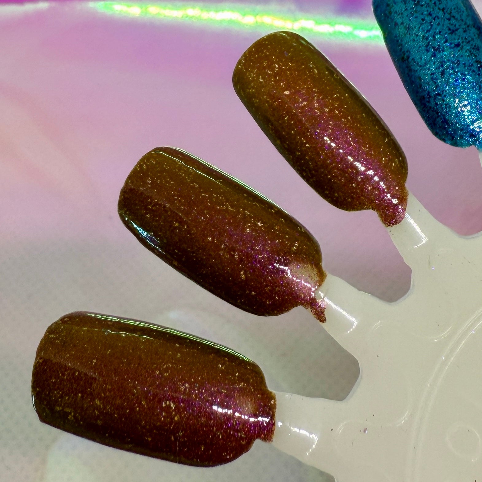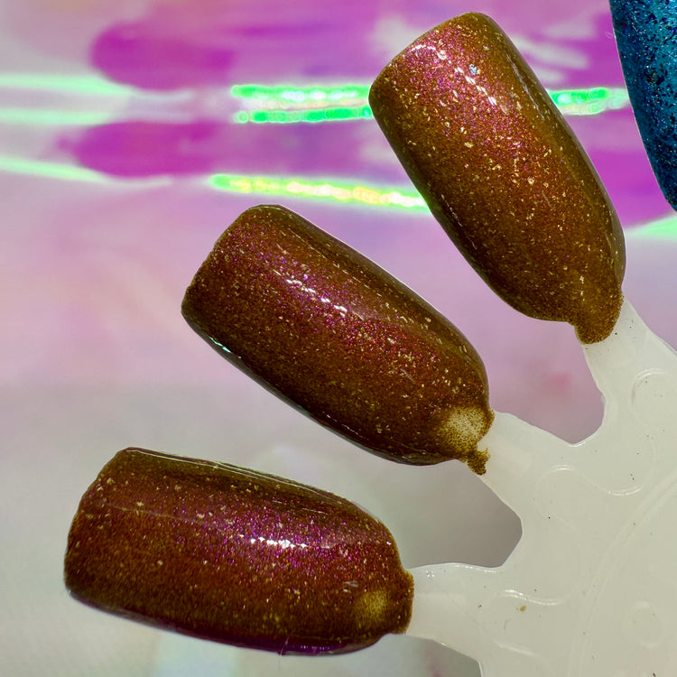 Chocolate Covered Feelings- a warm brown base filled with red to purple shifting shimmer and added holo flakie sparkle