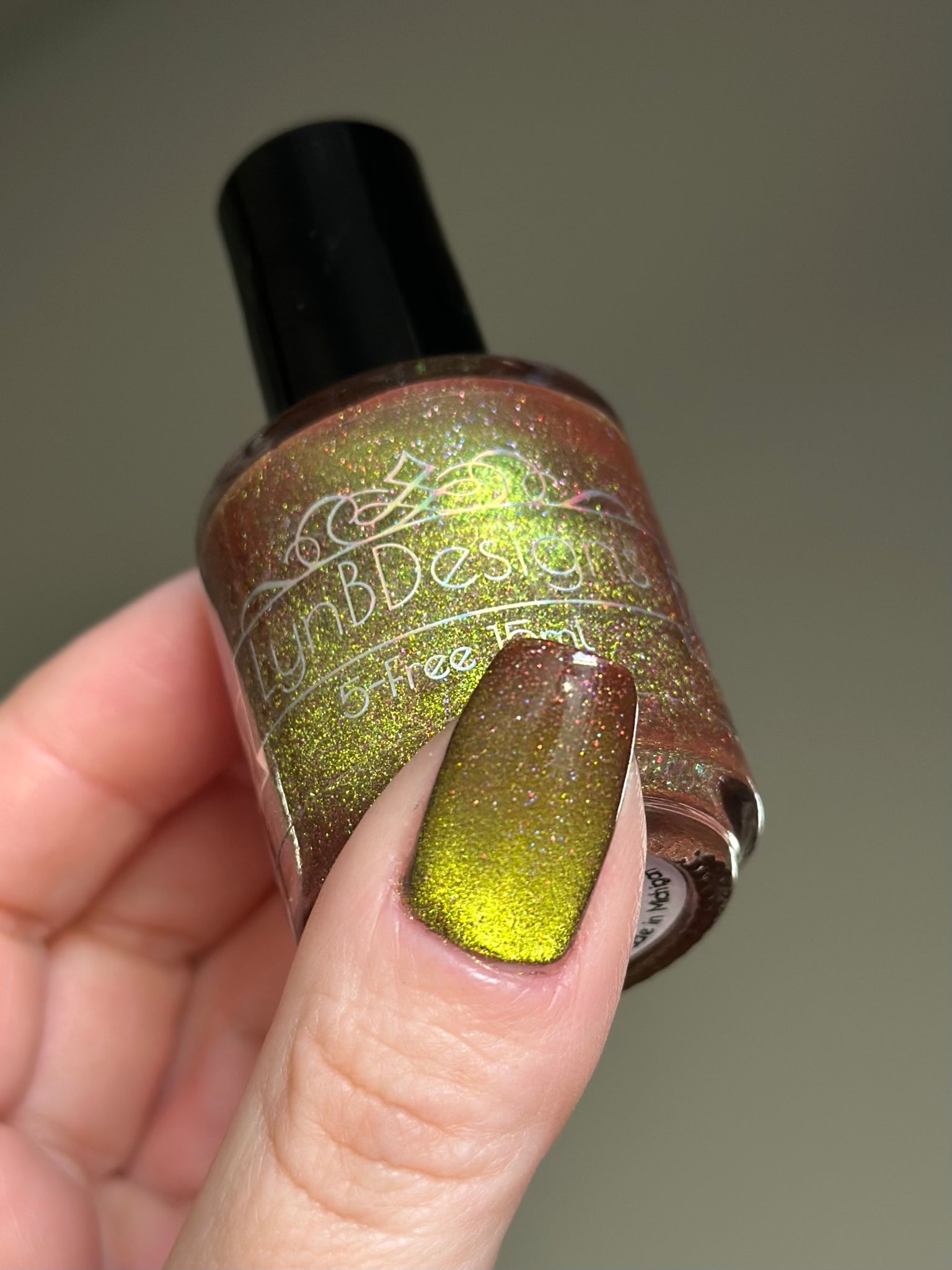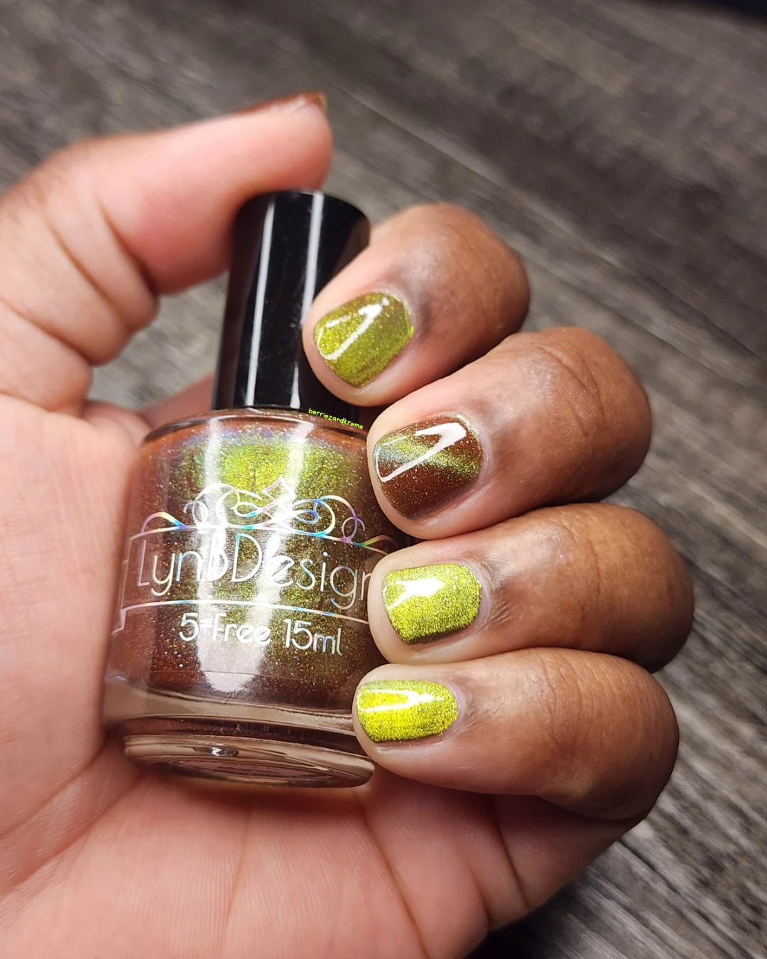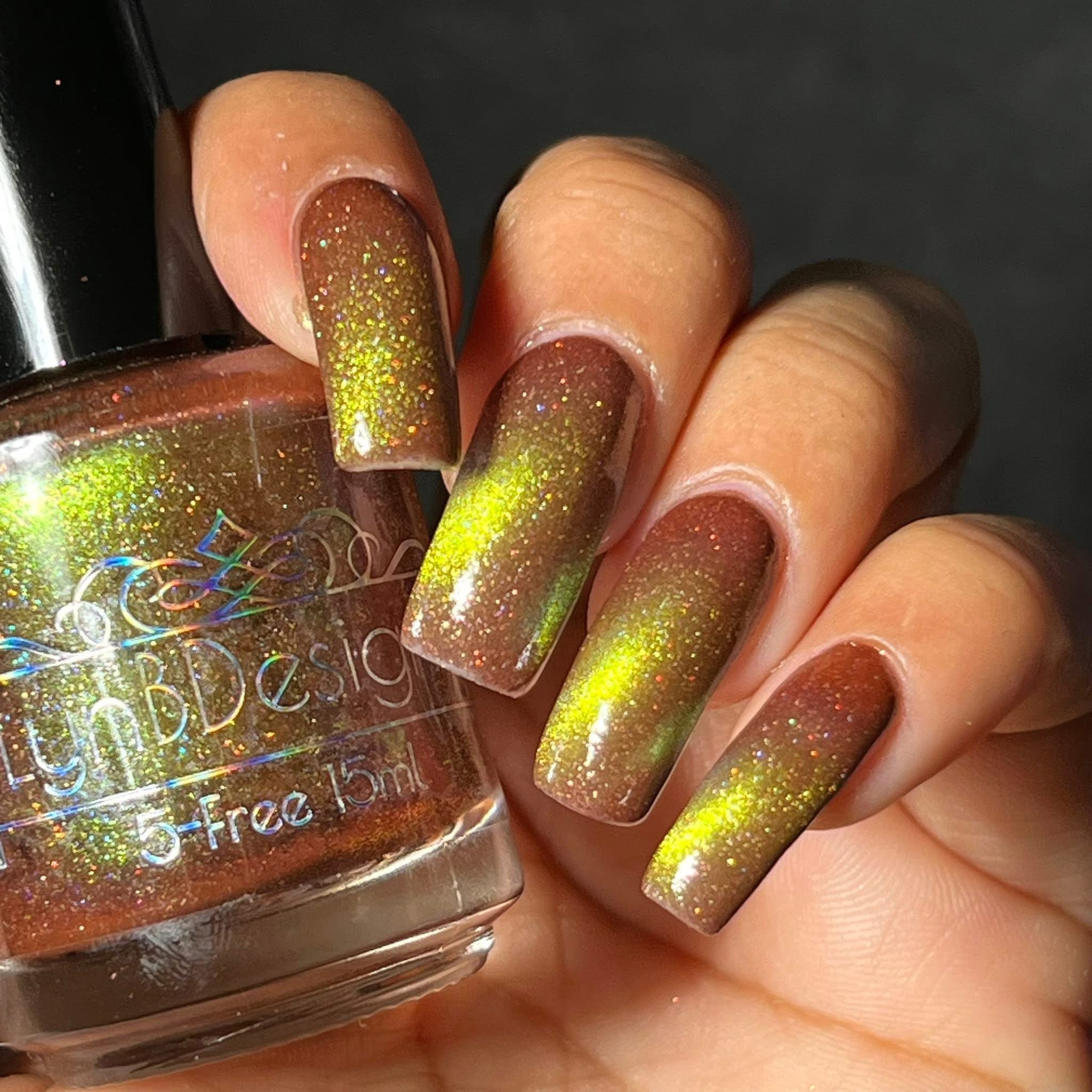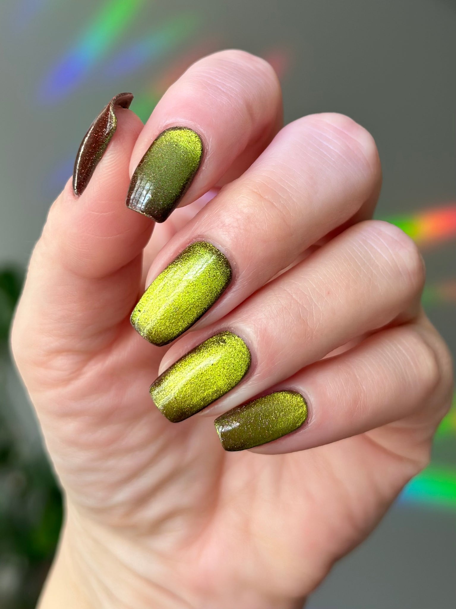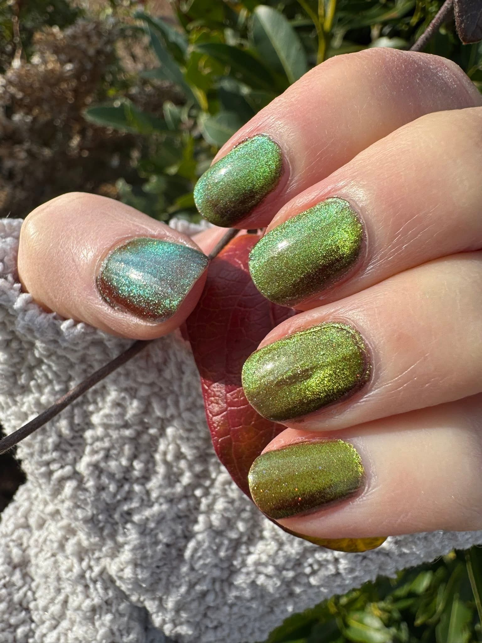 Fruit and Cheese Mold- russet base with green to gold to blue magnetic multichrome pull and scattered cherry pink holo