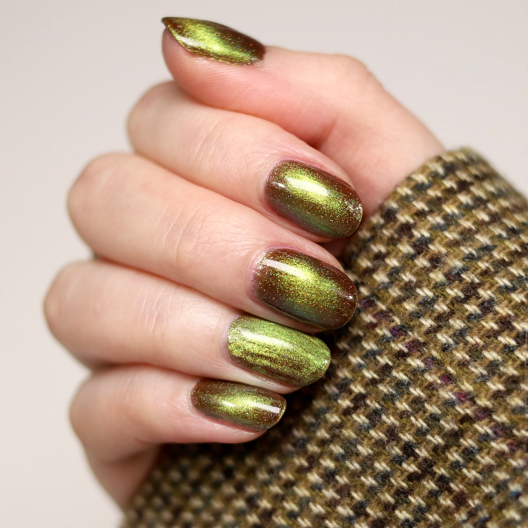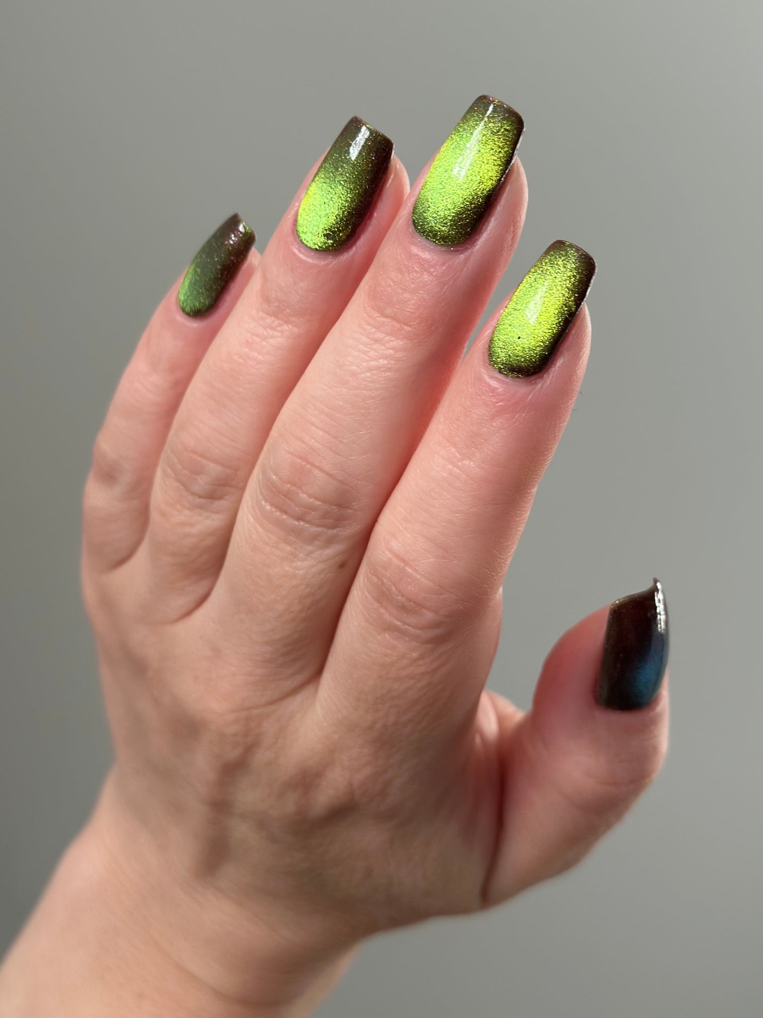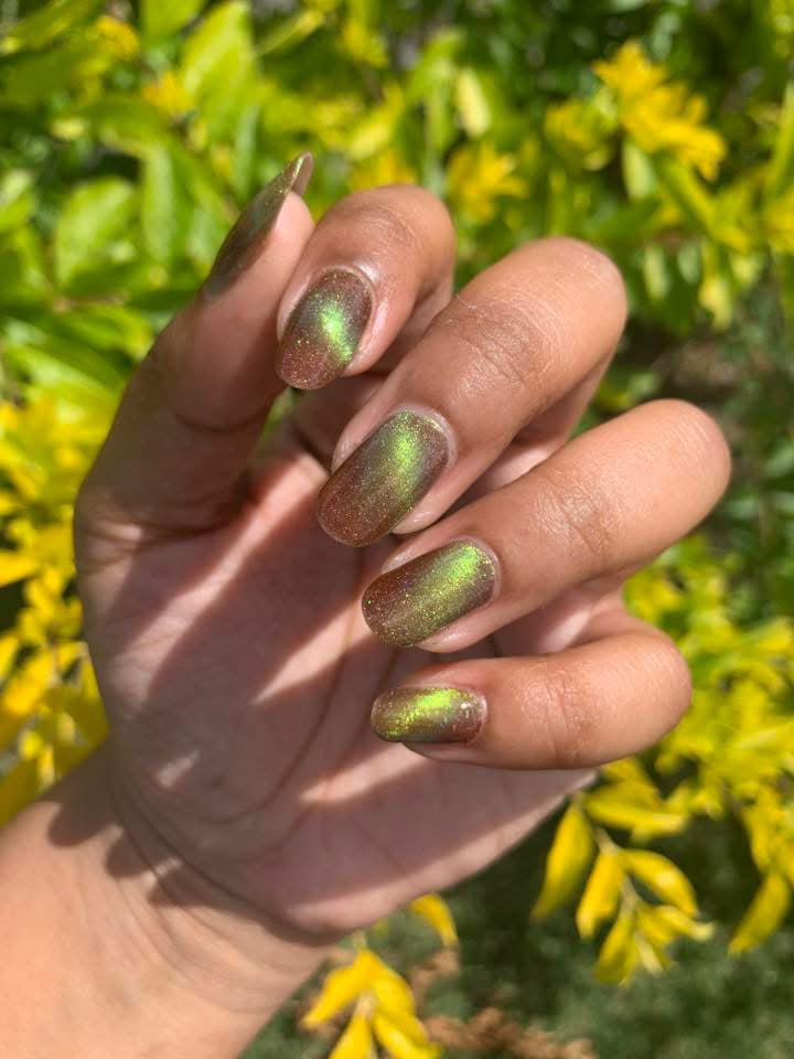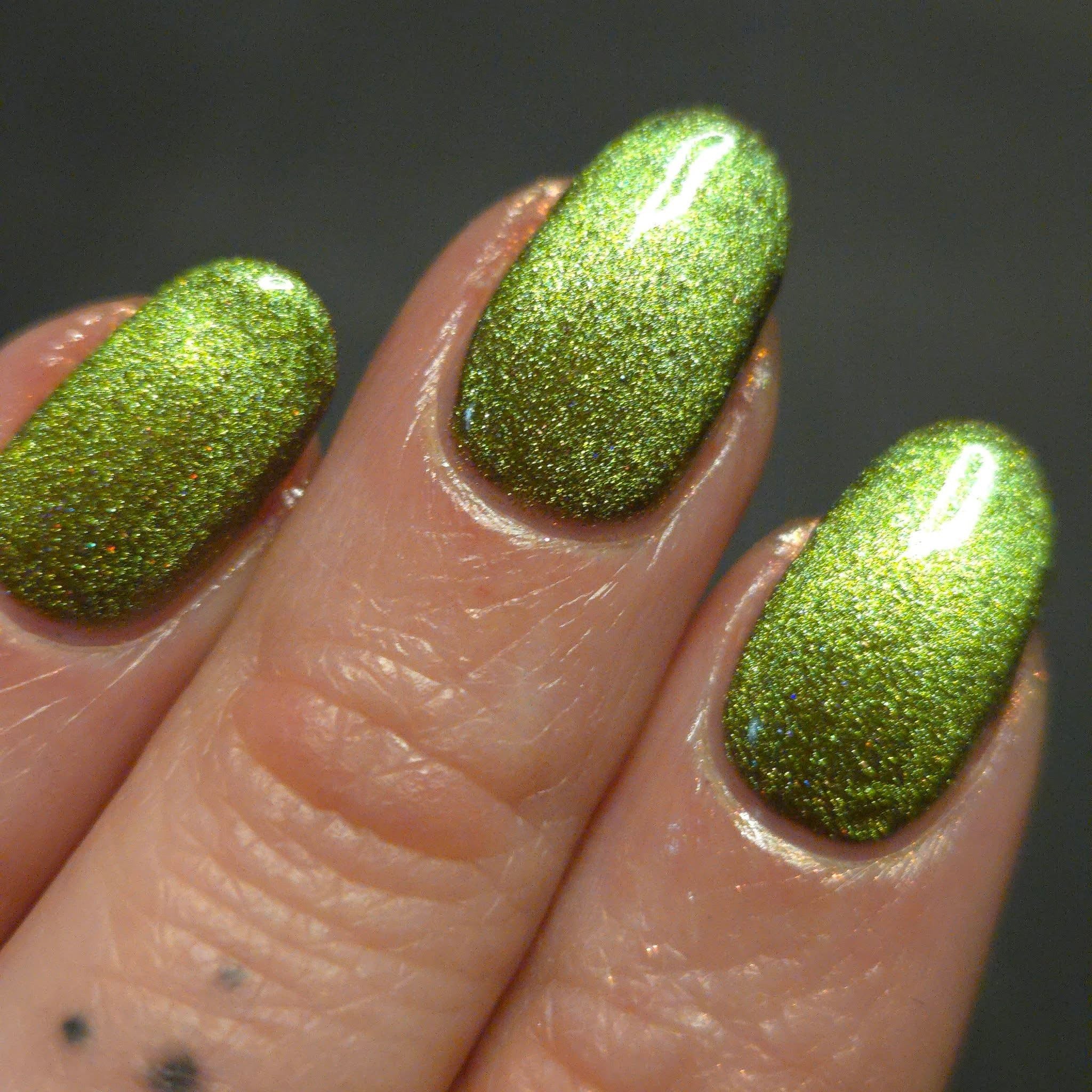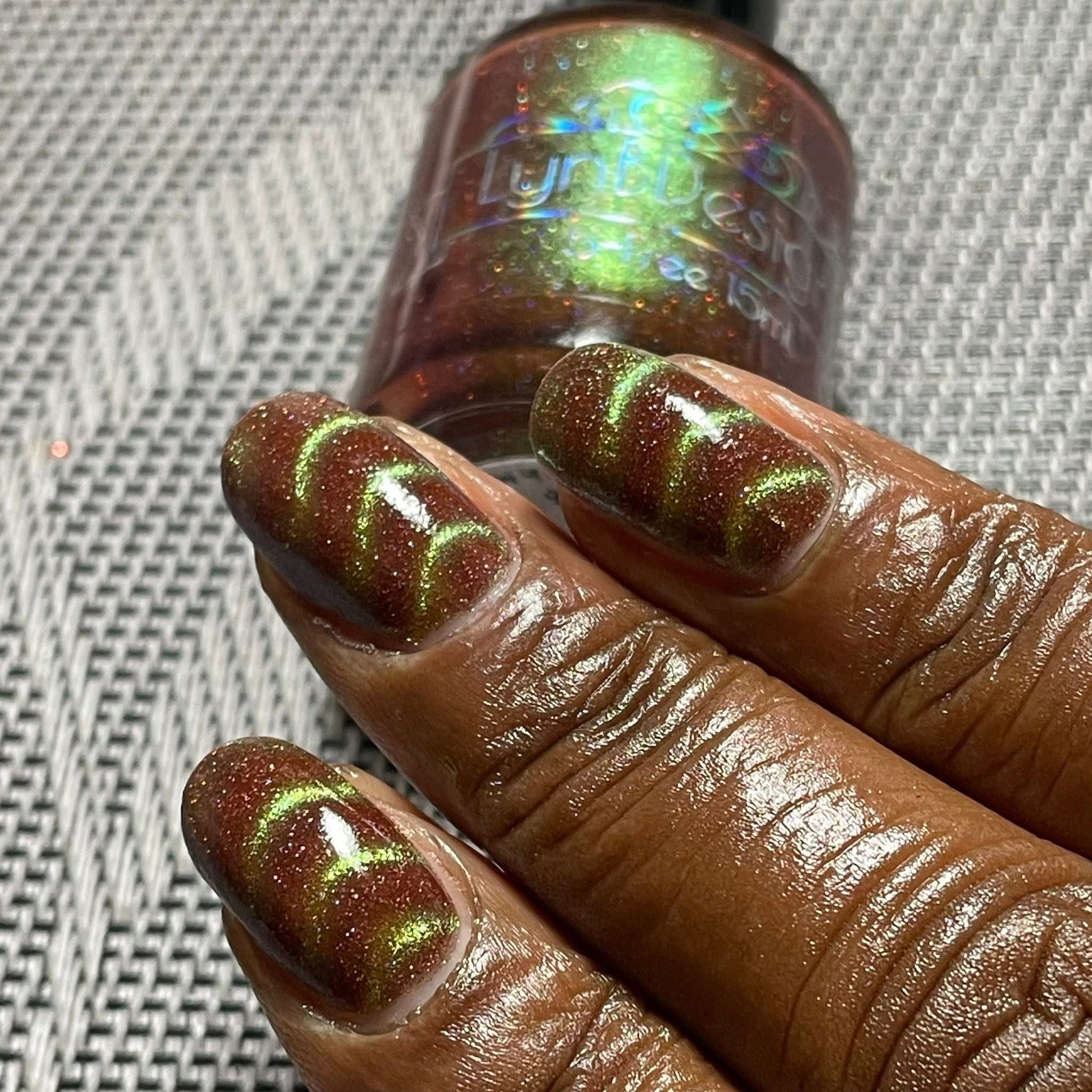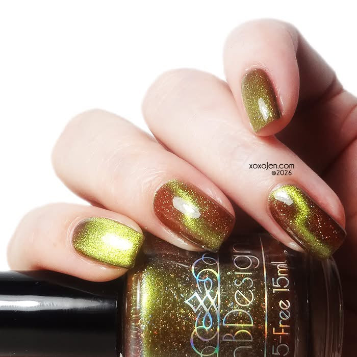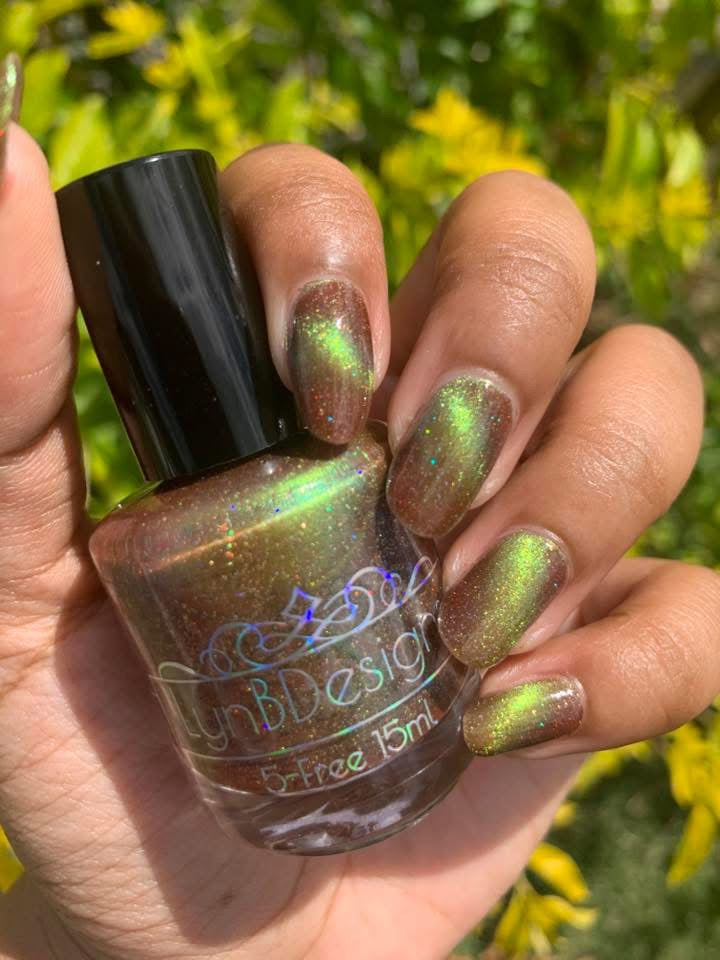 Fruit and Cheese Mold- russet base with green to gold to blue magnetic multichrome pull and scattered cherry pink holo