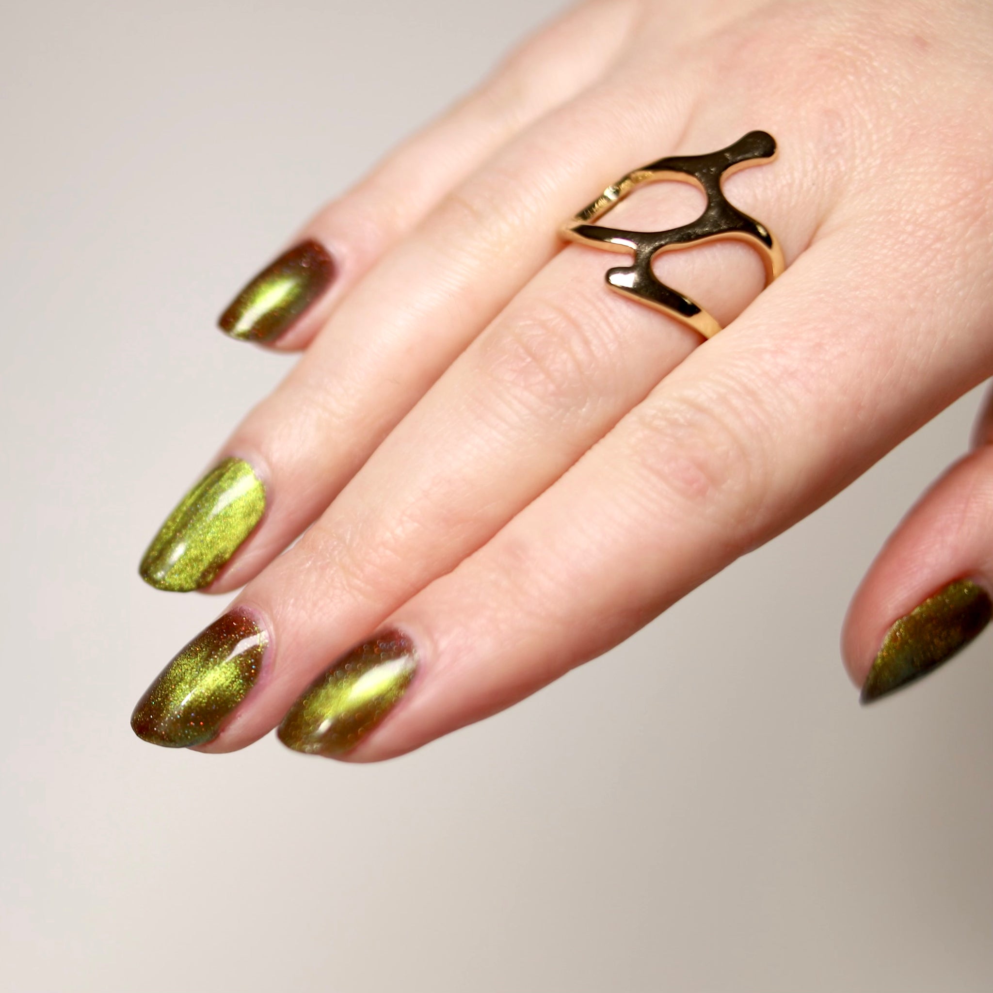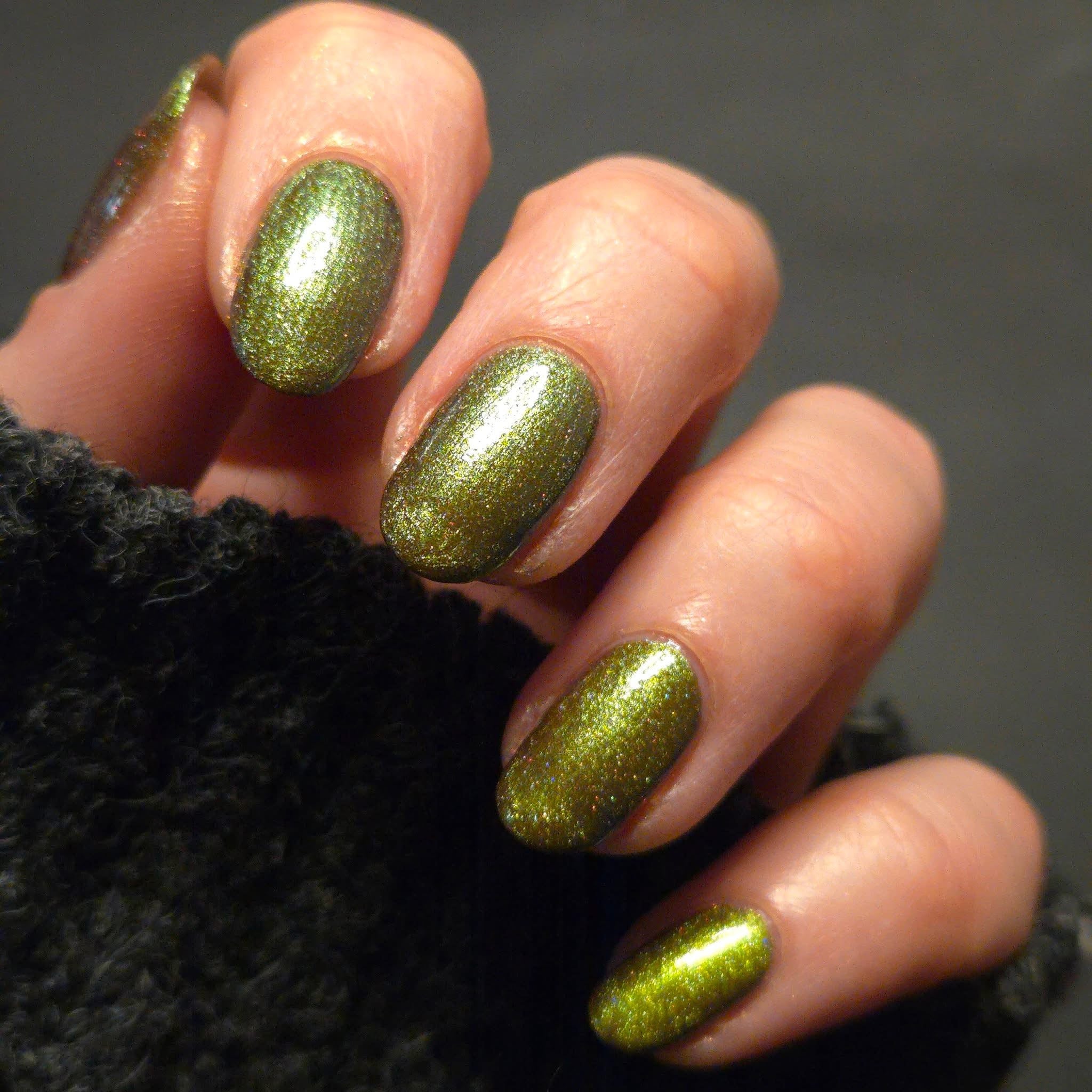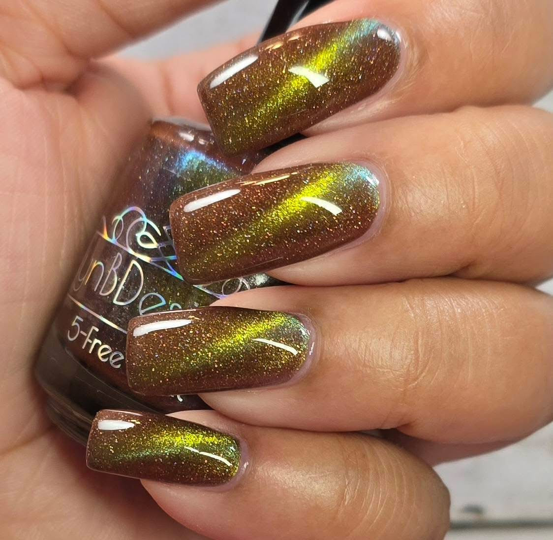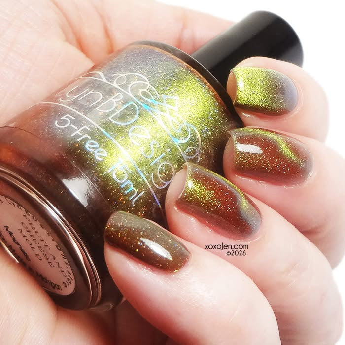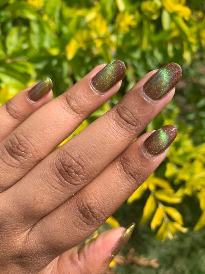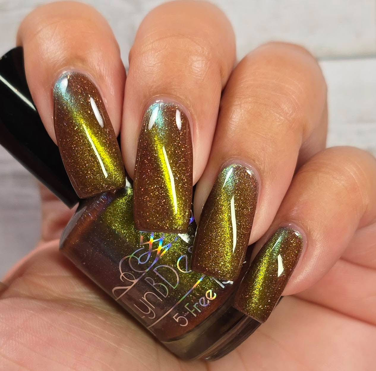 Fruit and Cheese Mold- russet base with green to gold to blue magnetic multichrome pull and scattered cherry pink holo