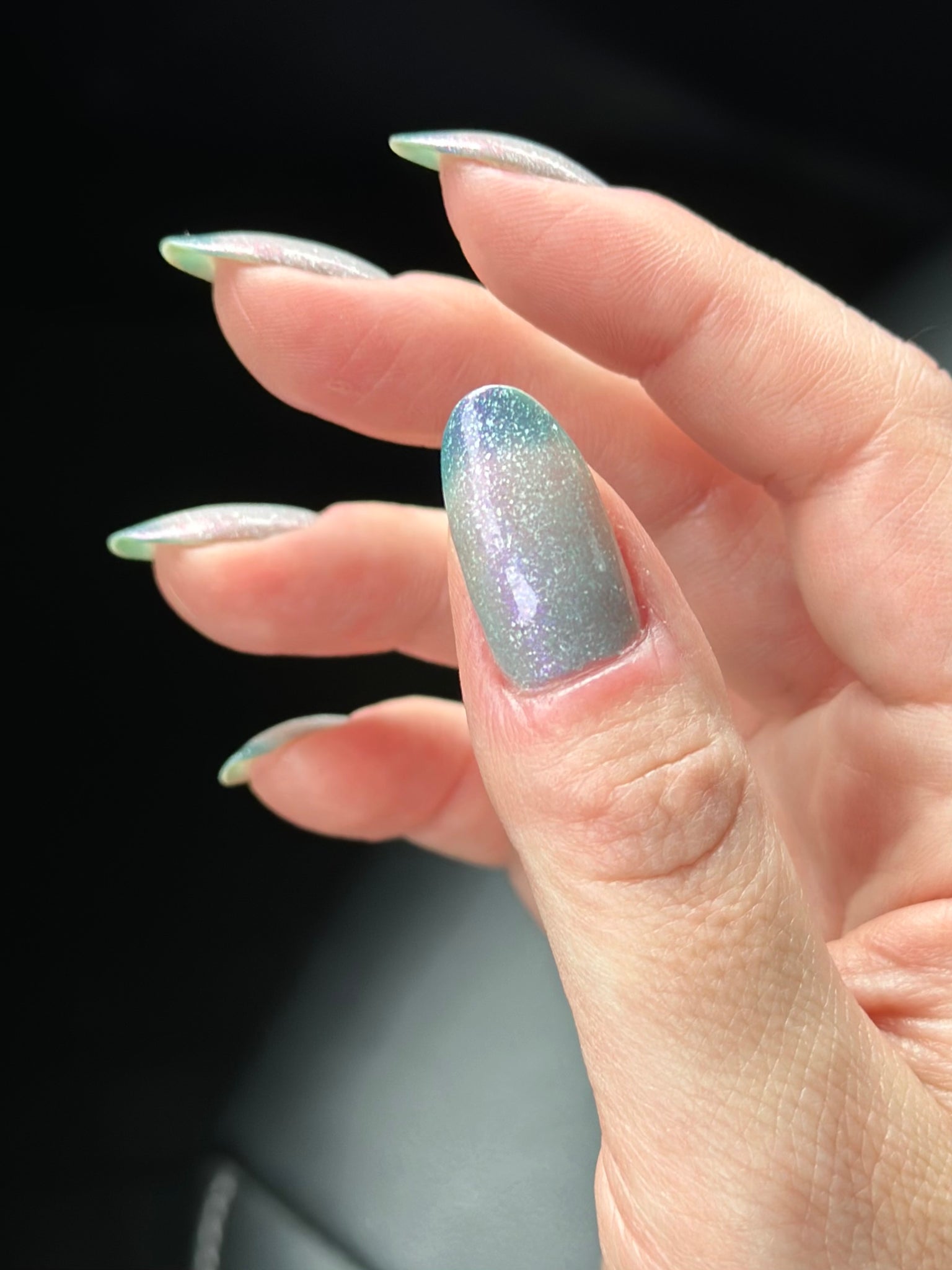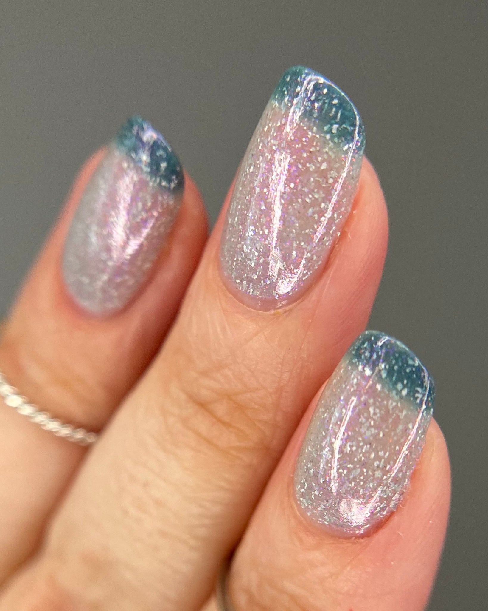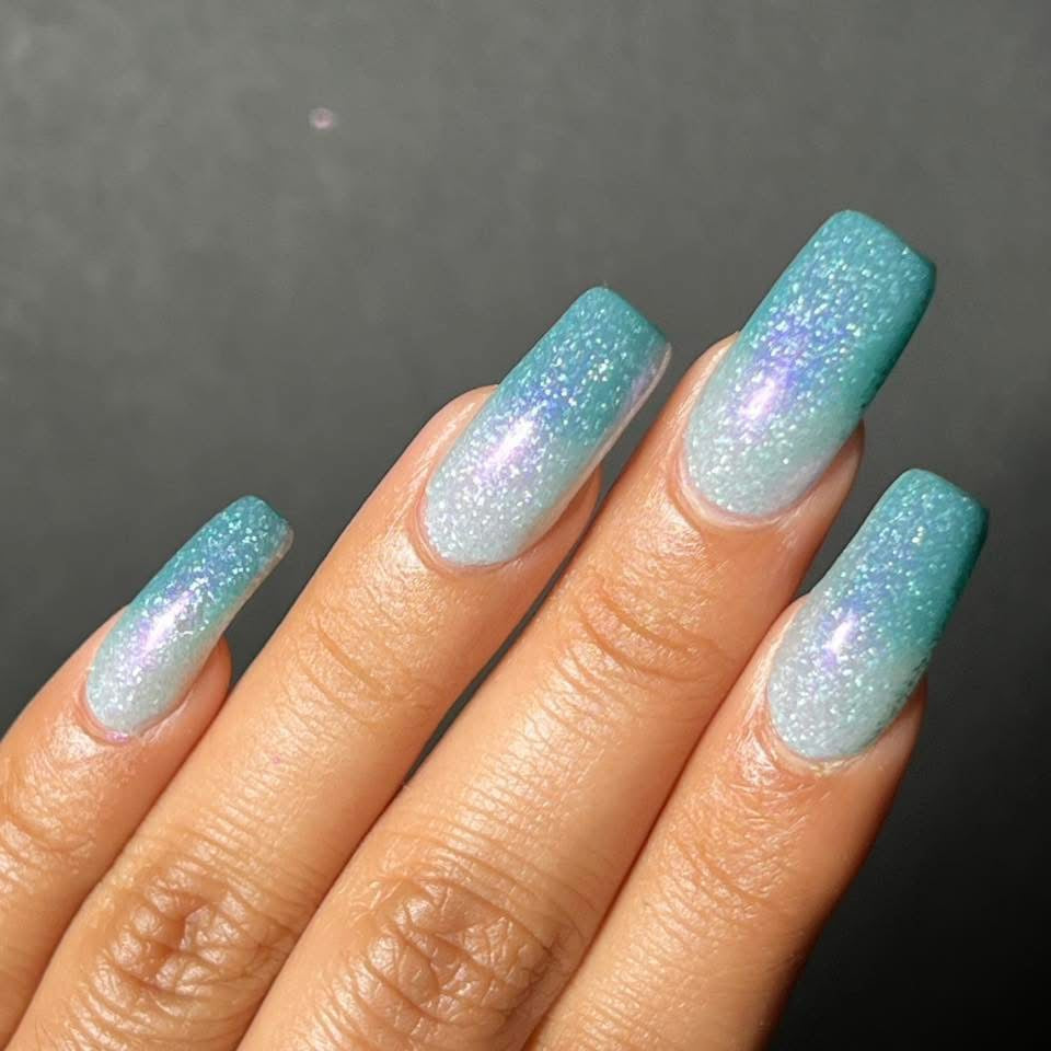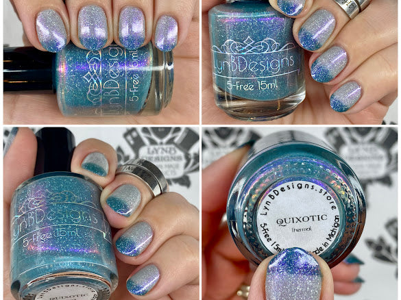 Quixotic- deep teal to pale grey thermal filled with purple to pink shifting shimmer and added holo flakies