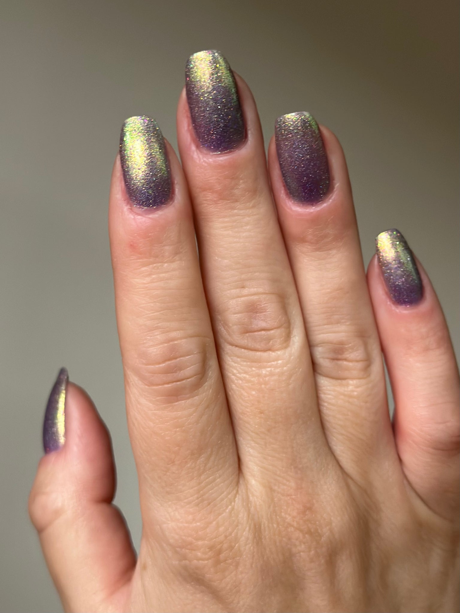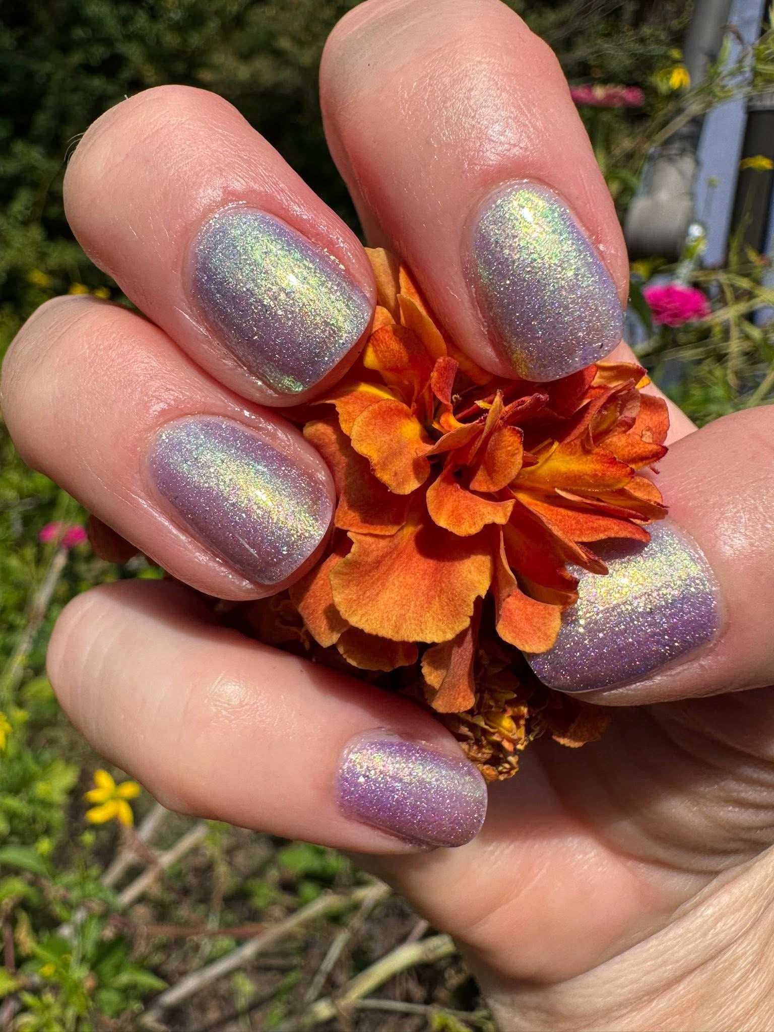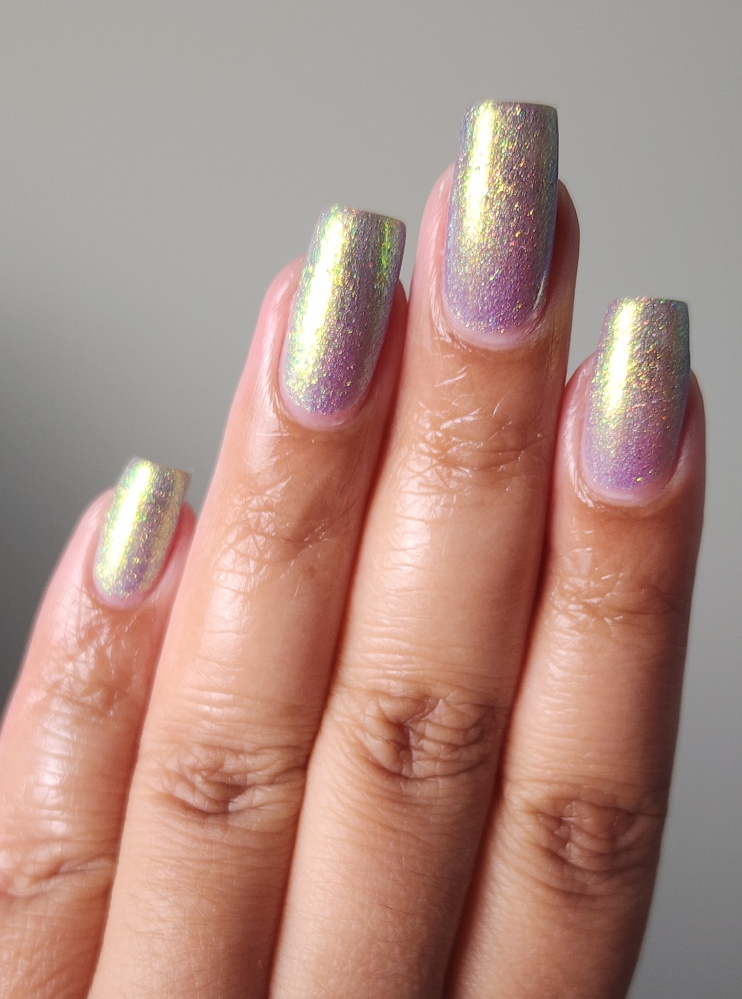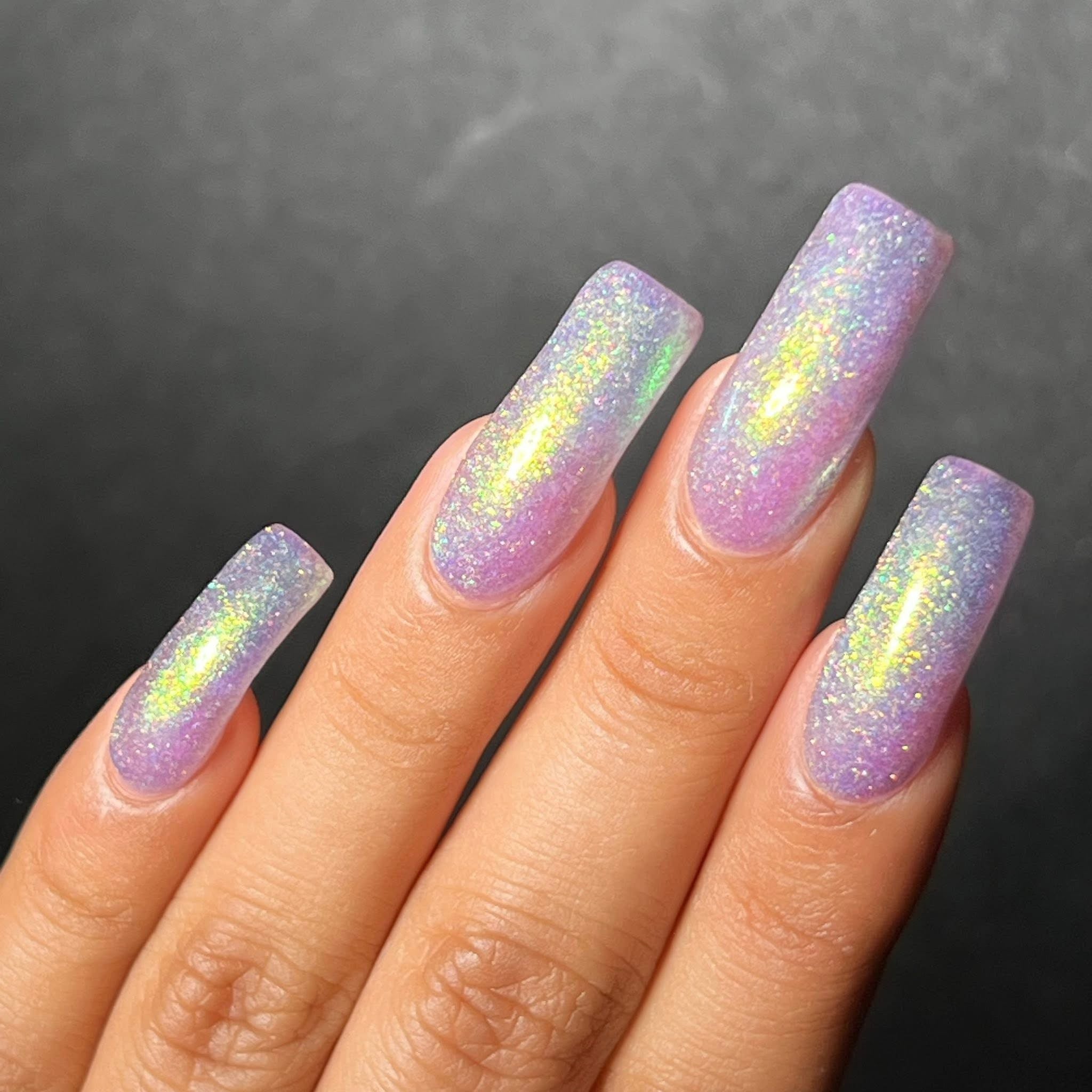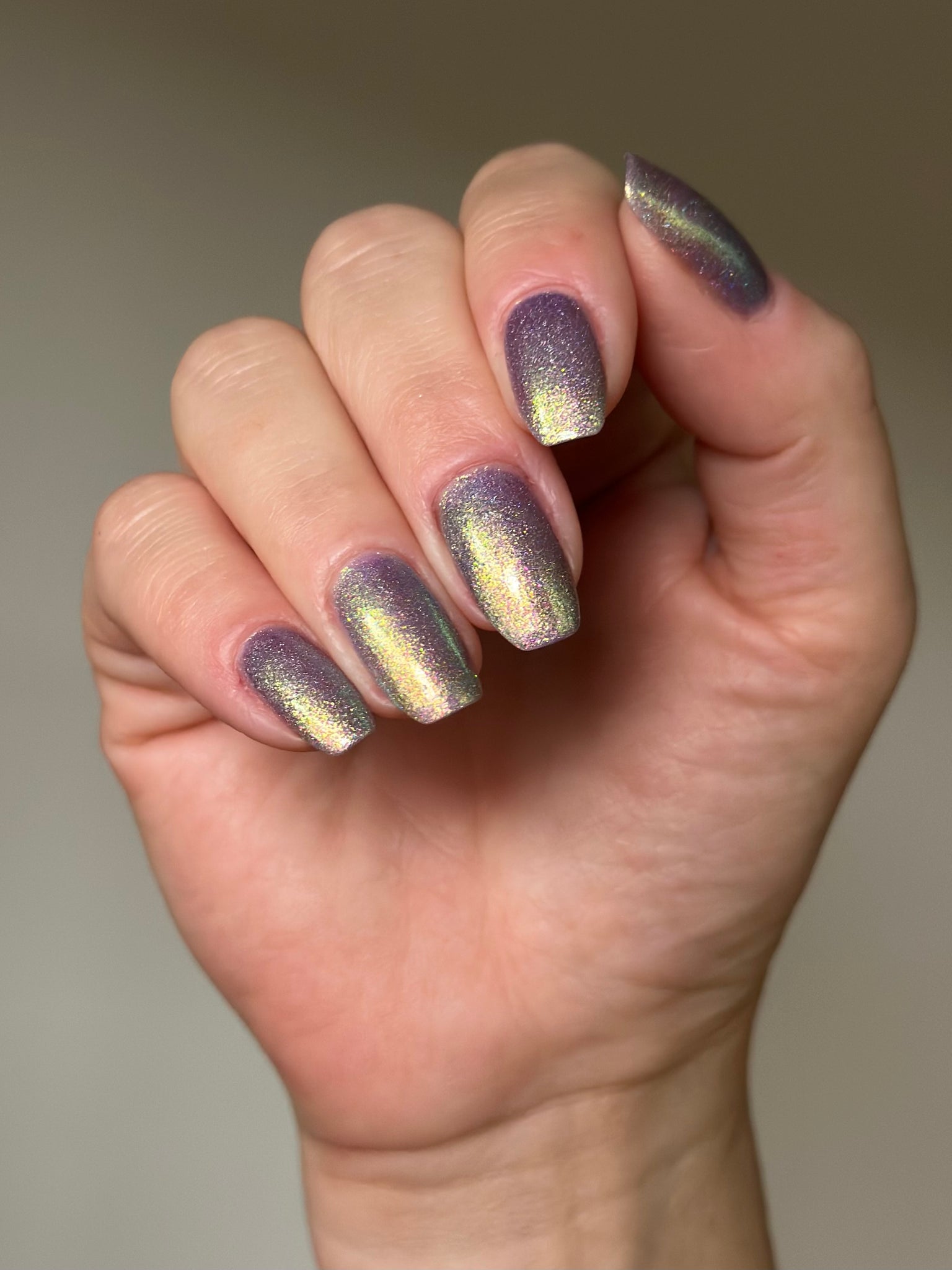Lovin, Touchin, Squeezin Some Butter- violet base filled with peach to green to blue shifting micro flakies and scattered holo sparkle