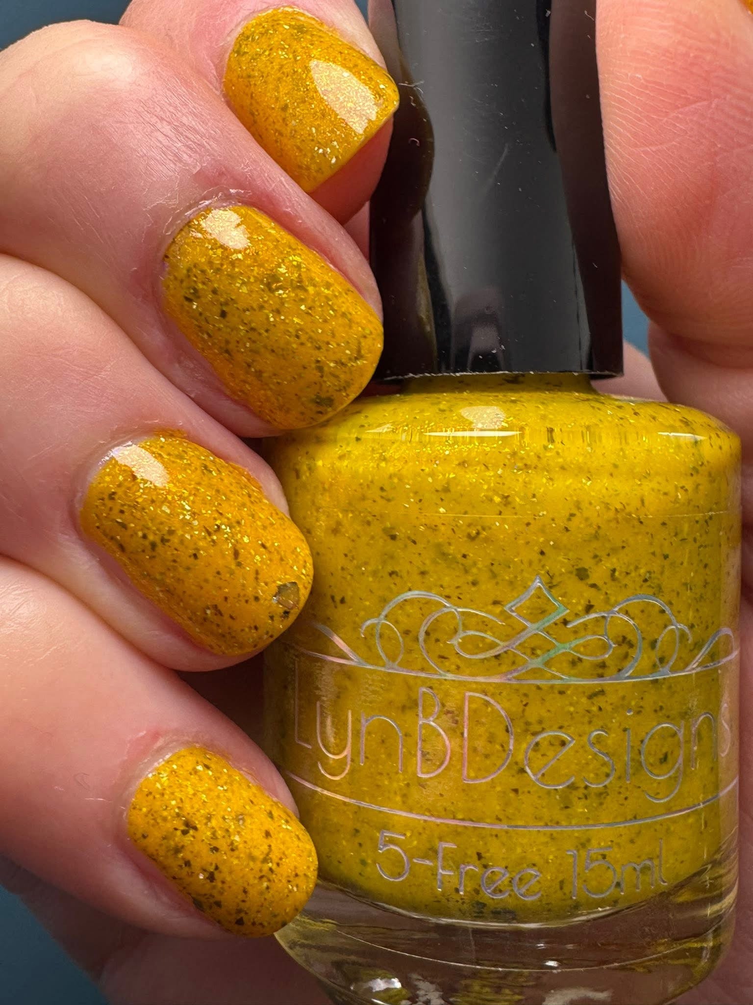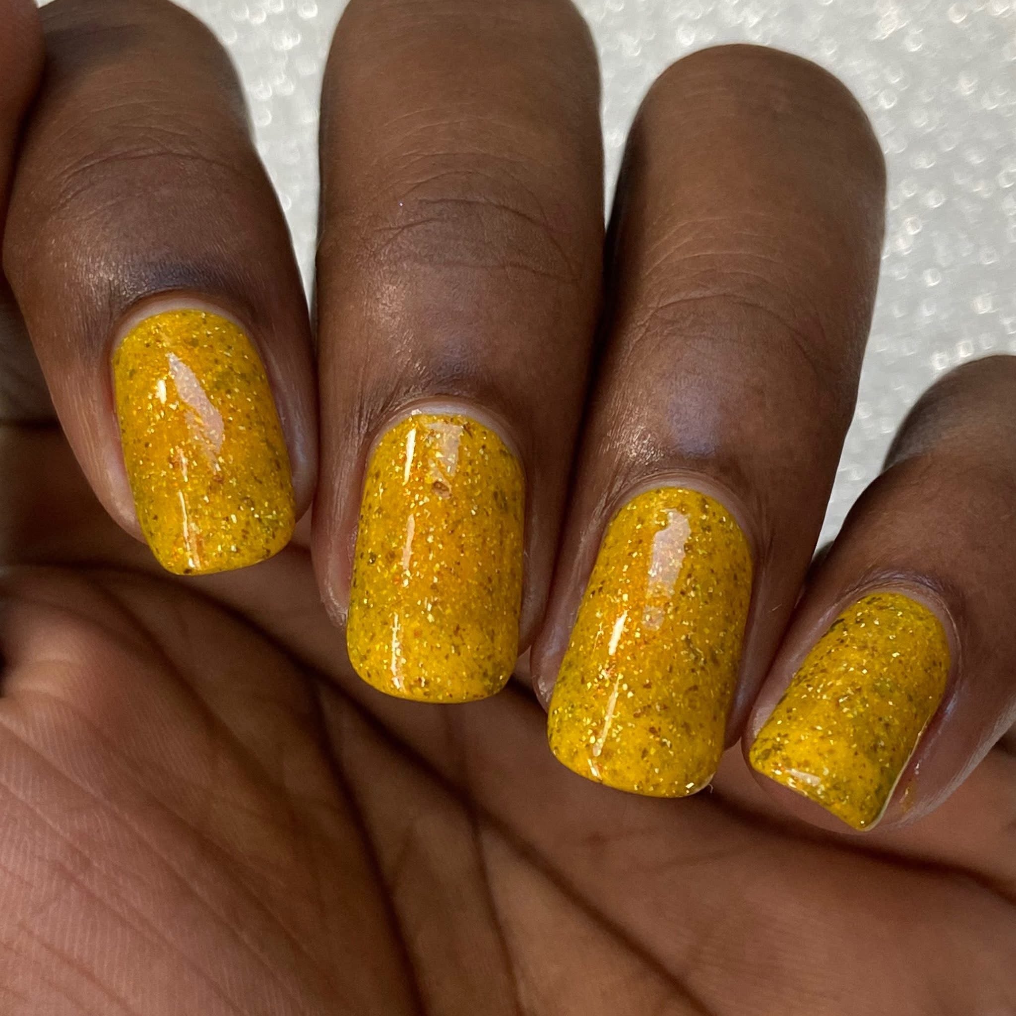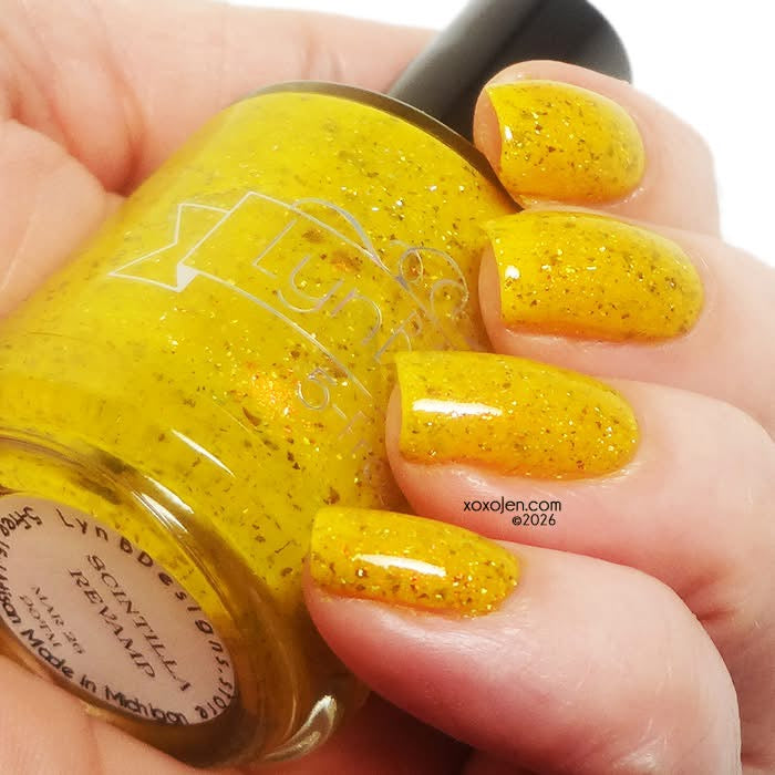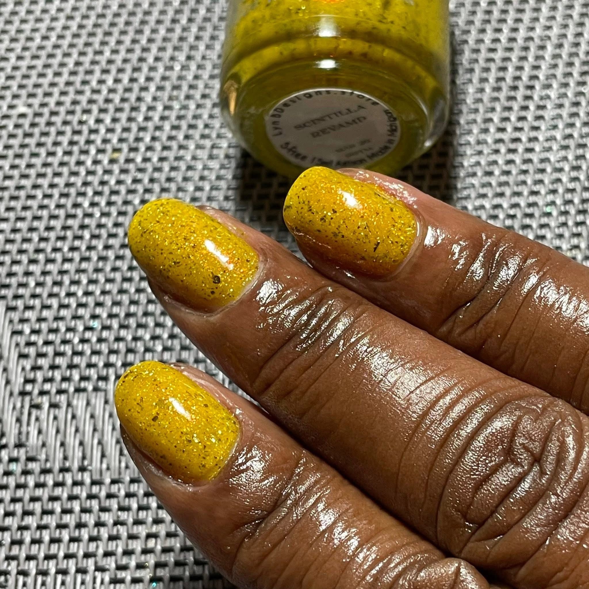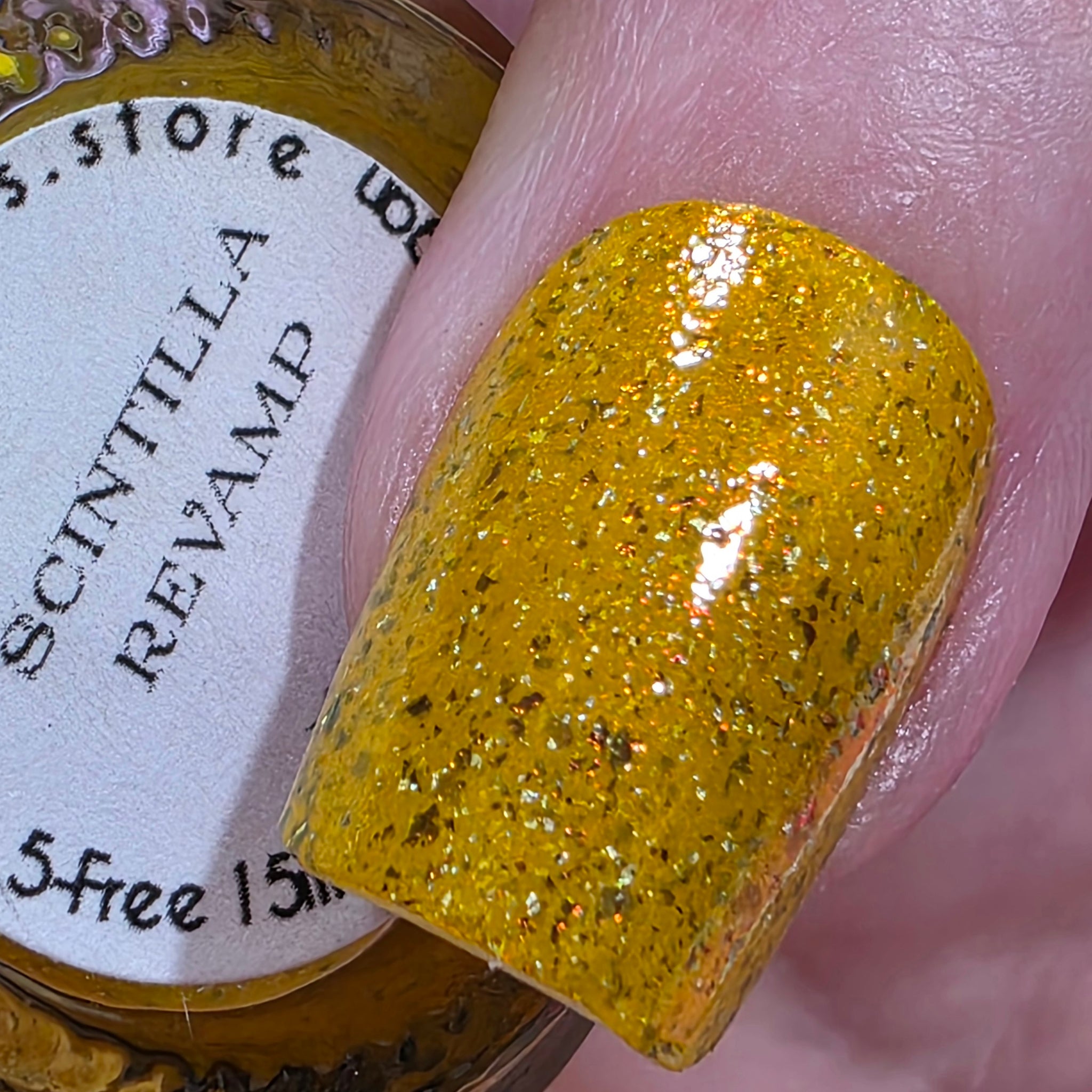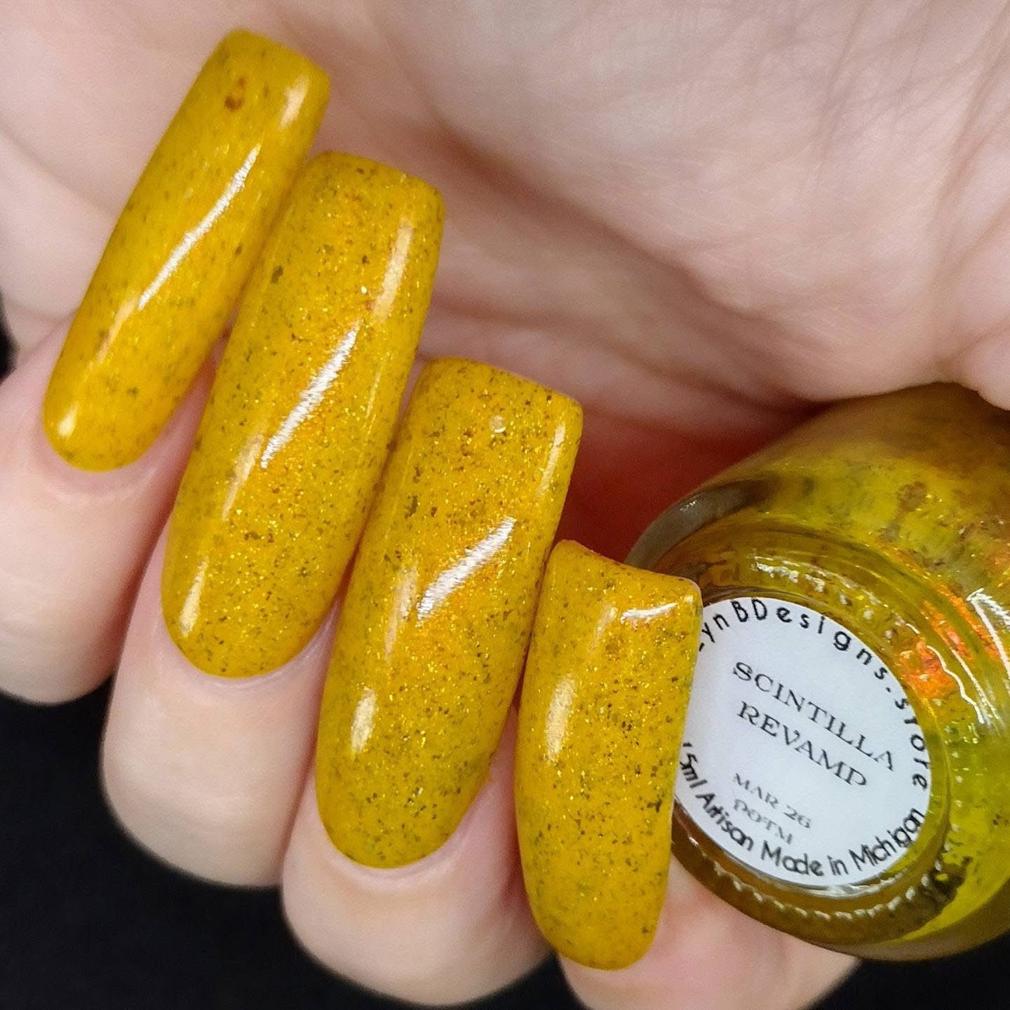 Scintilla Revamped- a mustard yellow base filled with gold to bronze shifting UCC flakies, scattered red to orange shifting shimmer, and scattered holo micro flakies
