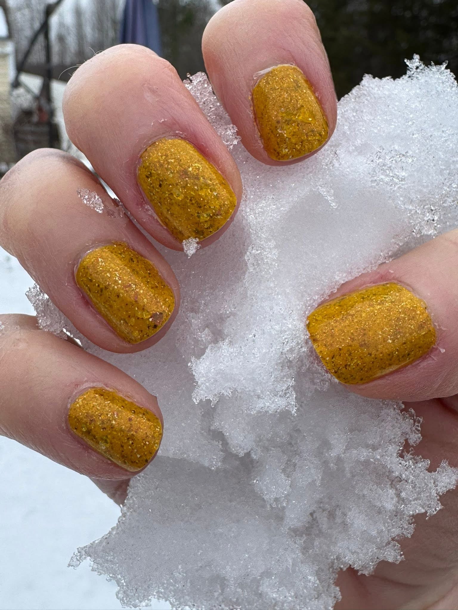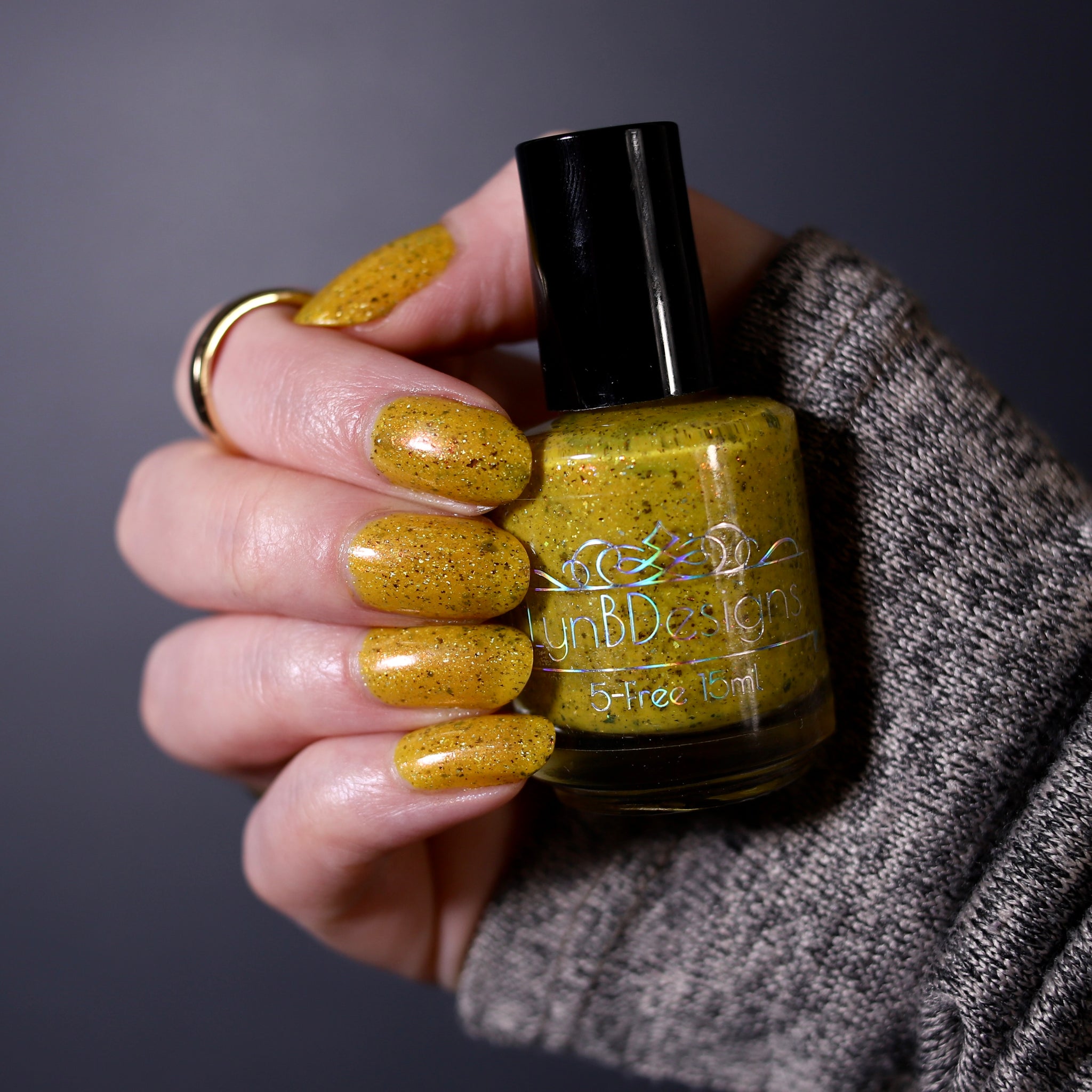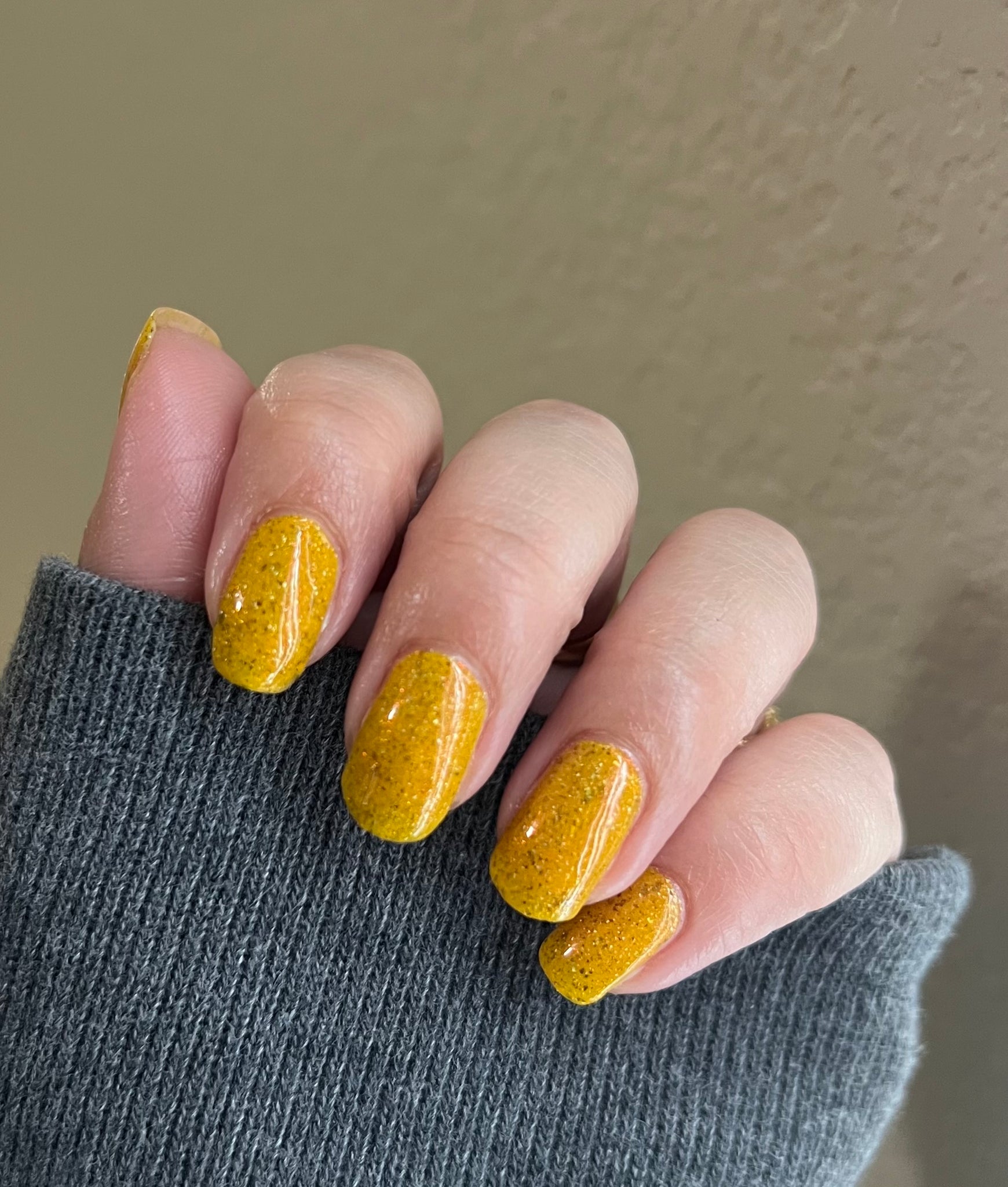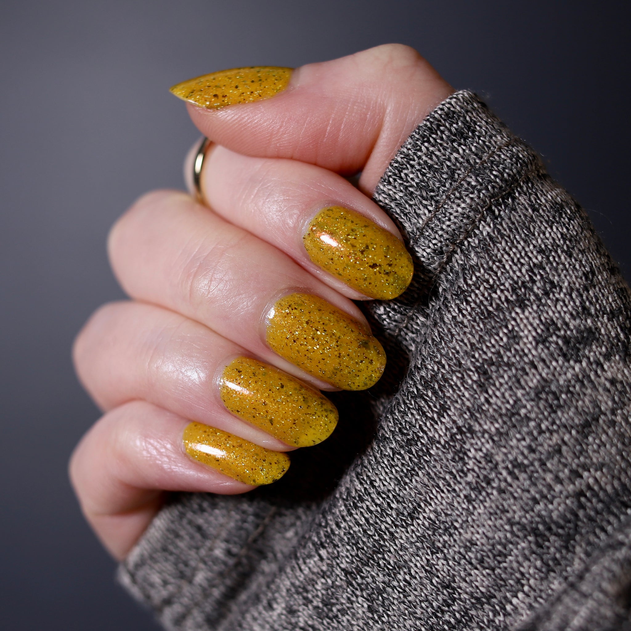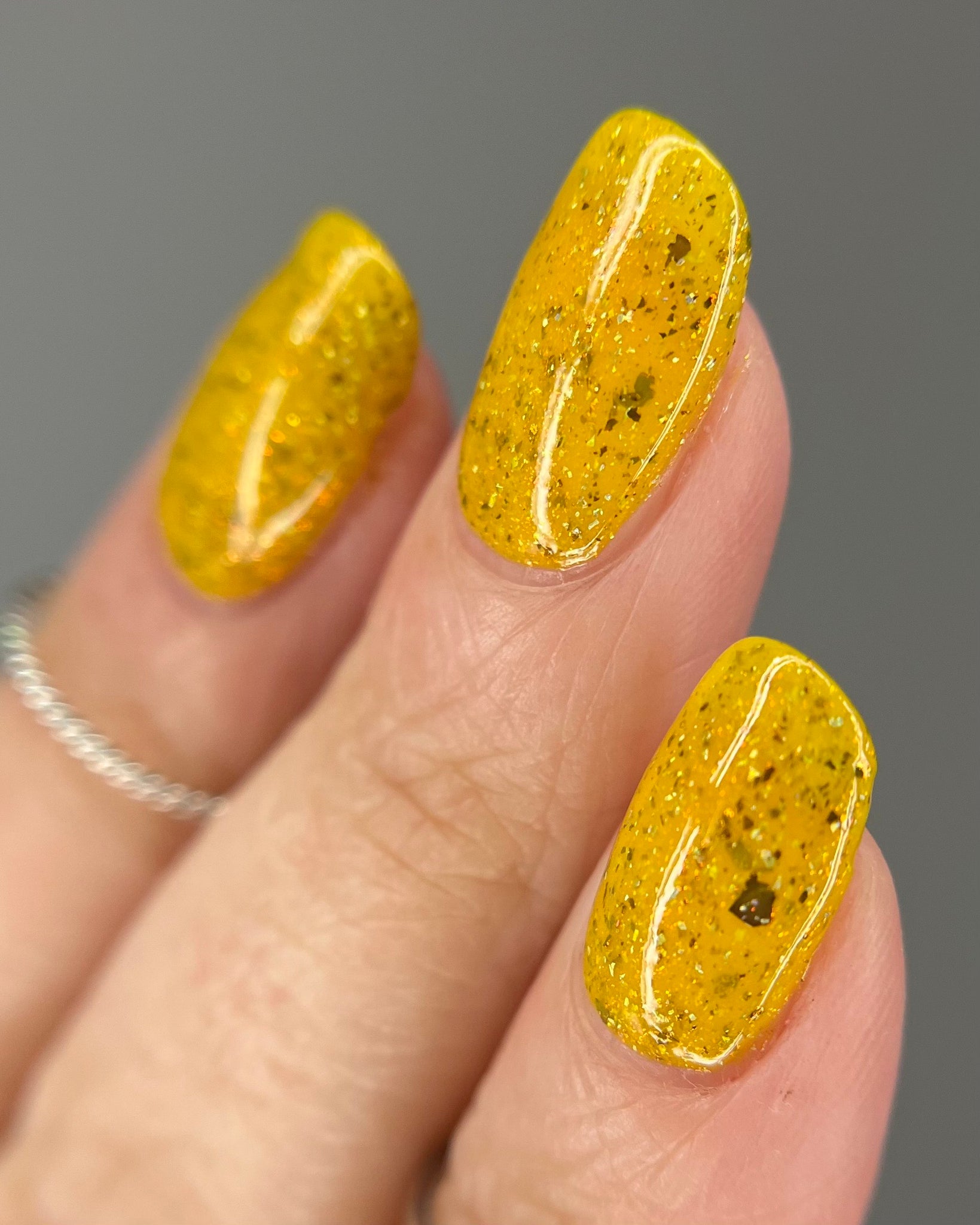 Scintilla Revamped- a mustard yellow base filled with gold to bronze shifting UCC flakies, scattered red to orange shifting shimmer, and scattered holo micro flakies