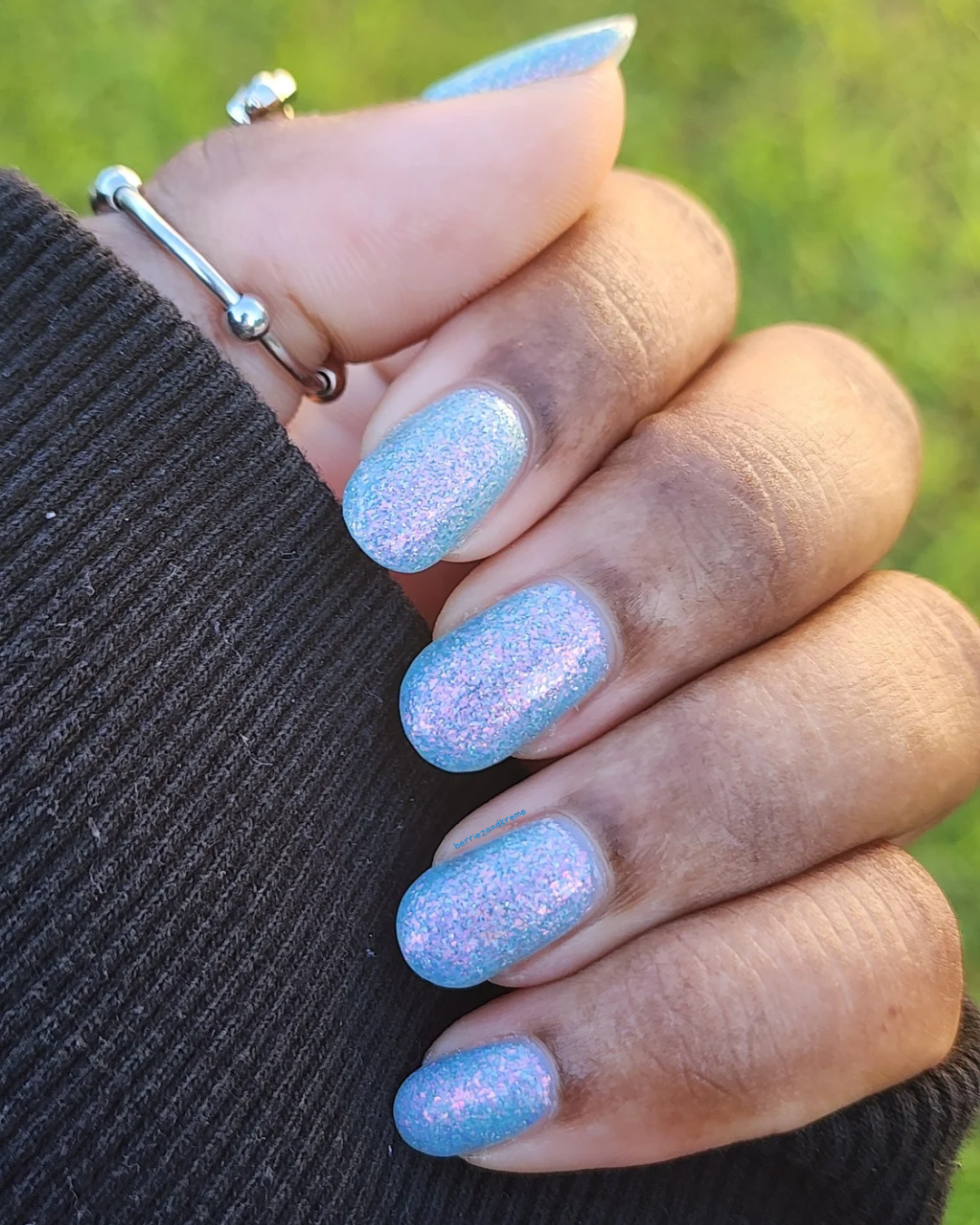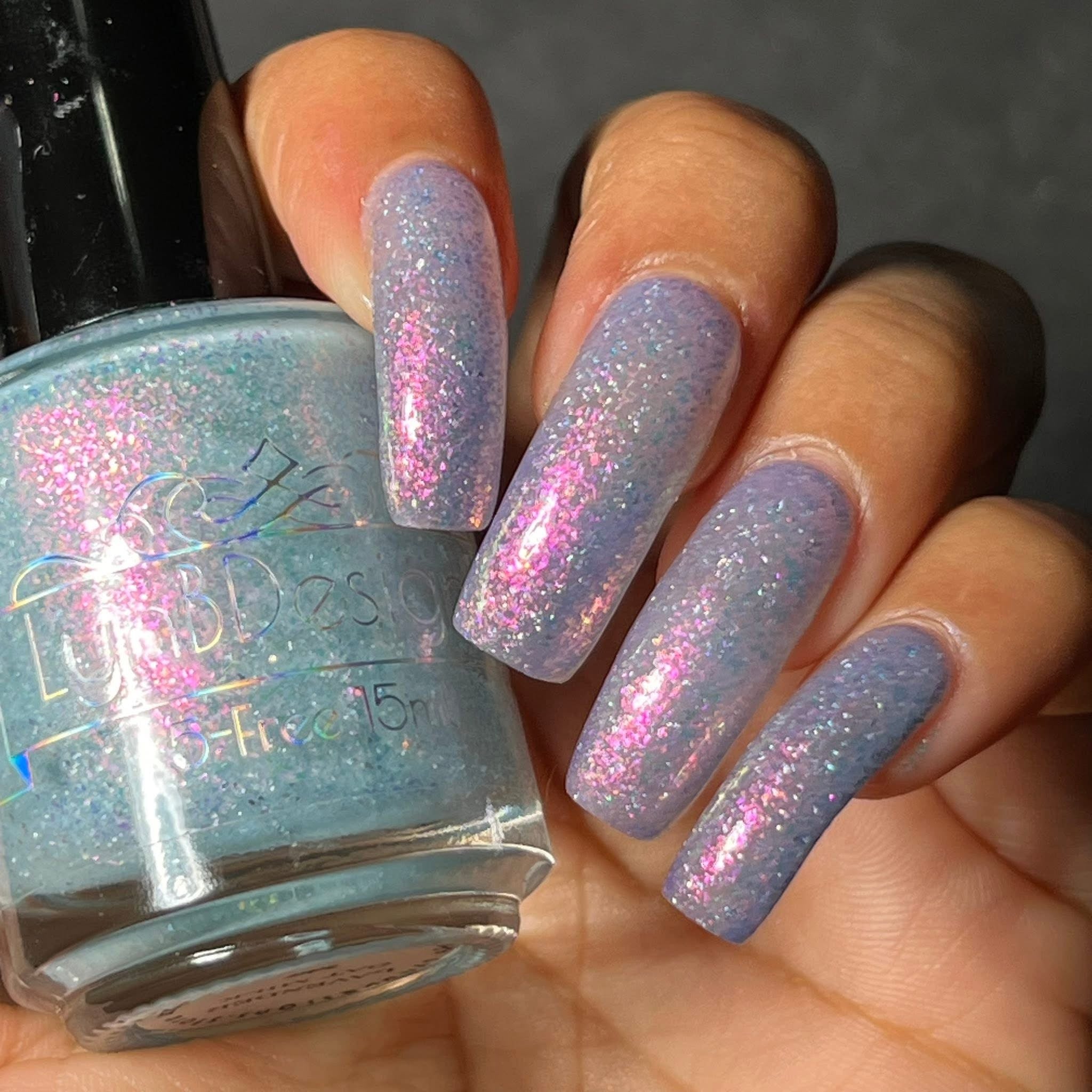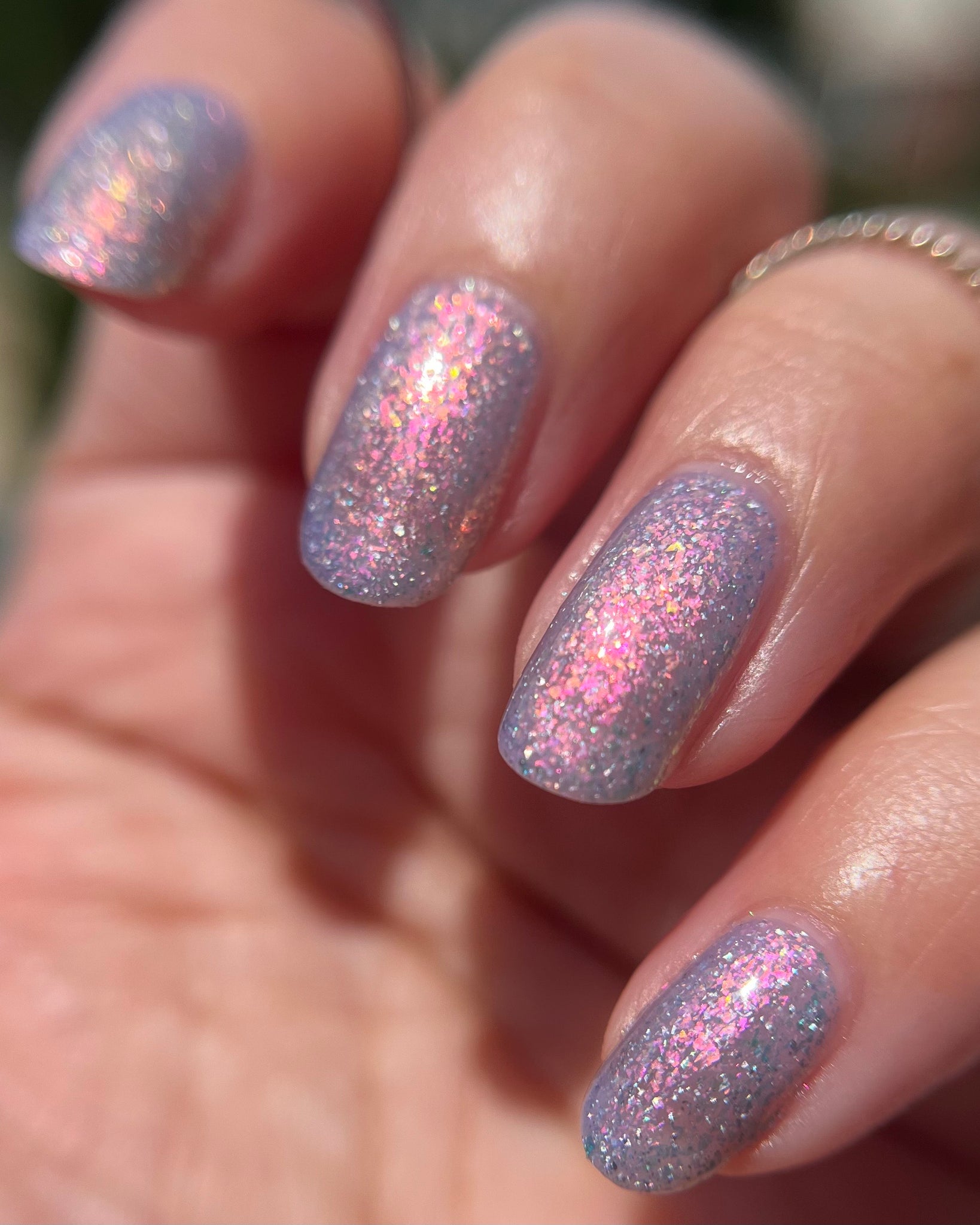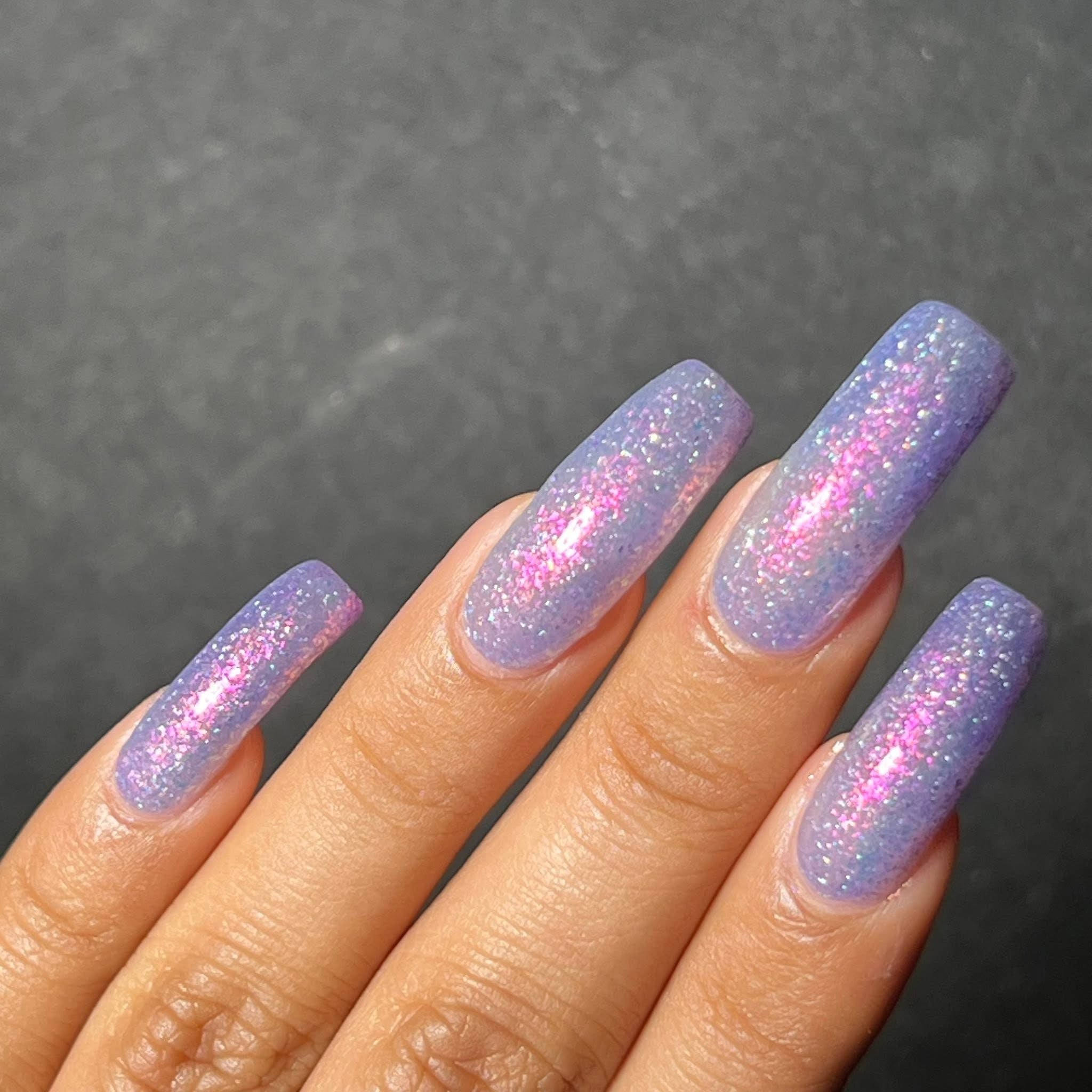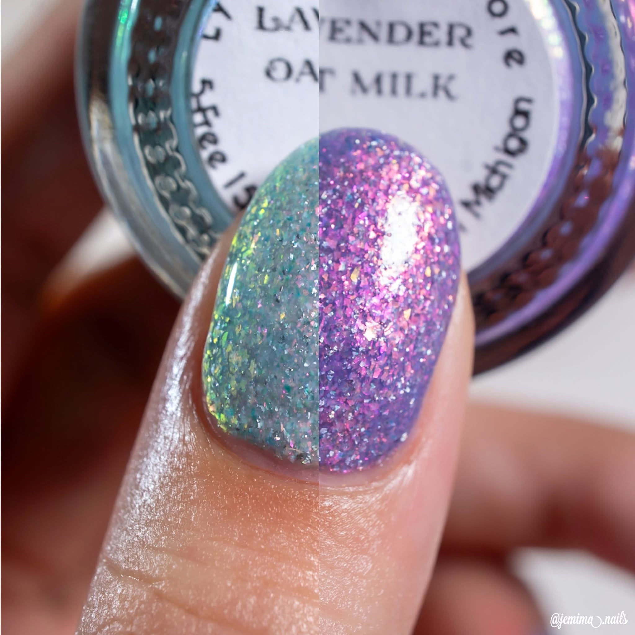 Lavender Oat Milk- a sheer buildable baby blue base with purple to pink shifting micro flakies and purple solar effect