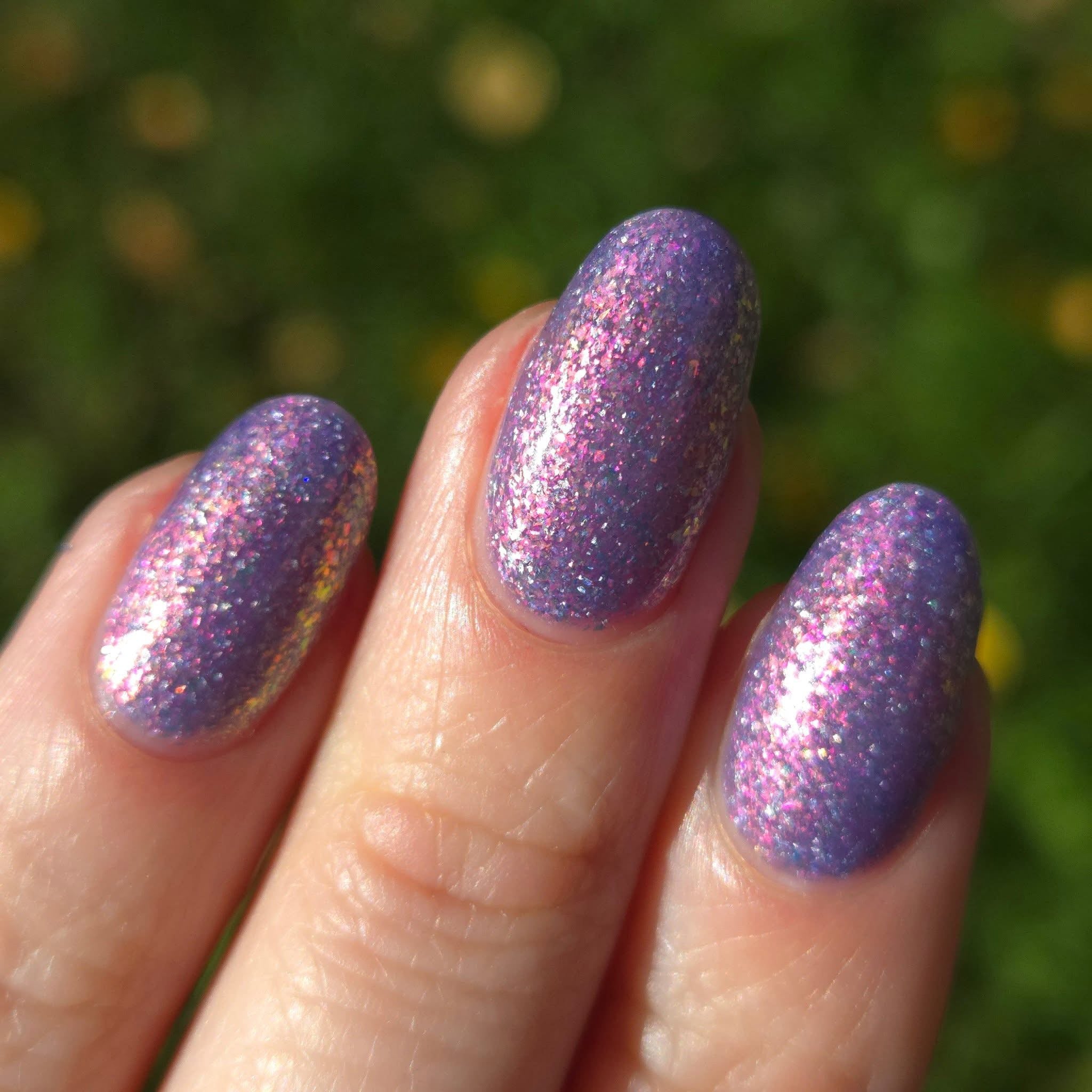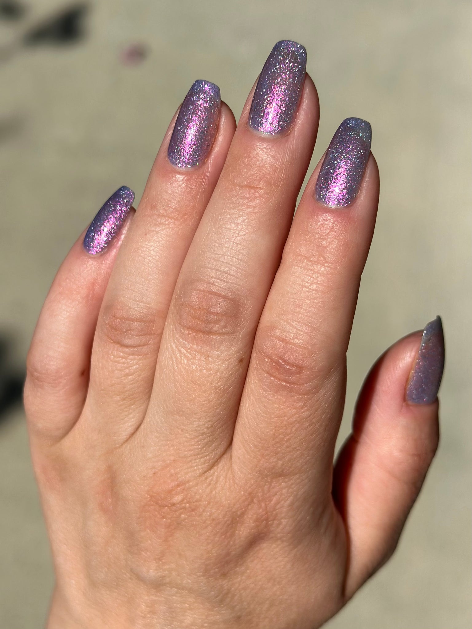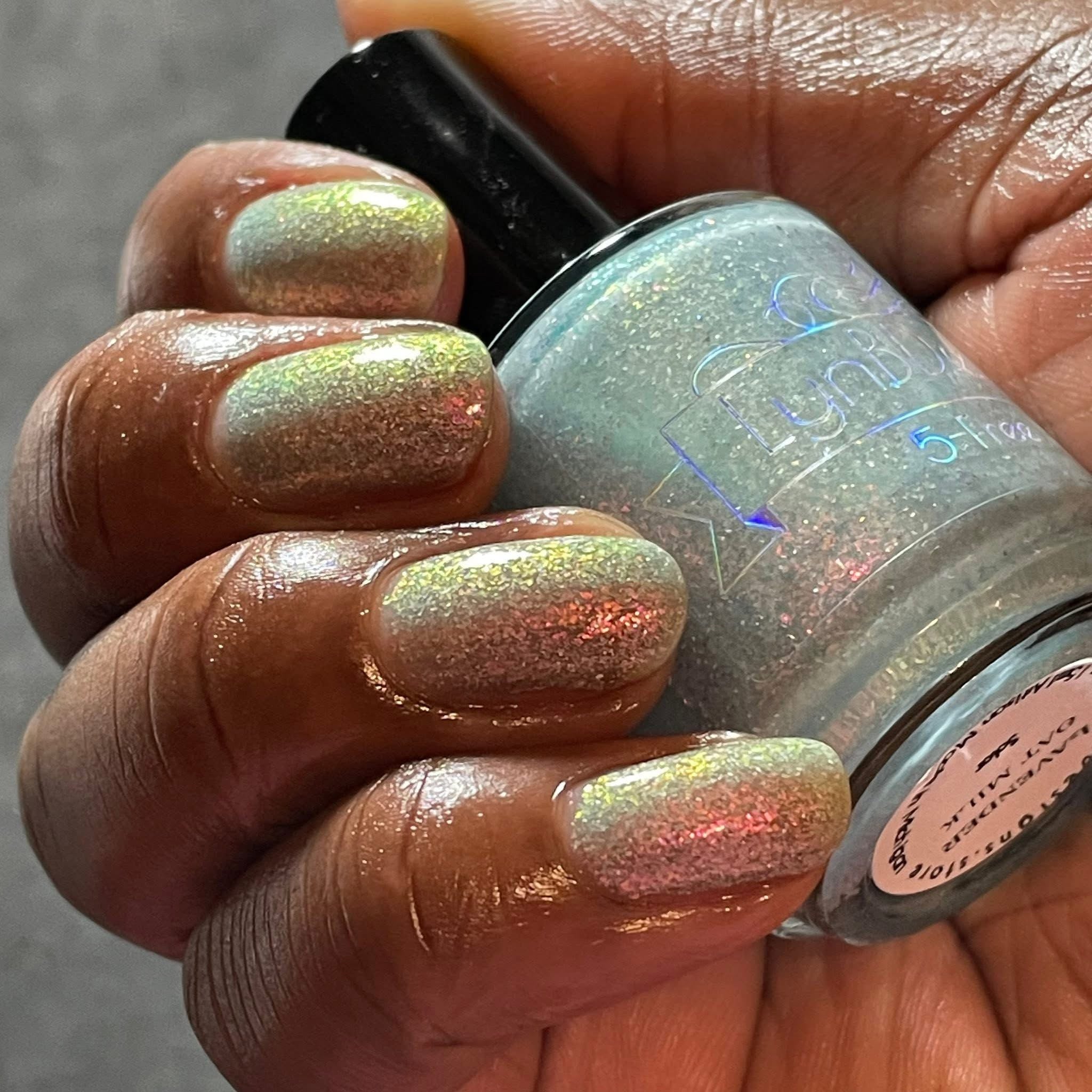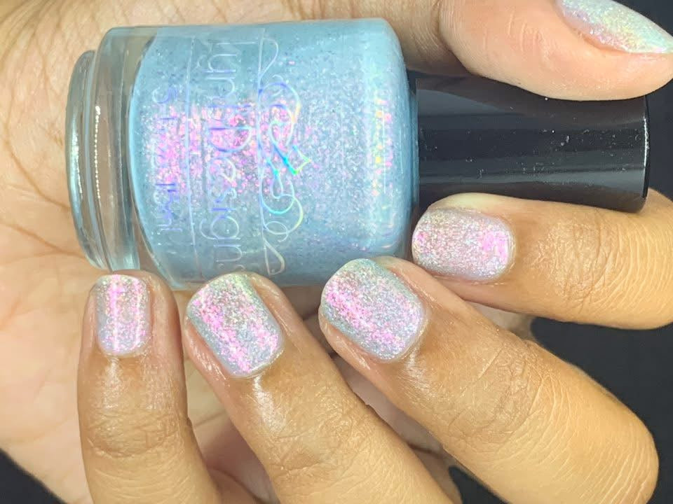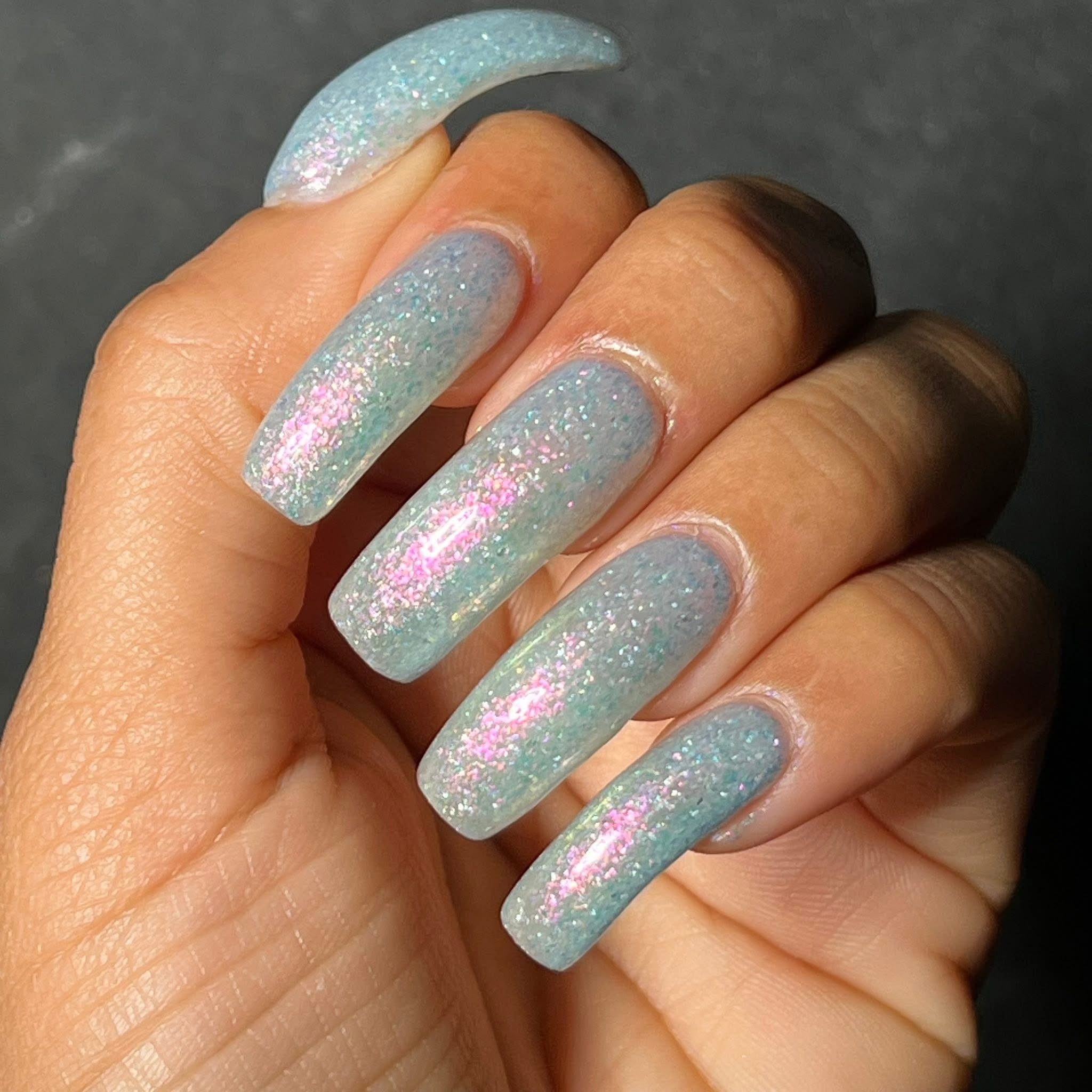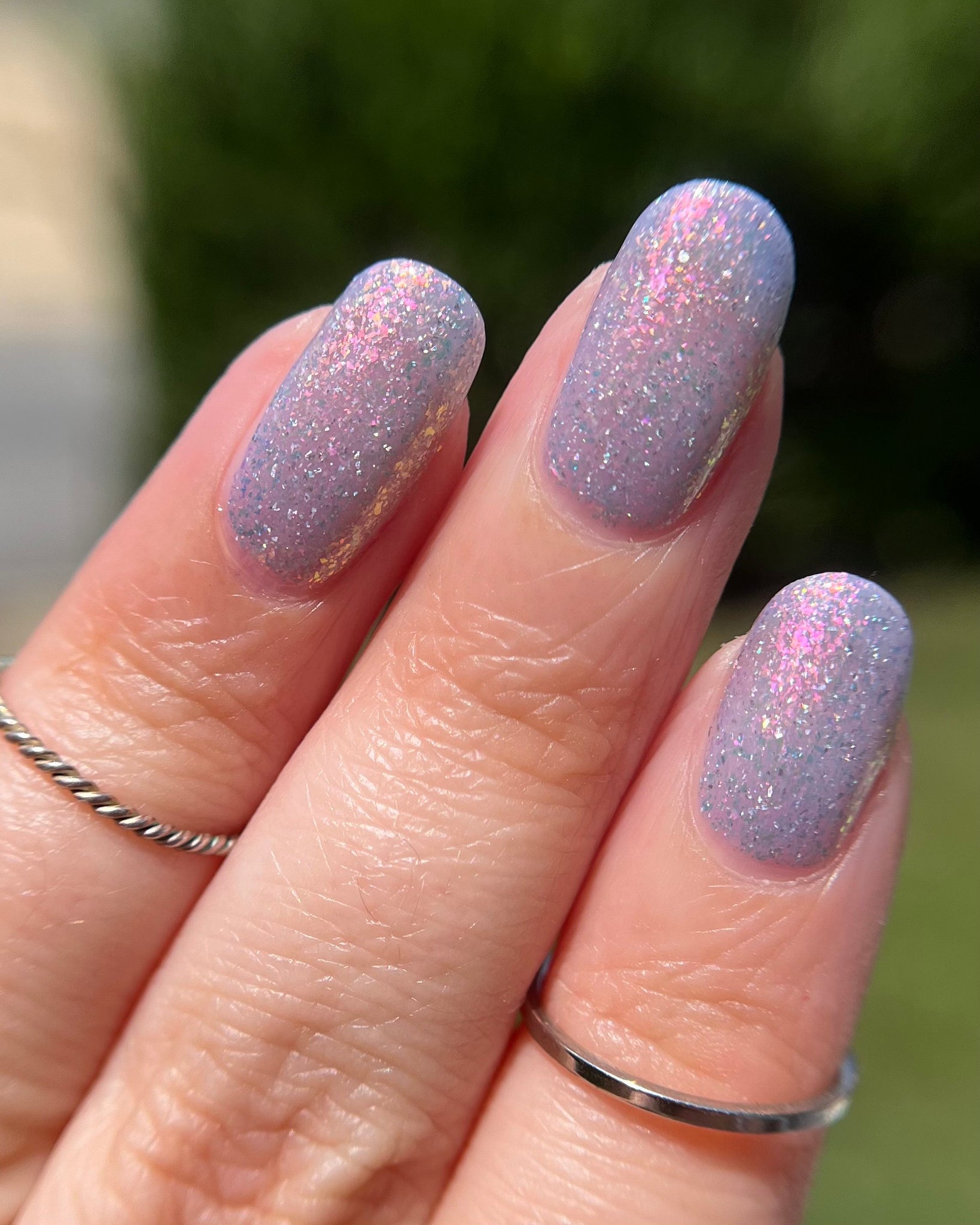 Lavender Oat Milk- a sheer buildable baby blue base with purple to pink shifting micro flakies and purple solar effect