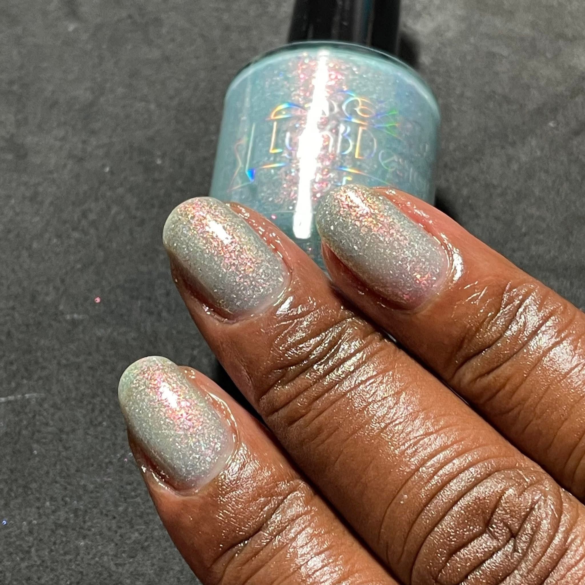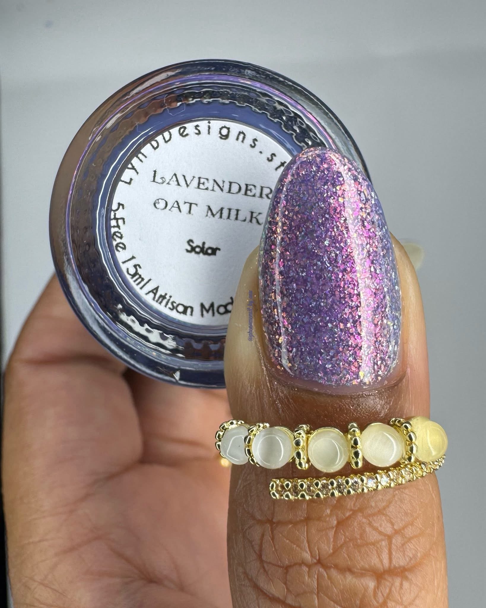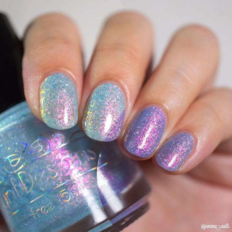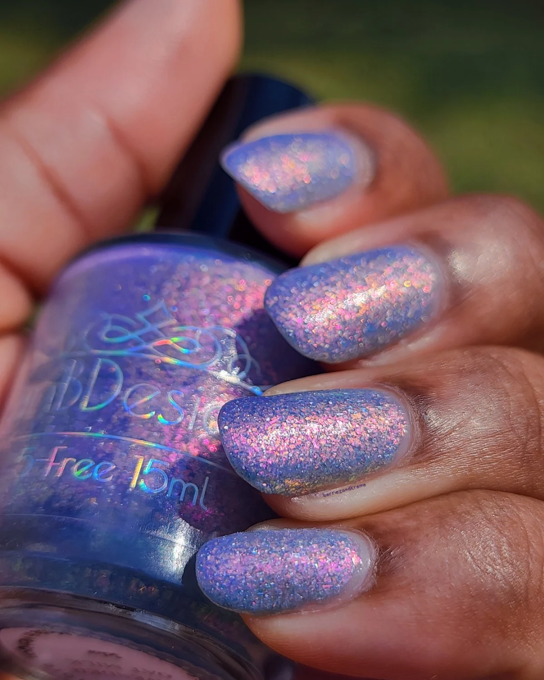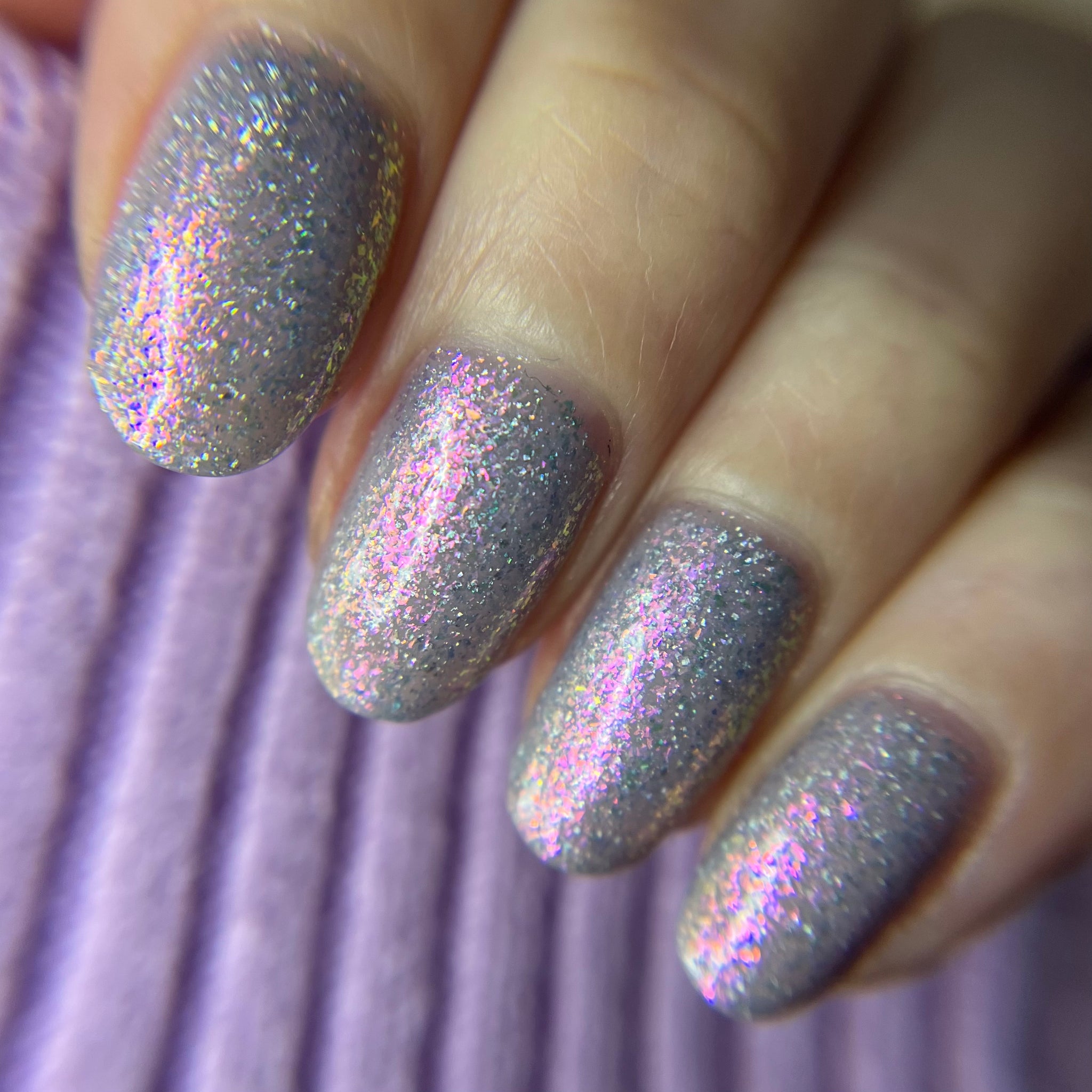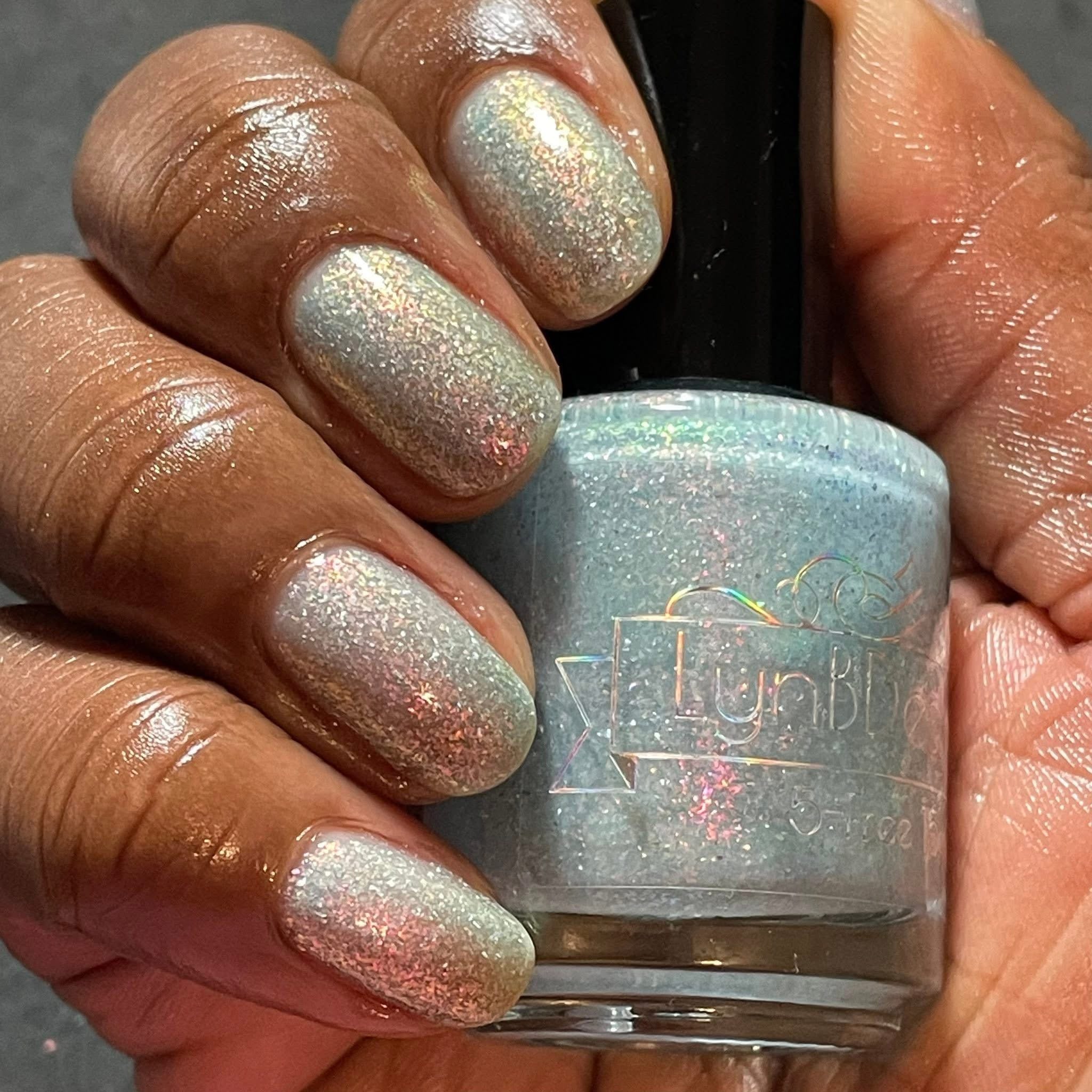 Lavender Oat Milk- a sheer buildable baby blue base with purple to pink shifting micro flakies and purple solar effect