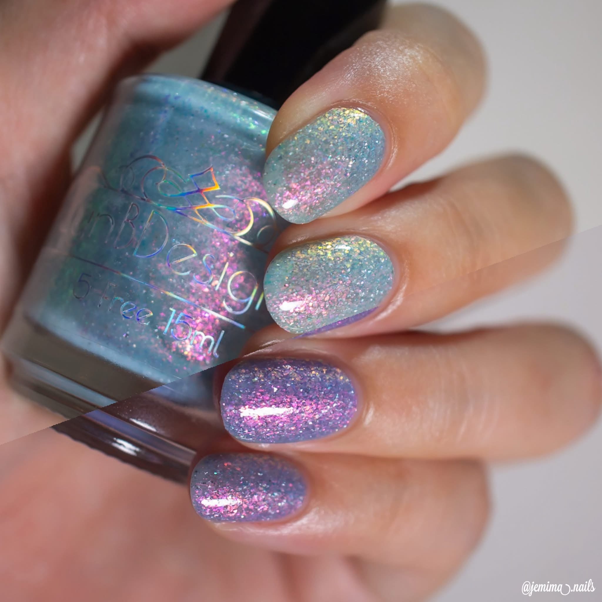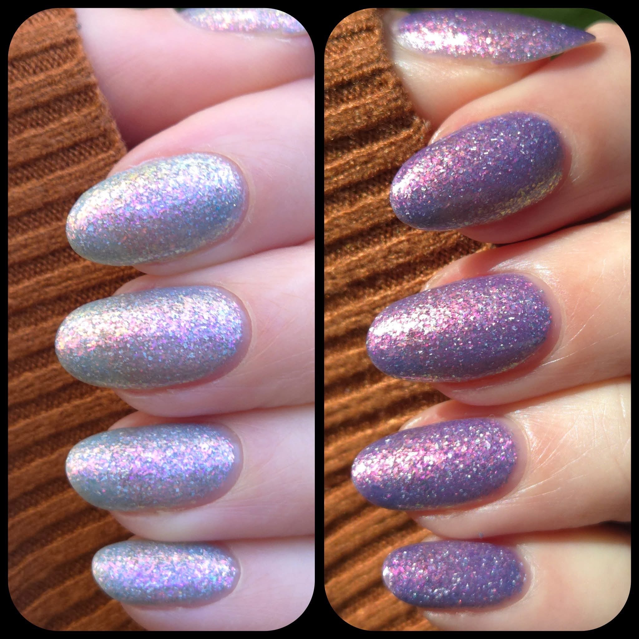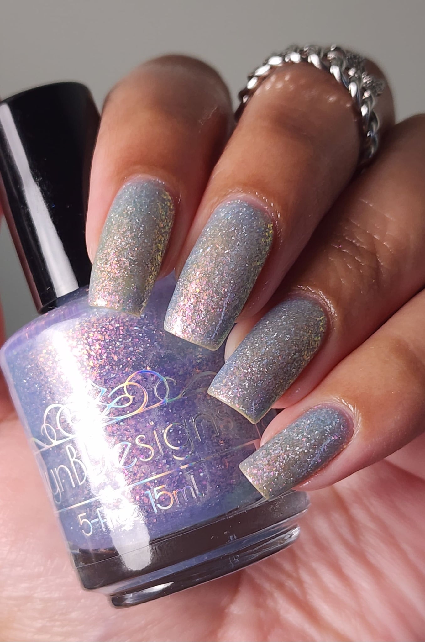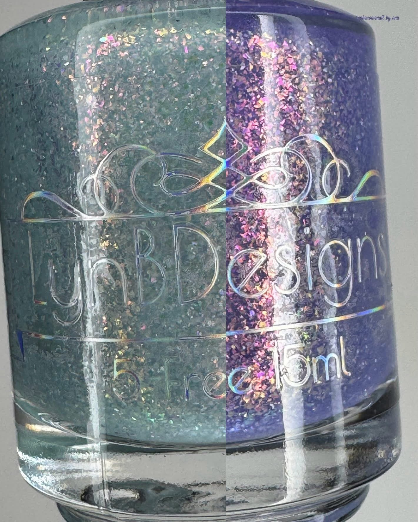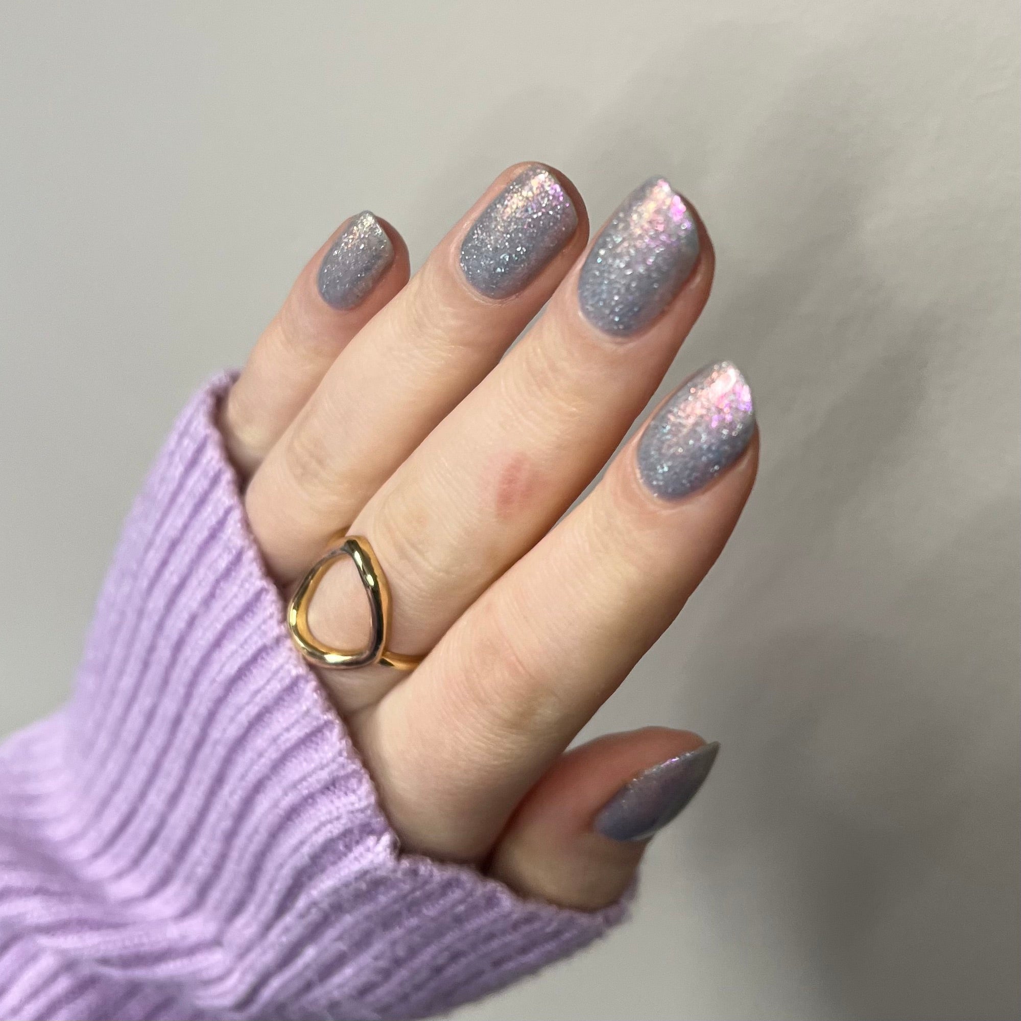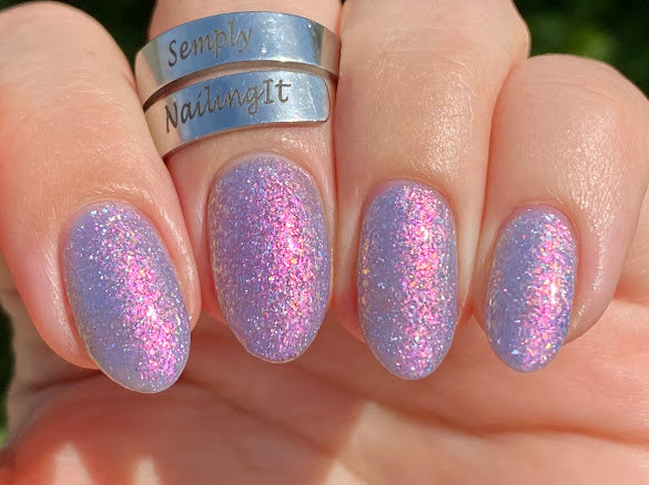 Lavender Oat Milk- a sheer buildable baby blue base with purple to pink shifting micro flakies and purple solar effect