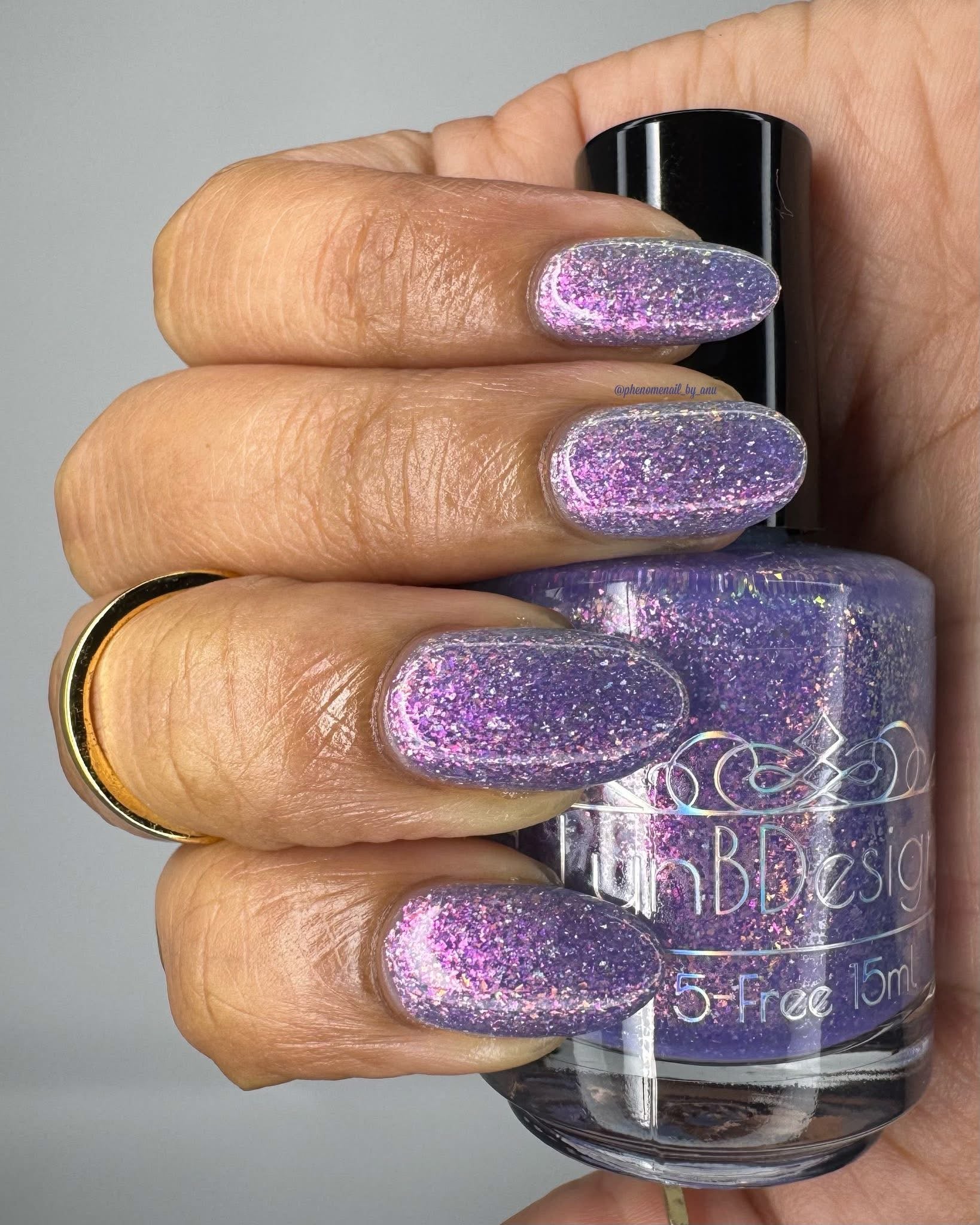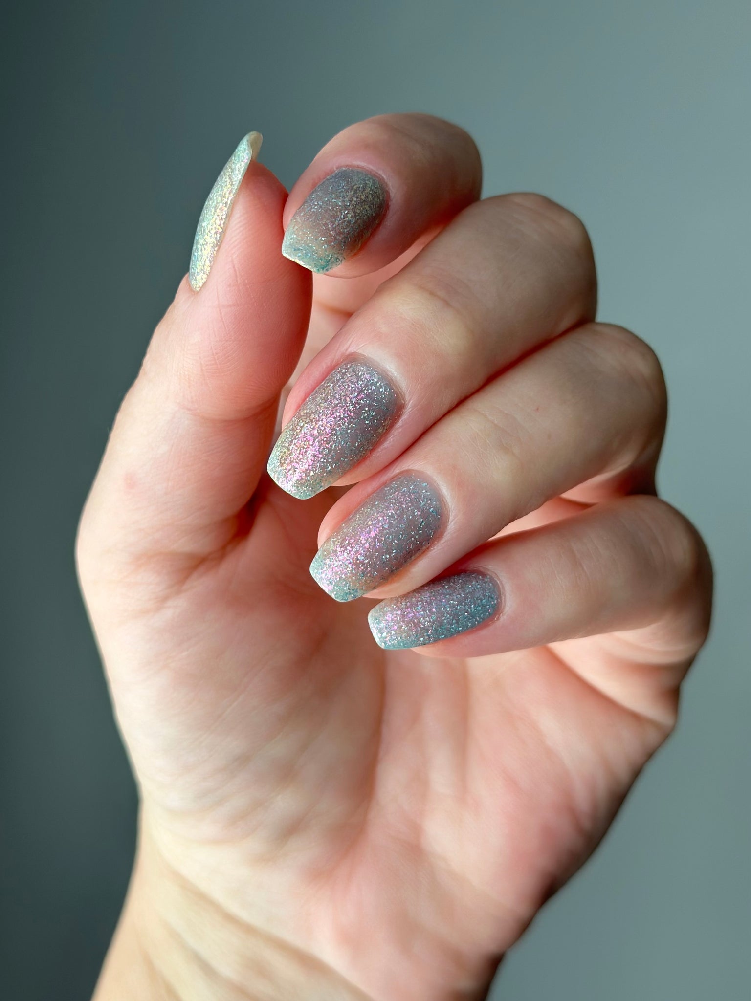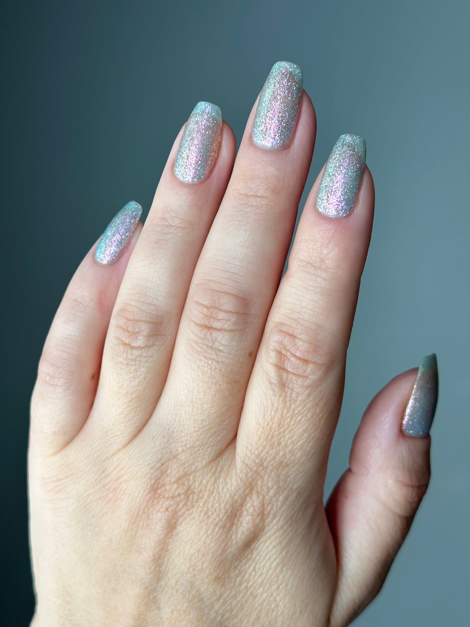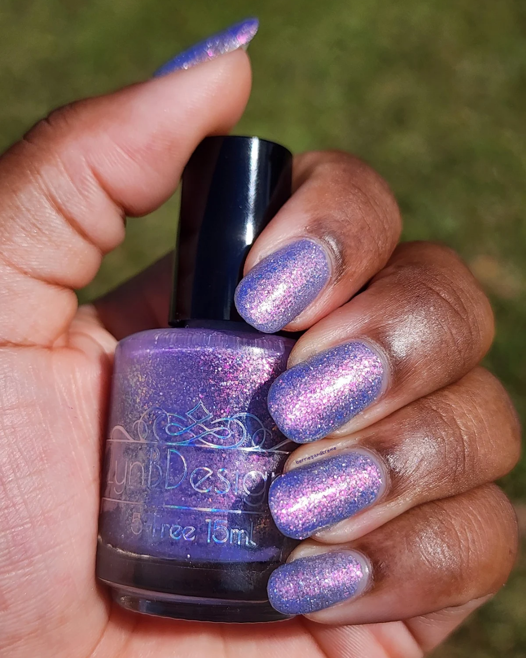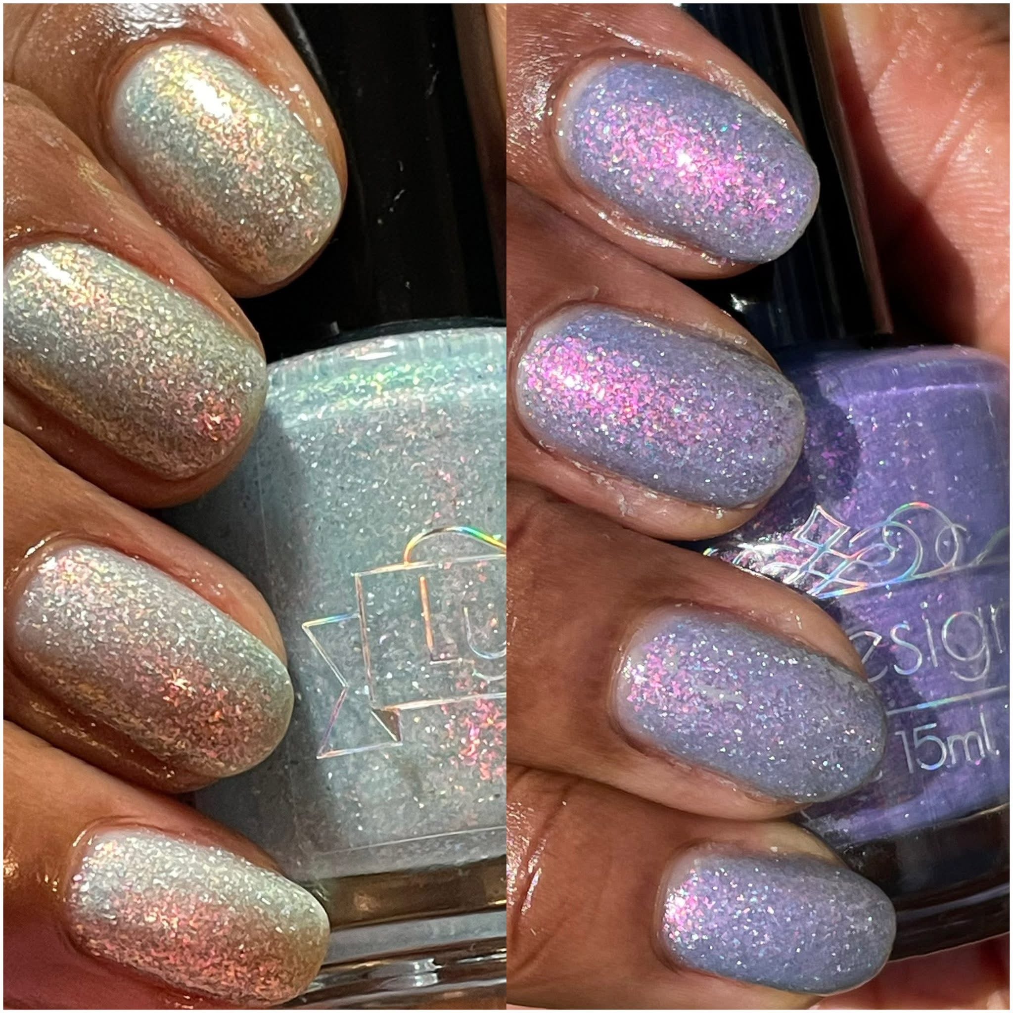 Lavender Oat Milk- a sheer buildable baby blue base with purple to pink shifting micro flakies and purple solar effect