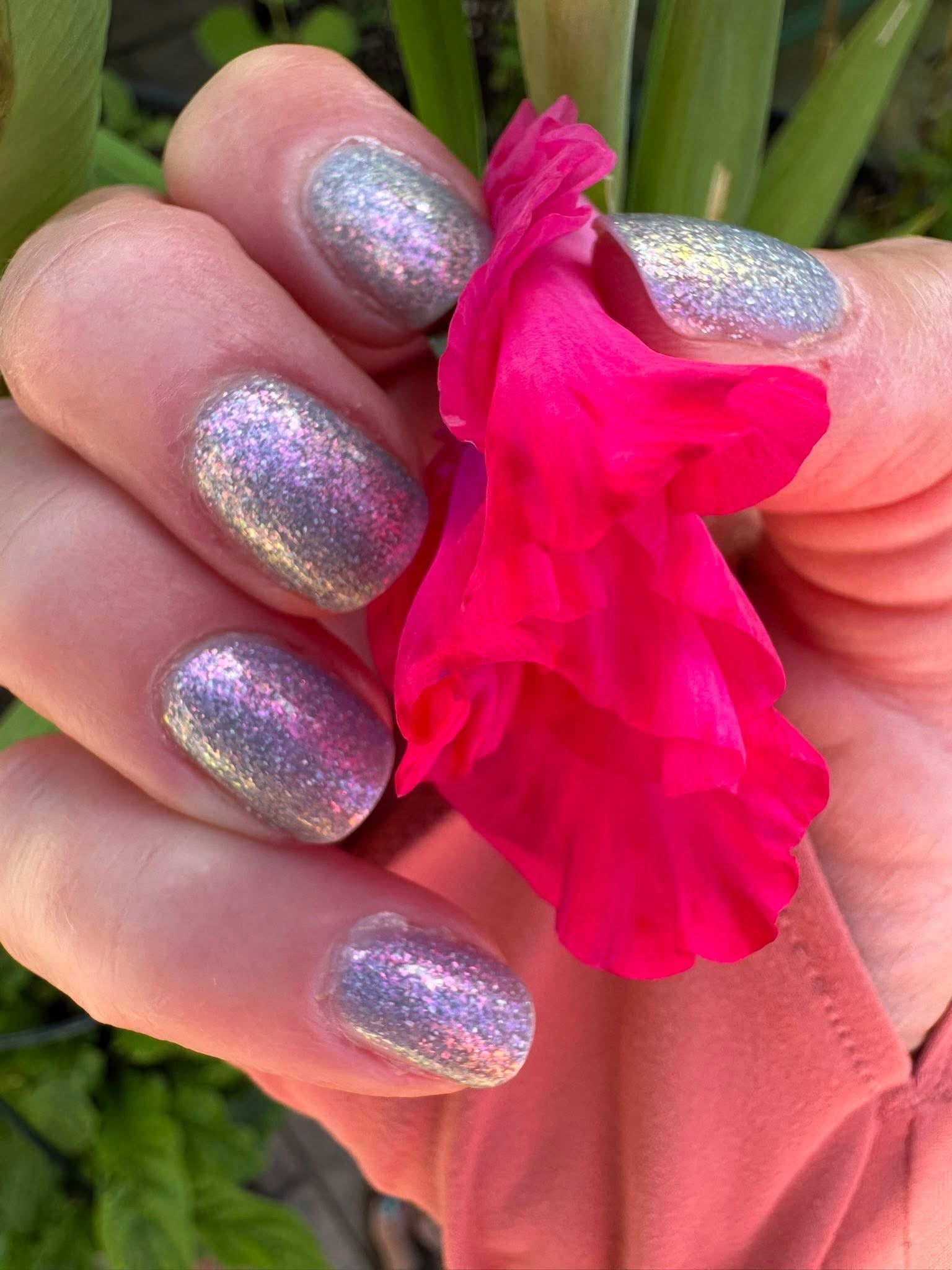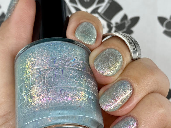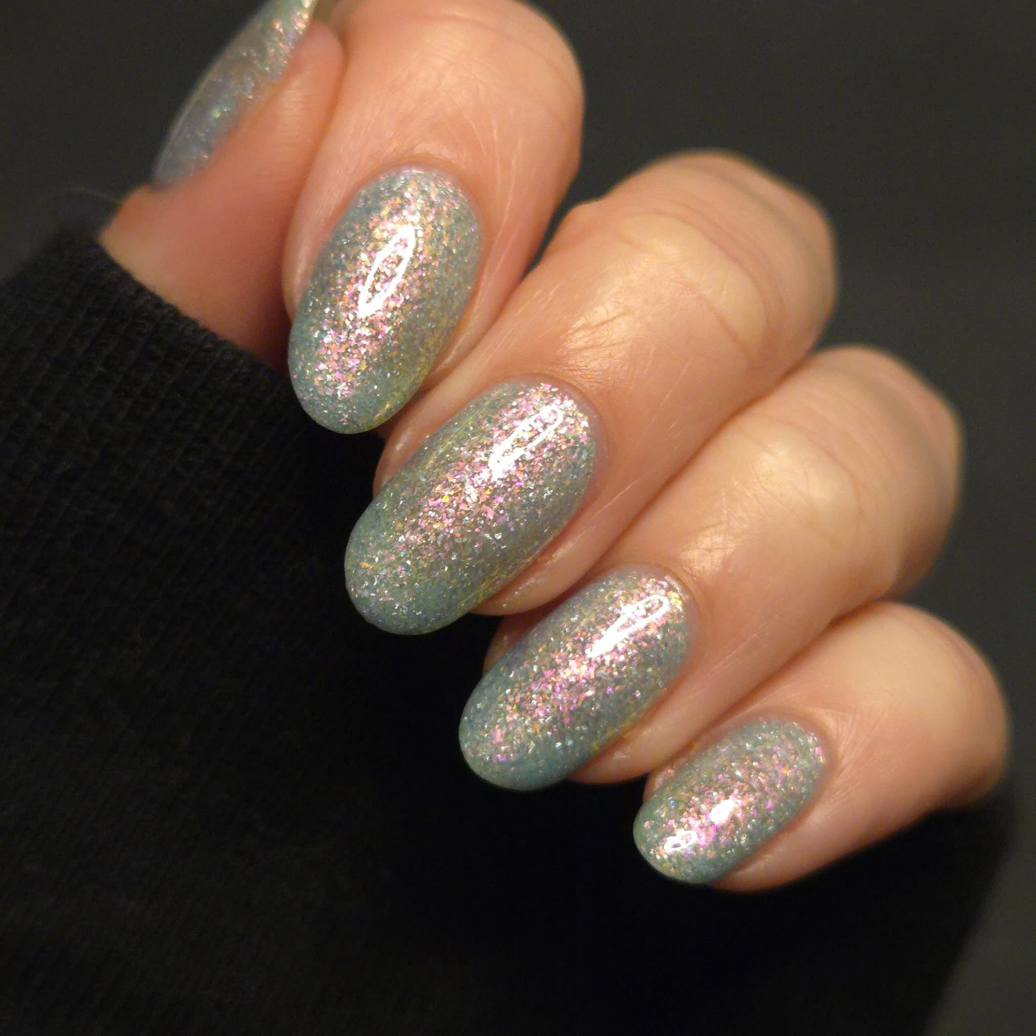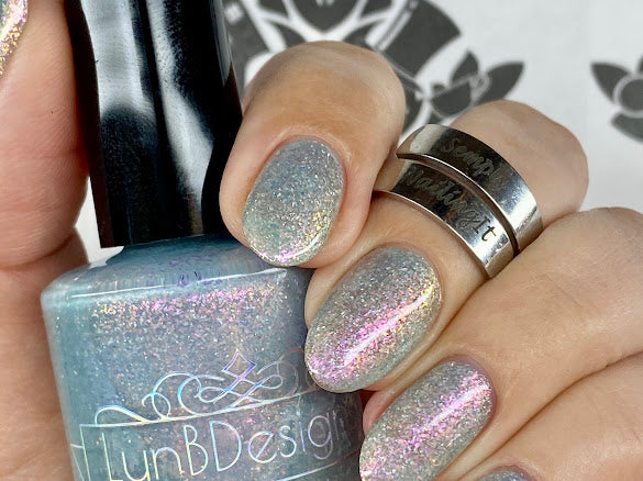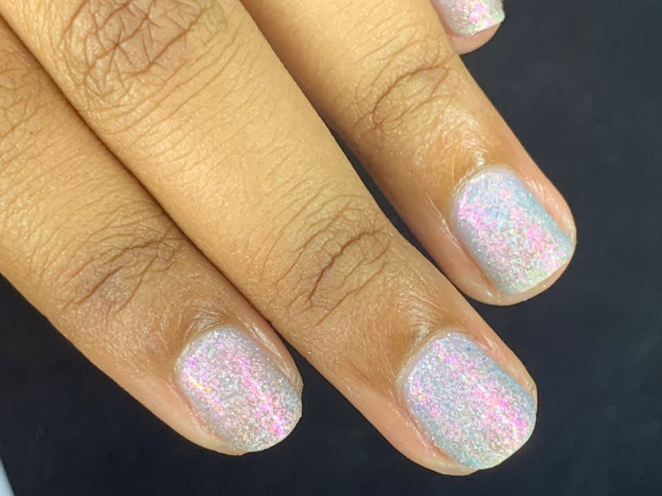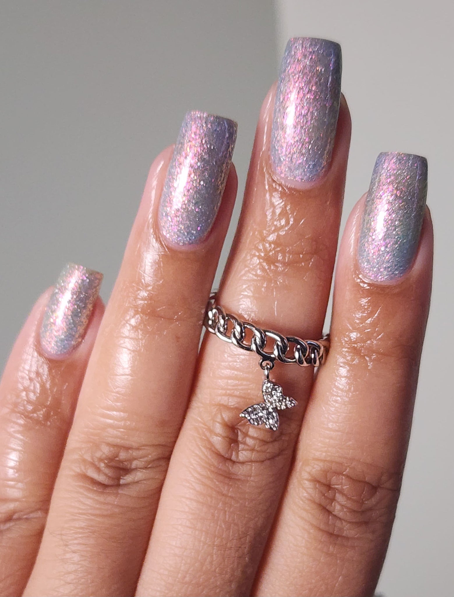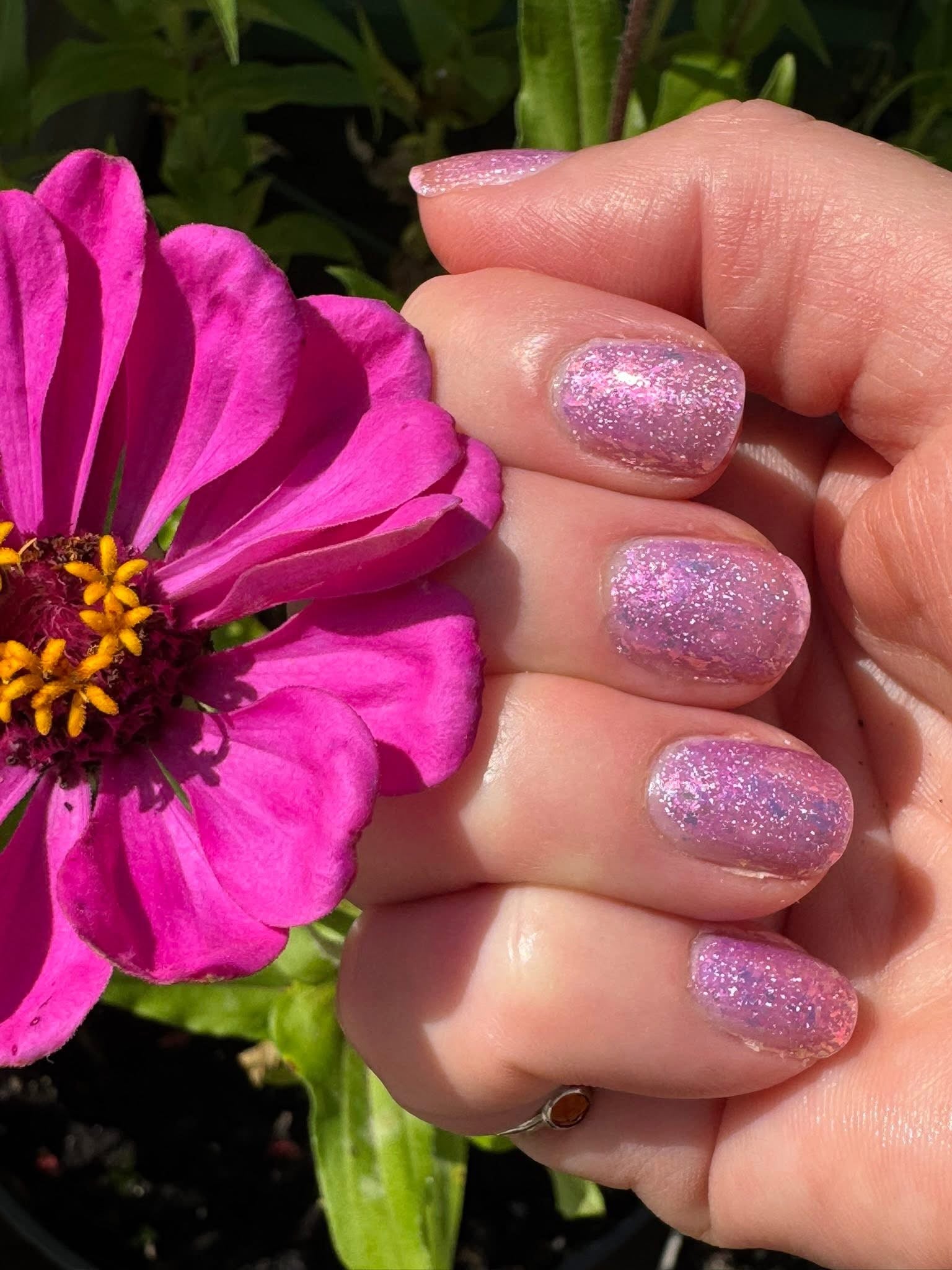 Lavender Oat Milk- a sheer buildable baby blue base with purple to pink shifting micro flakies and purple solar effect