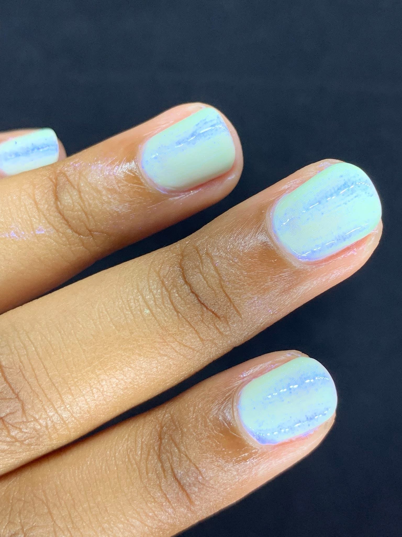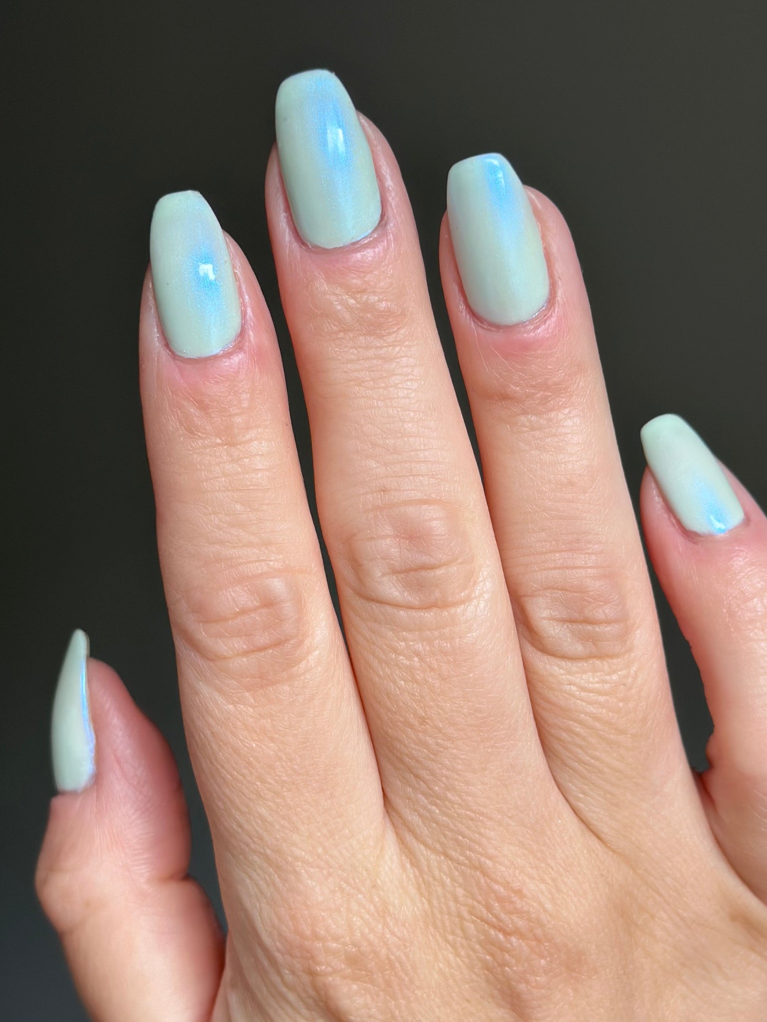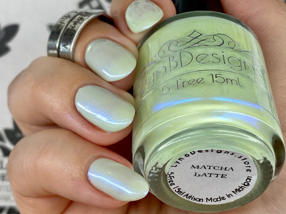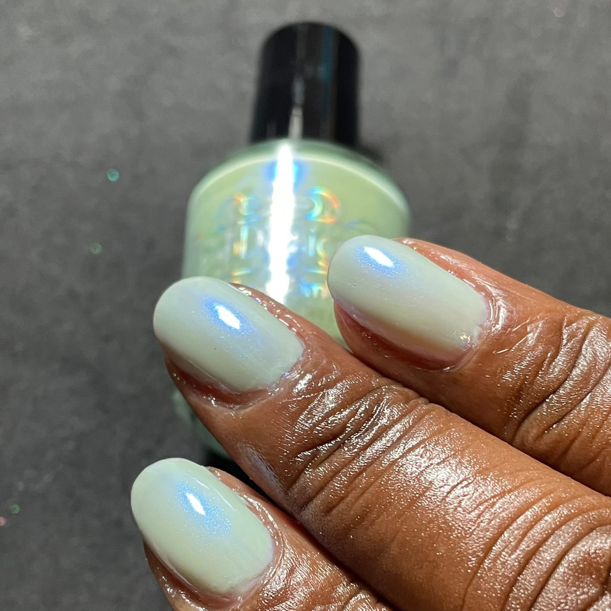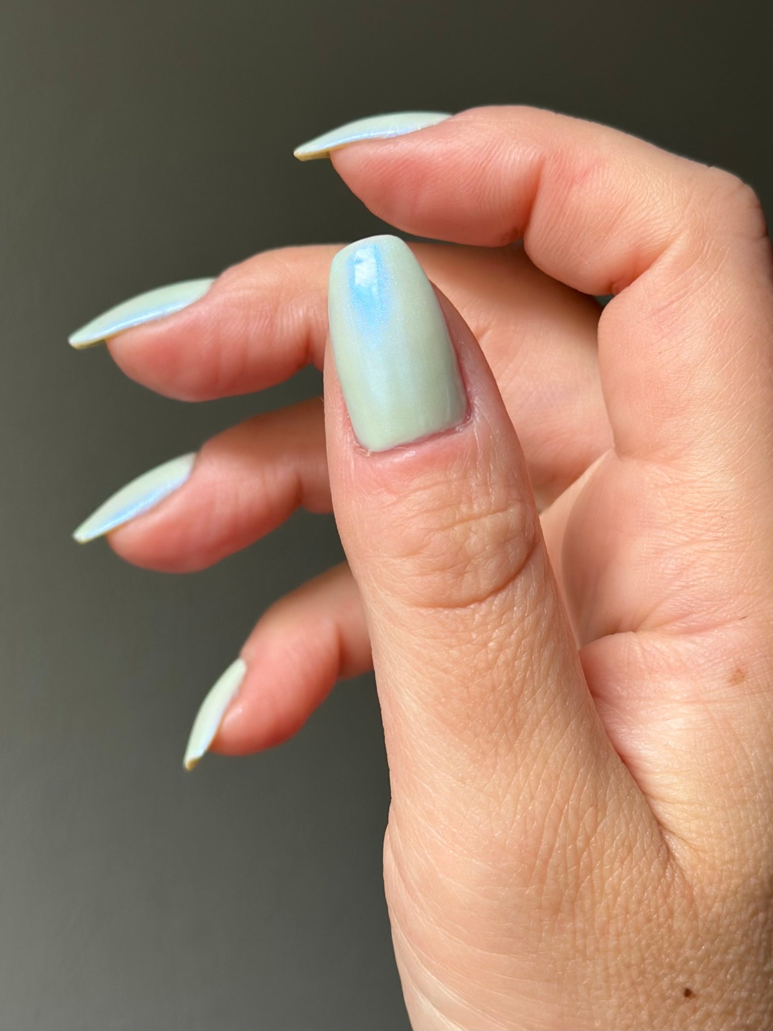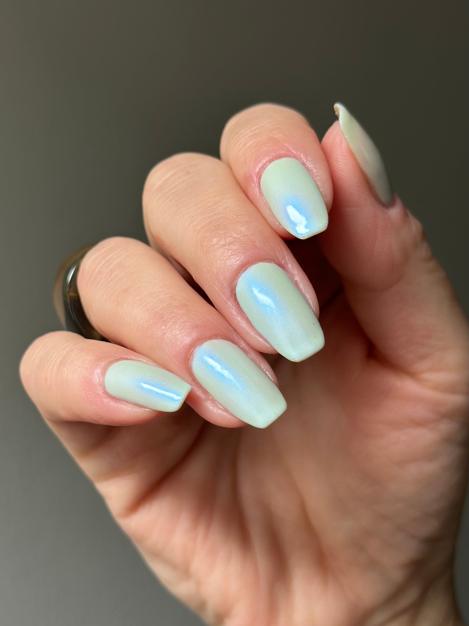 Matcha Latte- creamy pastel green base with blue to indigo shifting shimmer