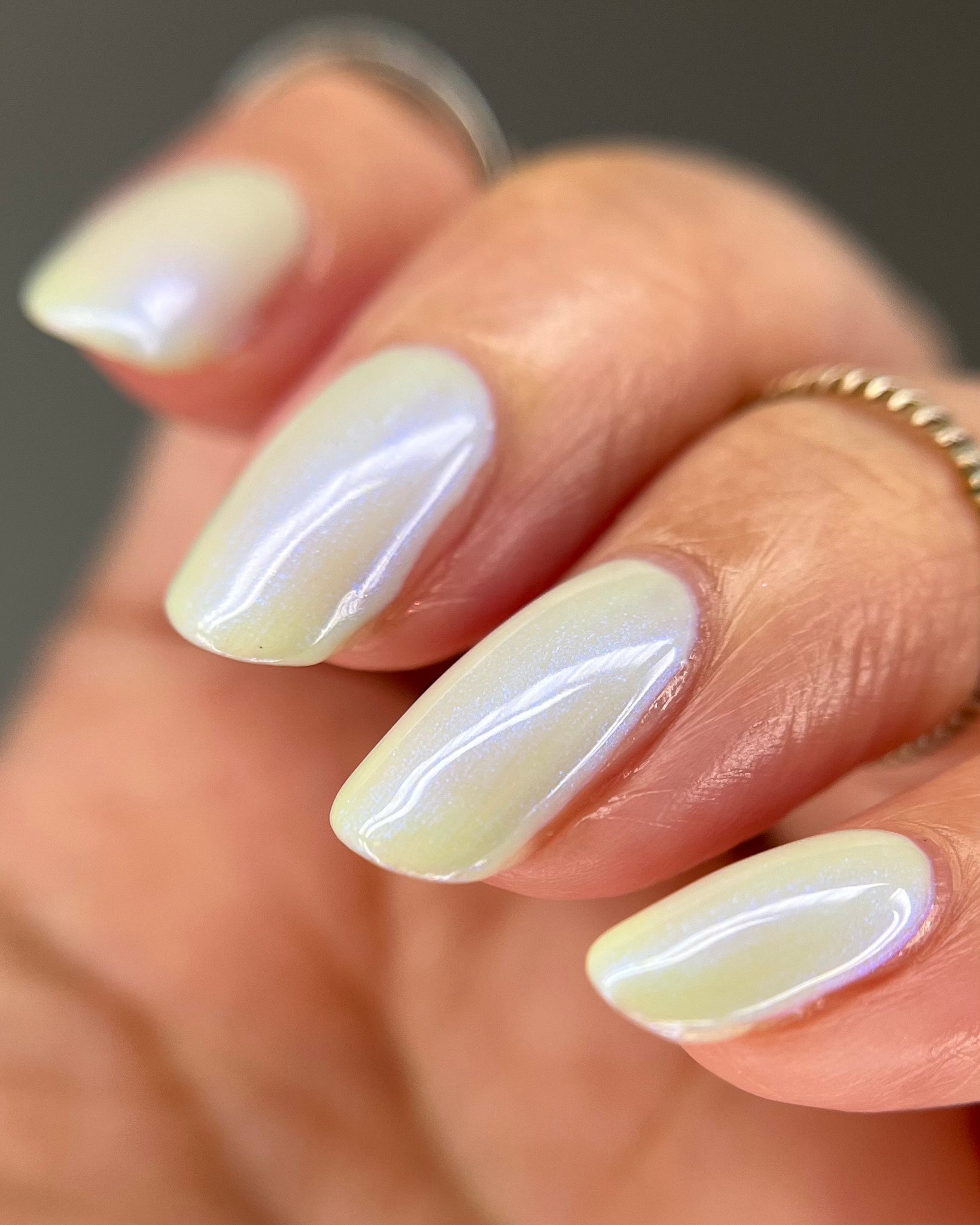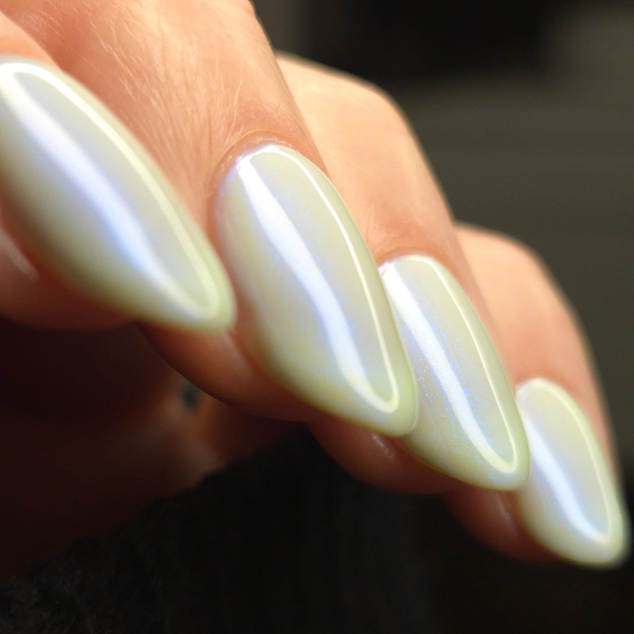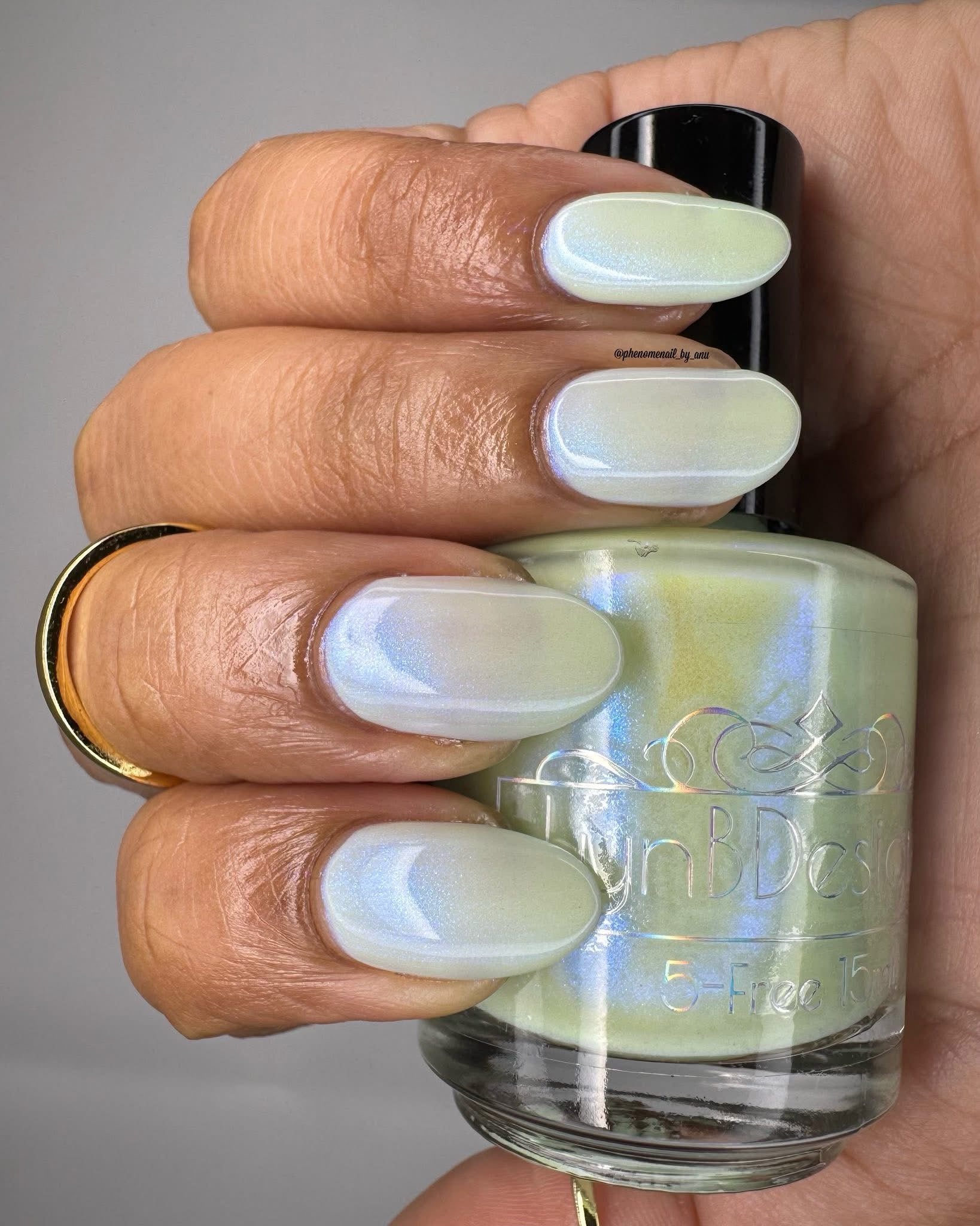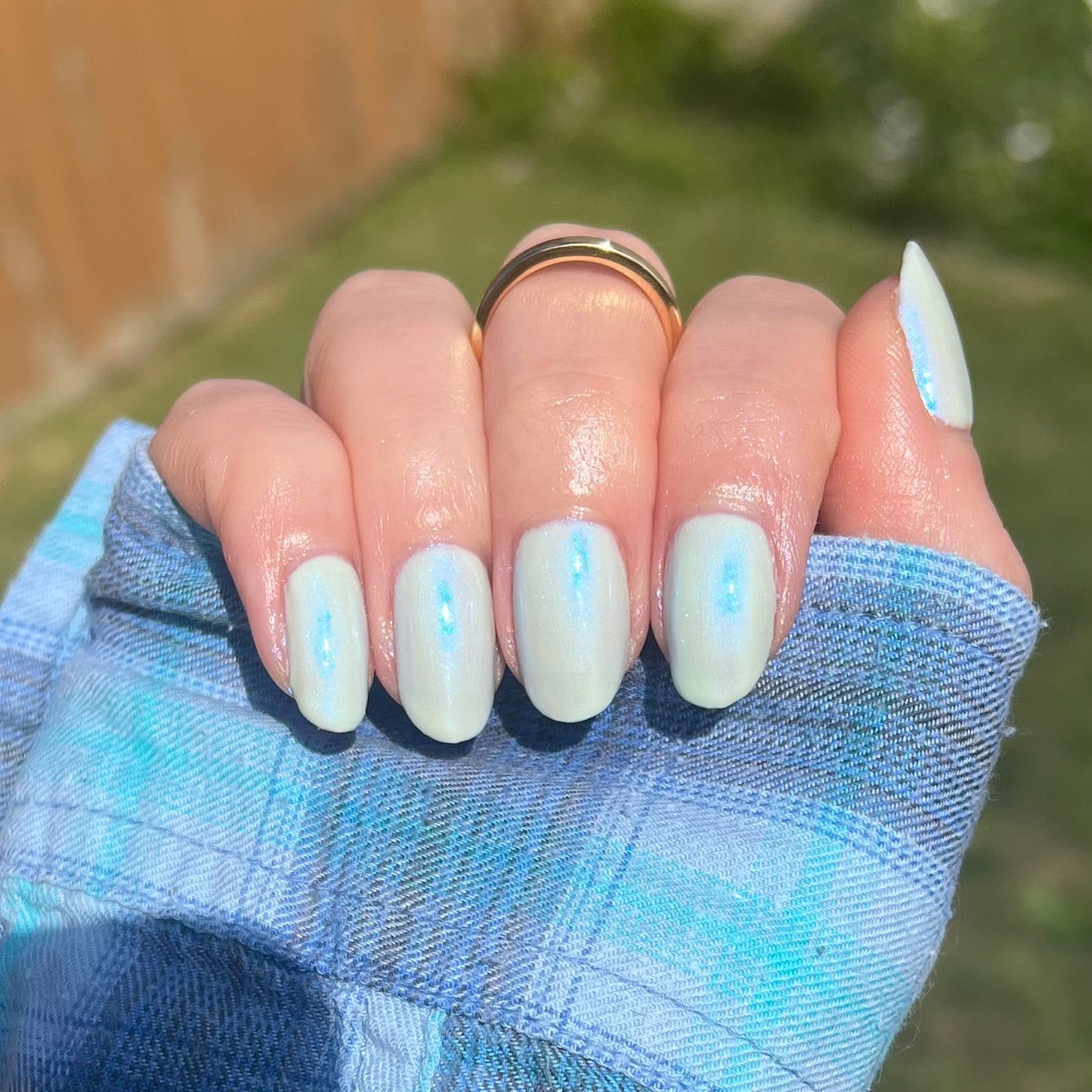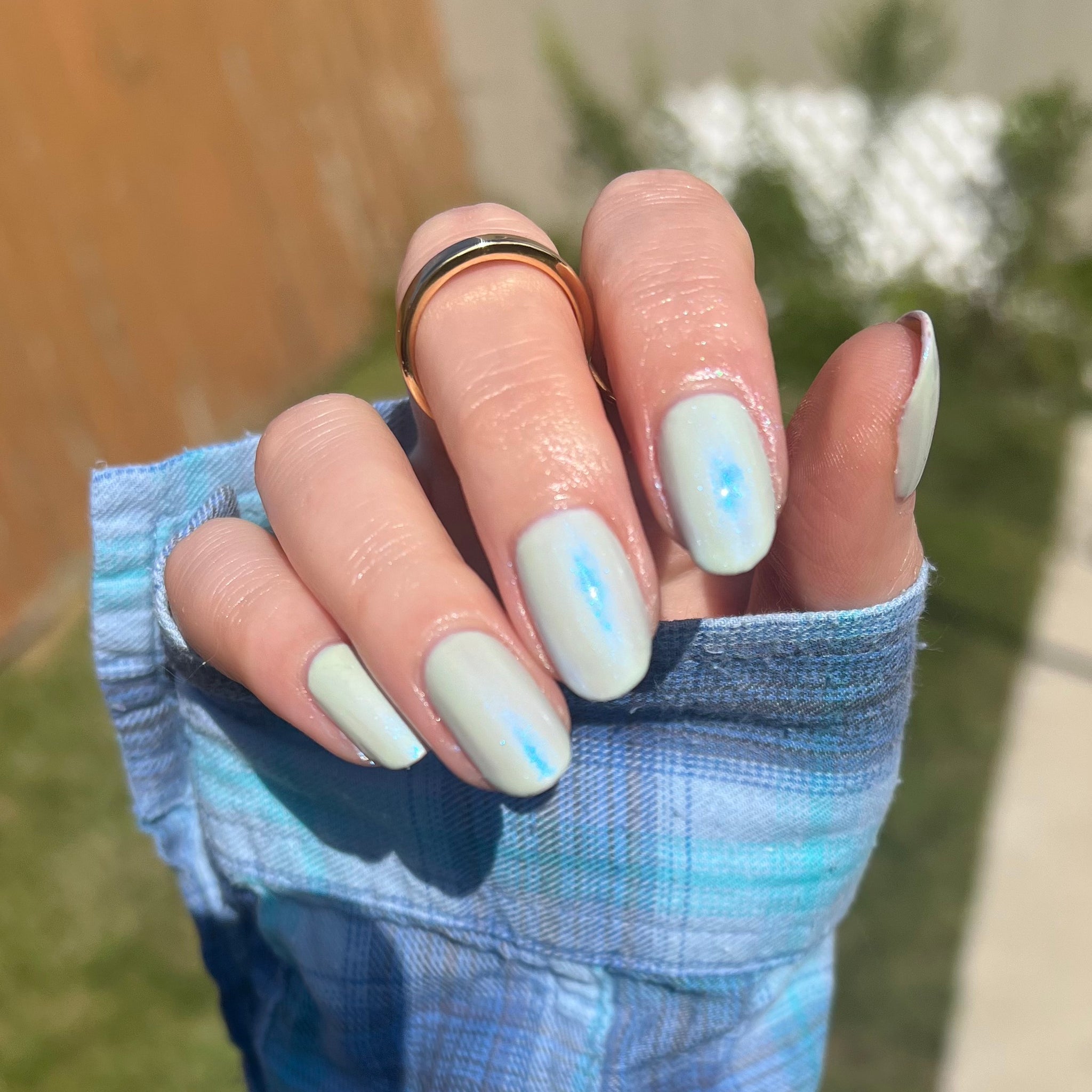 Matcha Latte- creamy pastel green base with blue to indigo shifting shimmer