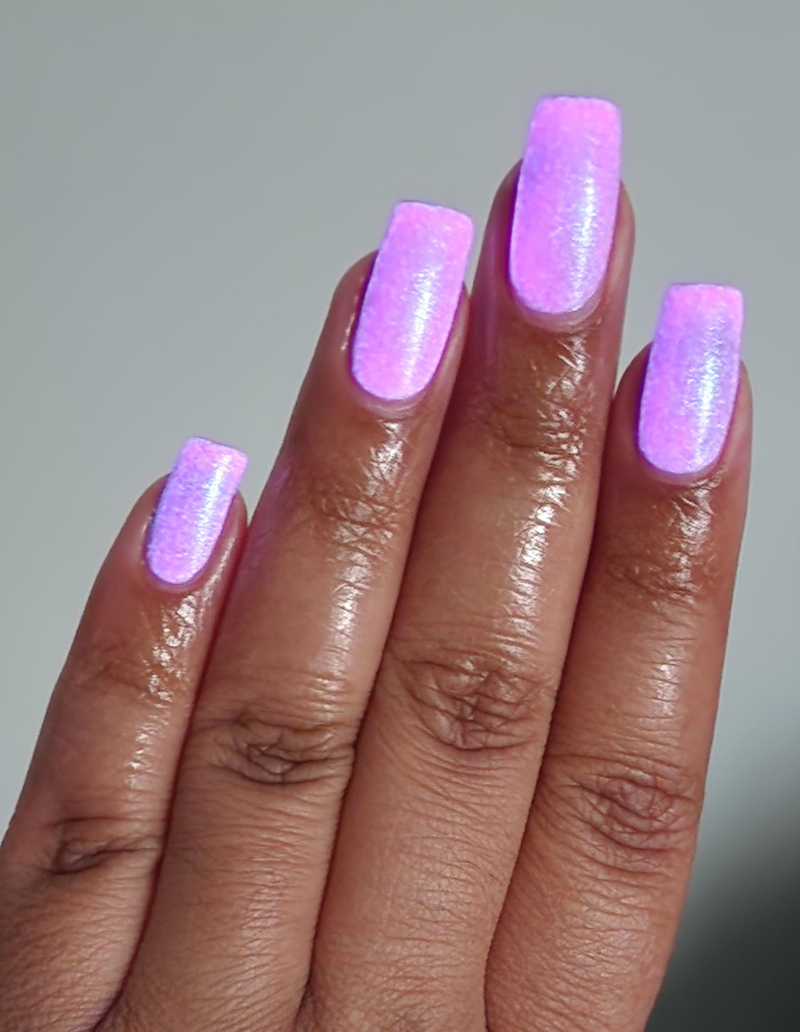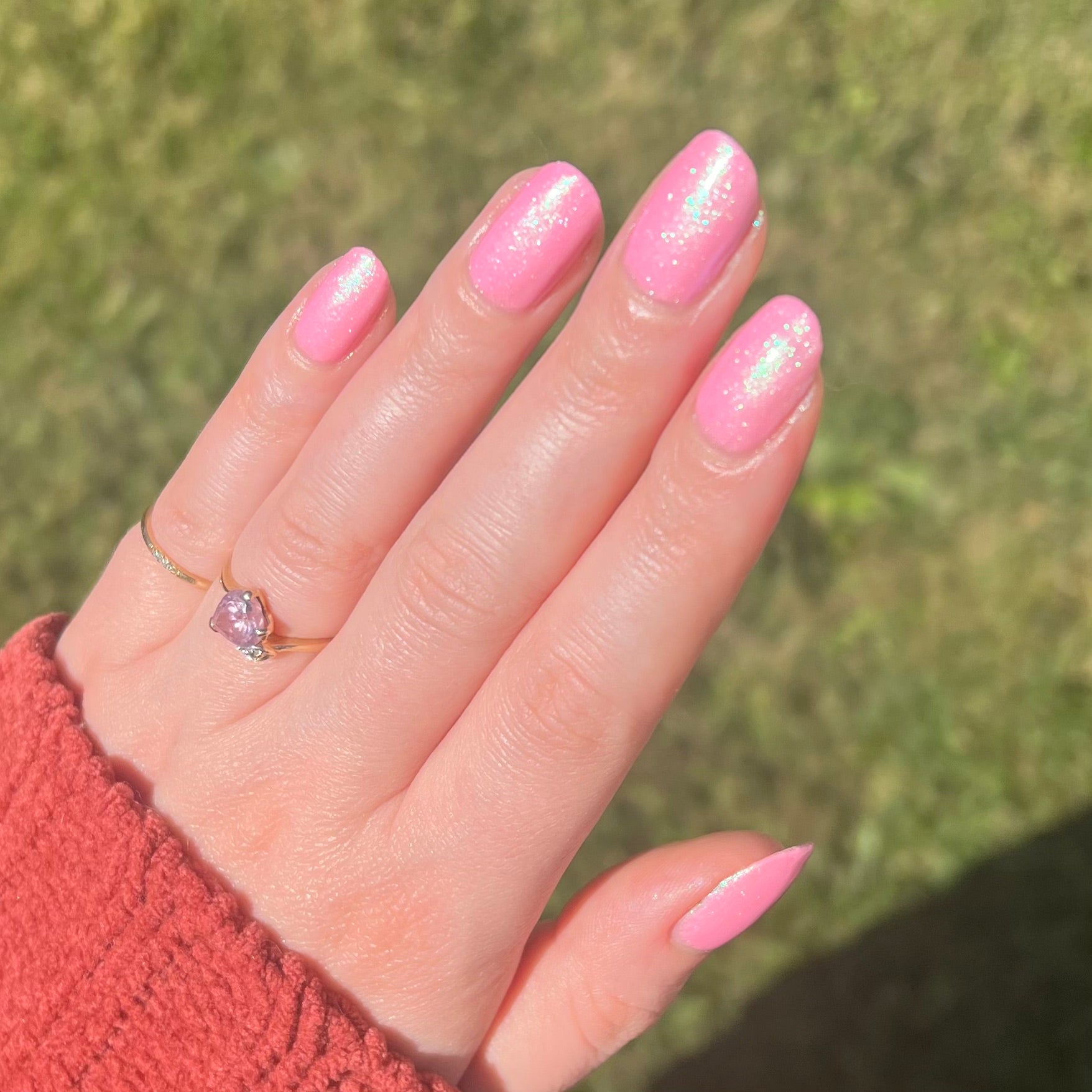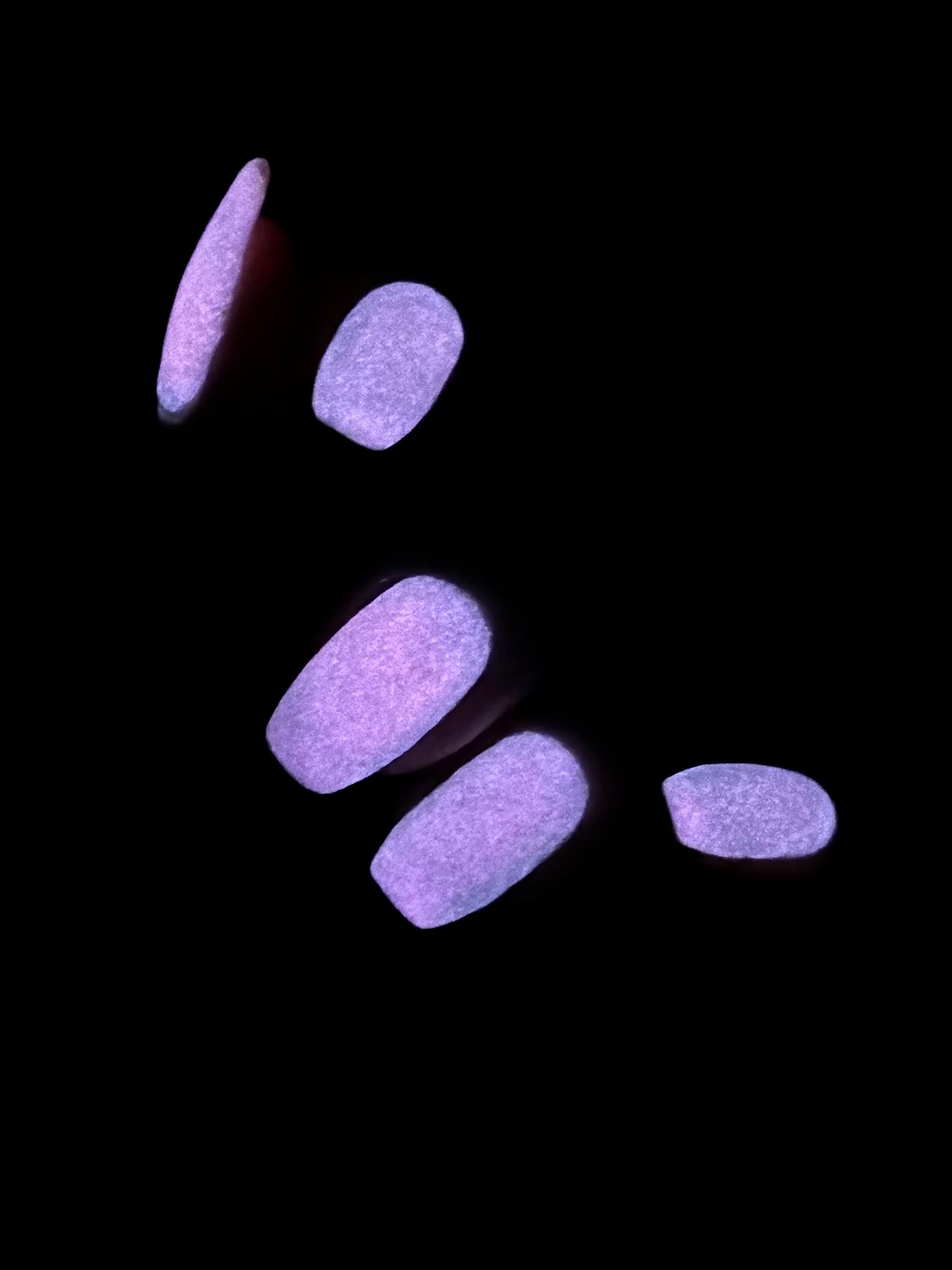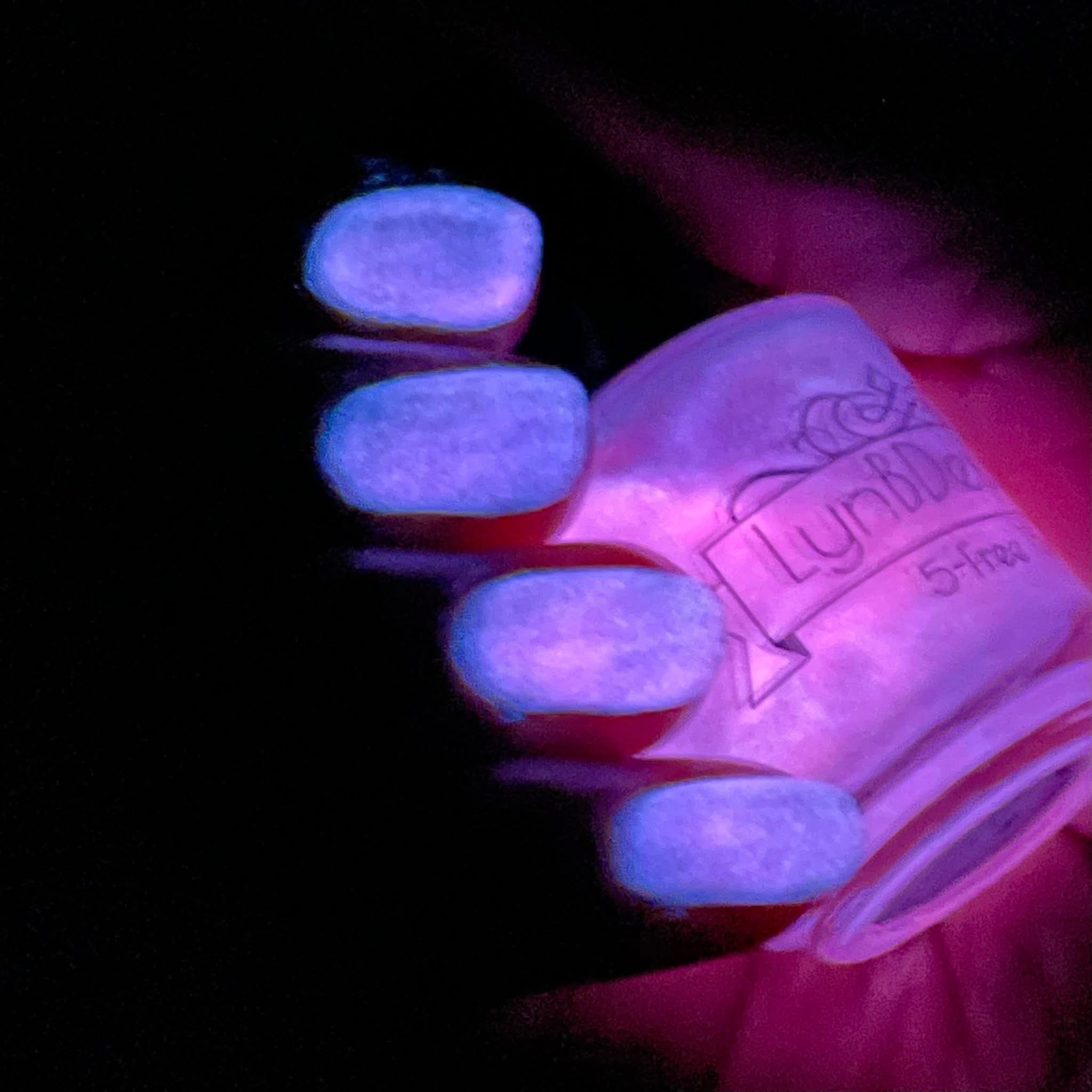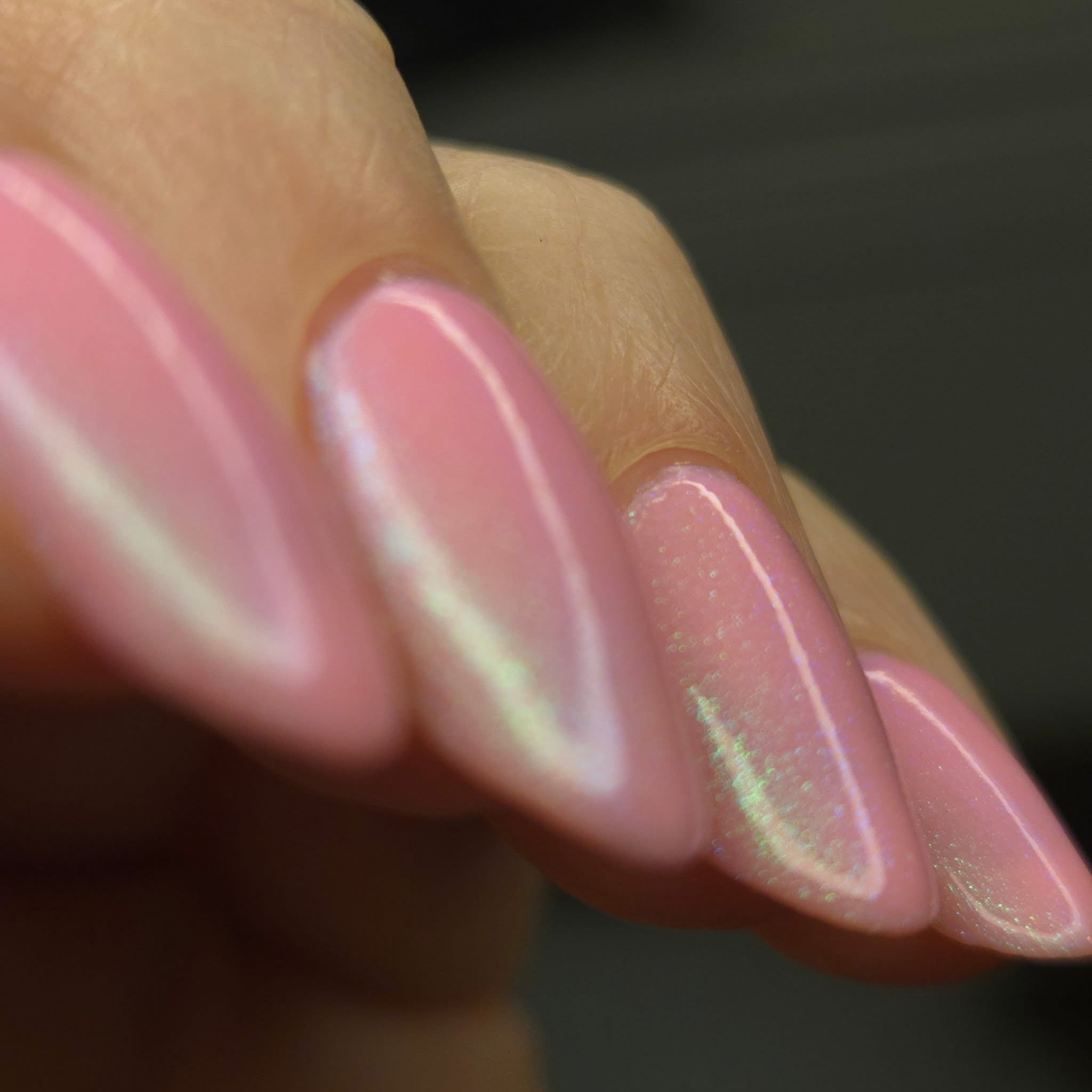 Strawberry Milk Tea- pastel neon pink with green to blue to indigo shifting shimmer and blue glow in the dark