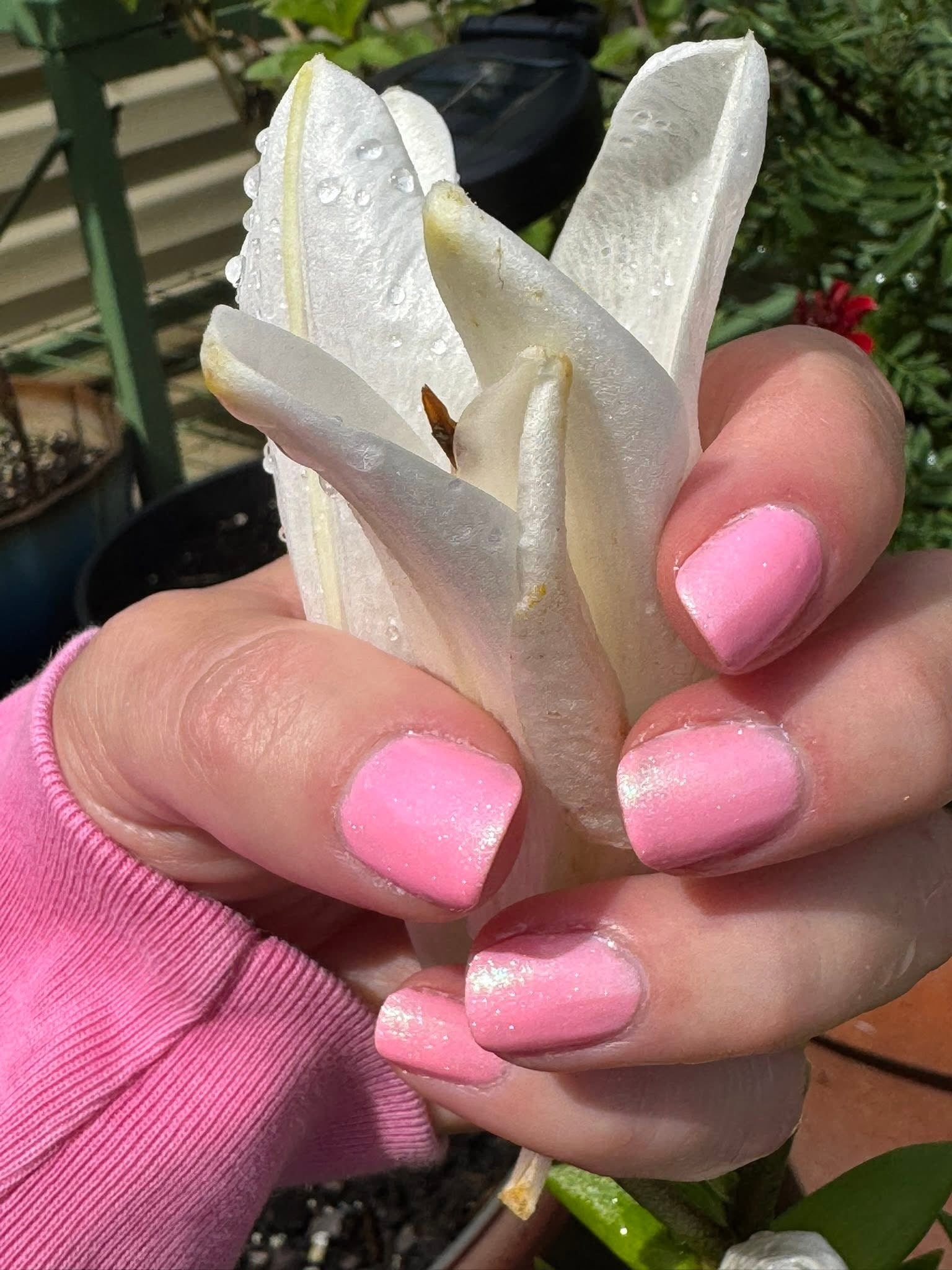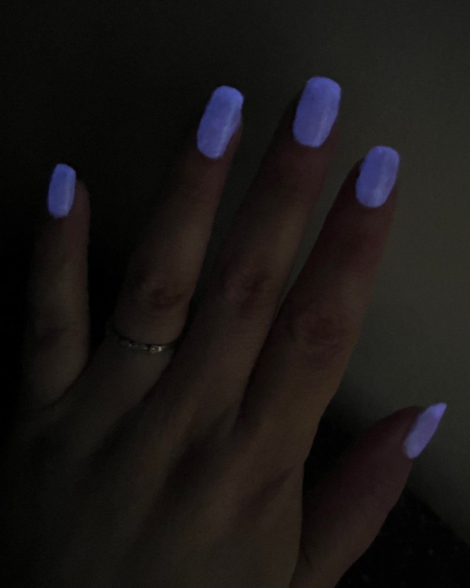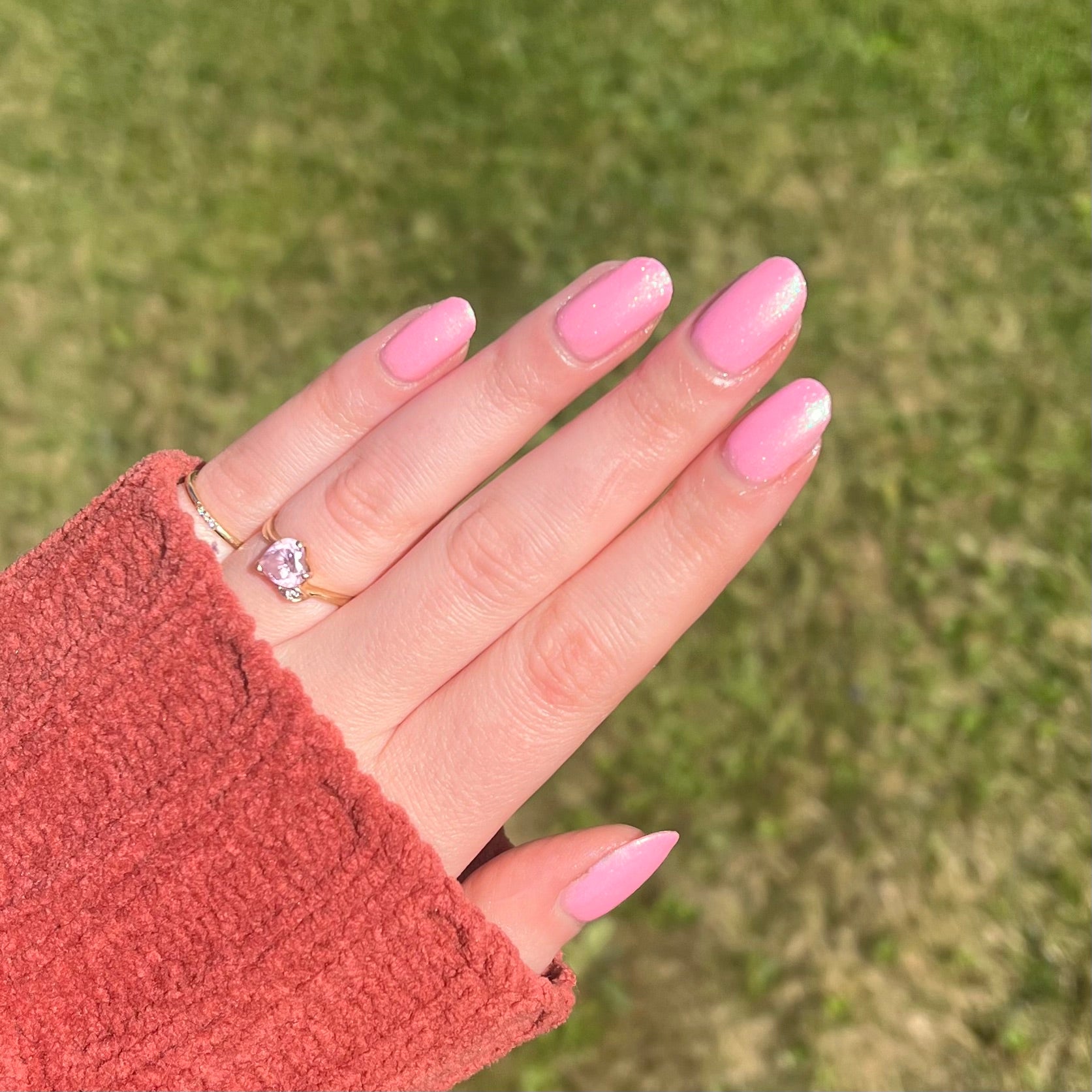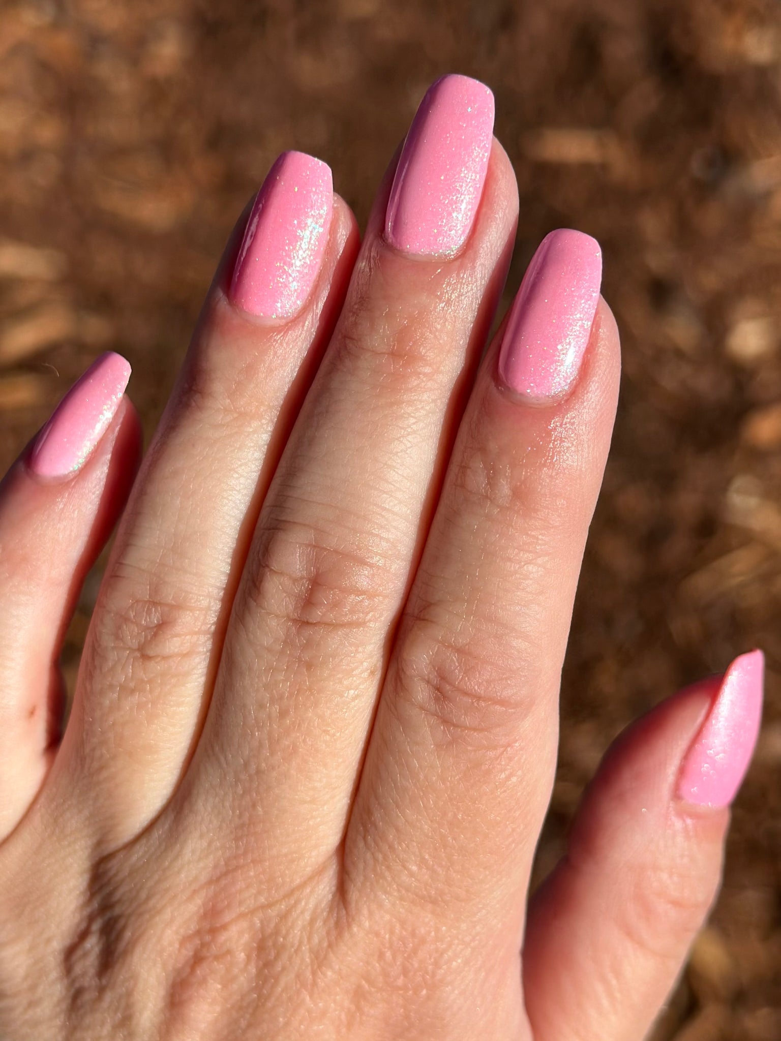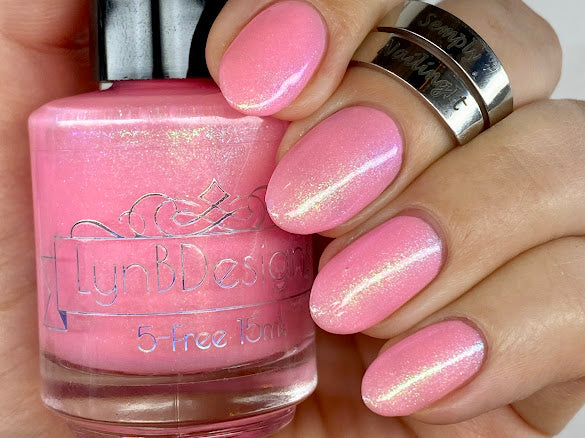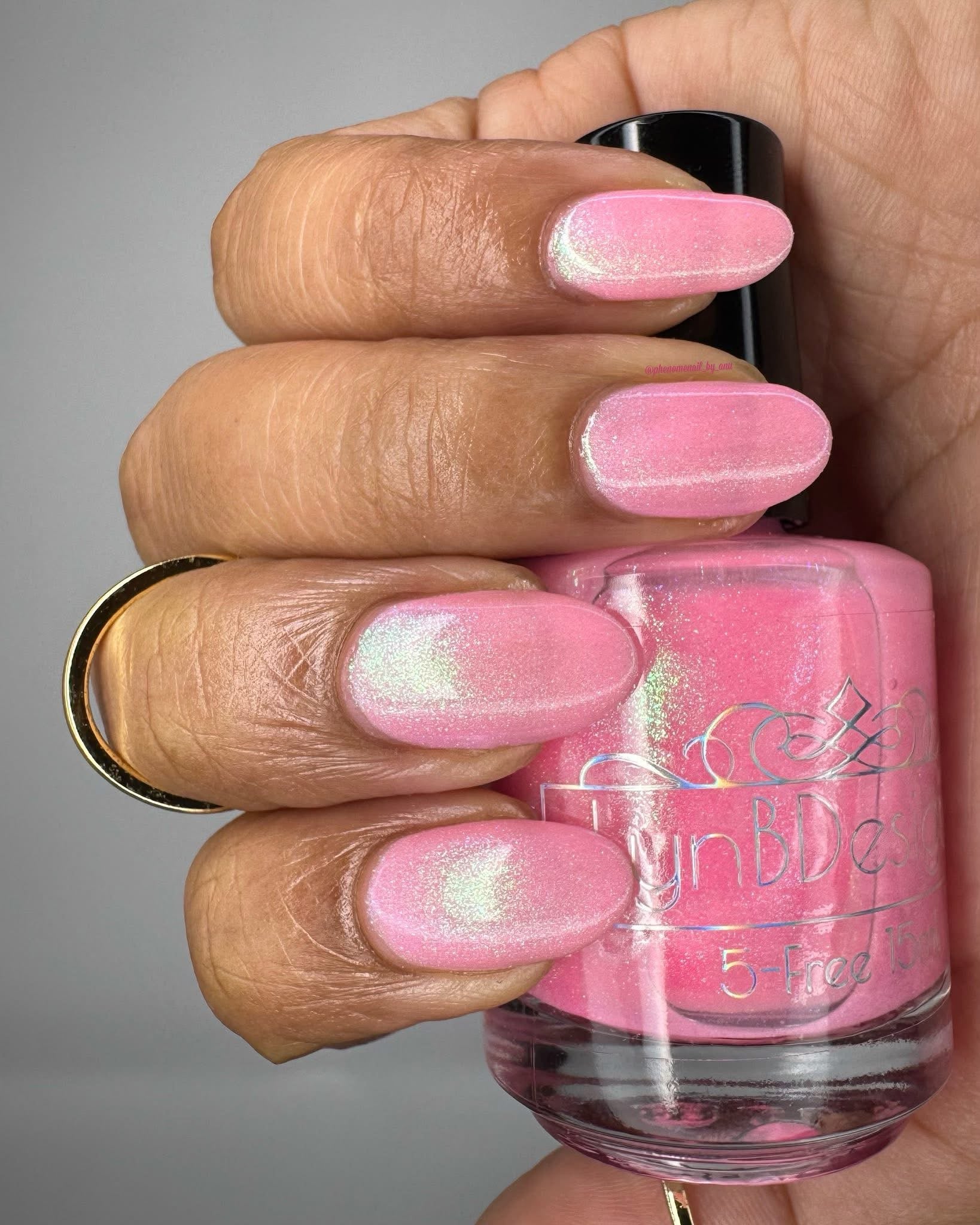 Strawberry Milk Tea- pastel neon pink with green to blue to indigo shifting shimmer and blue glow in the dark