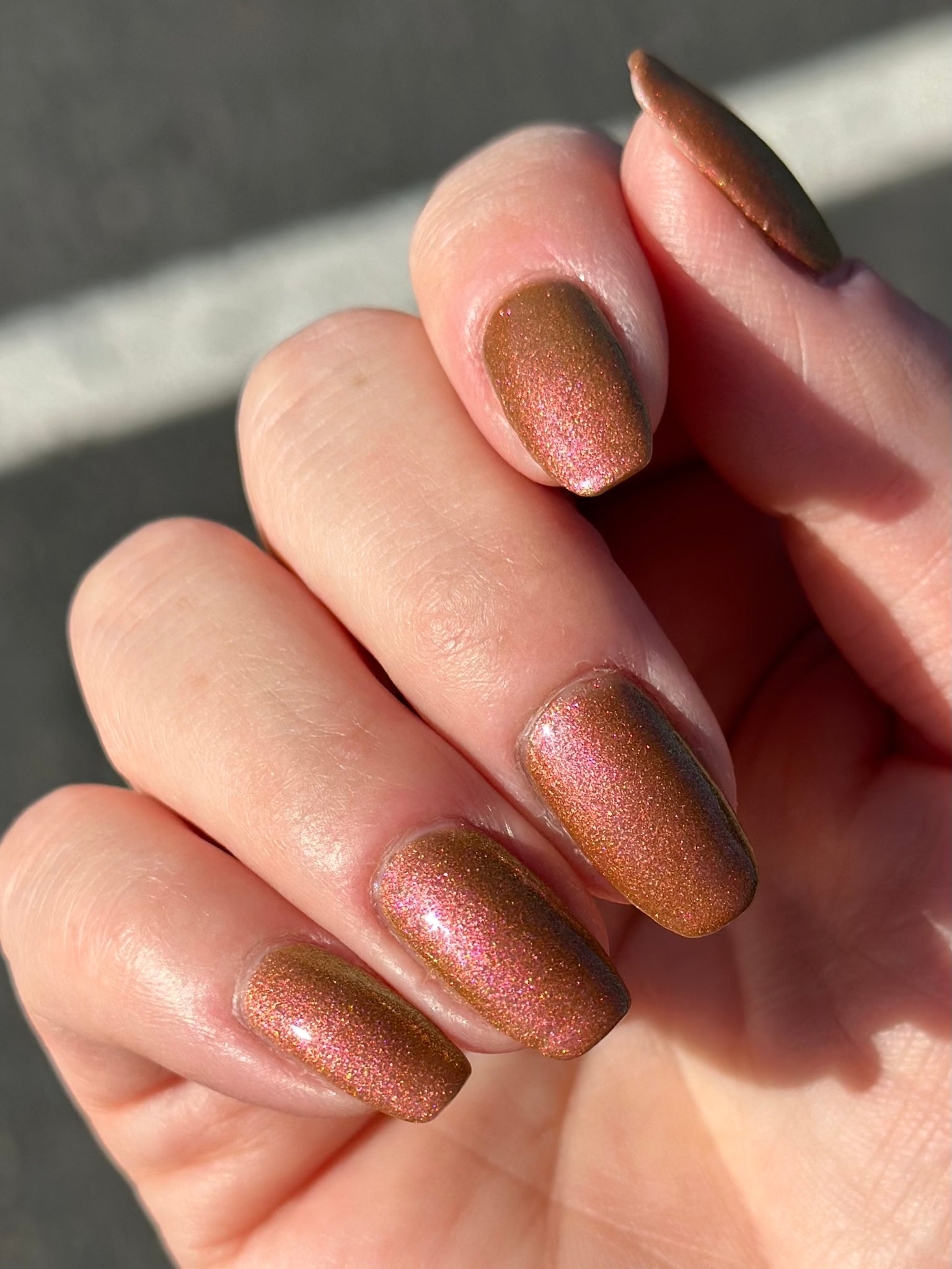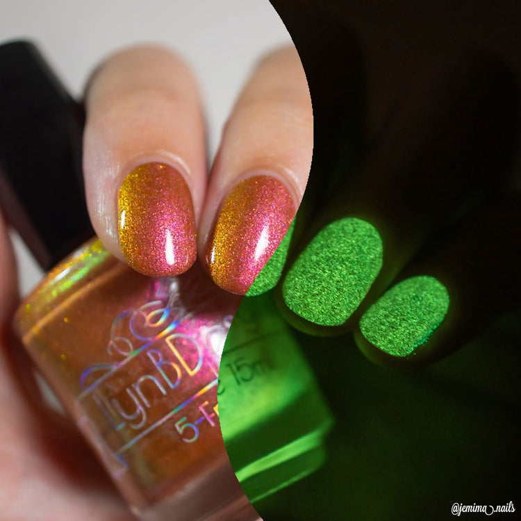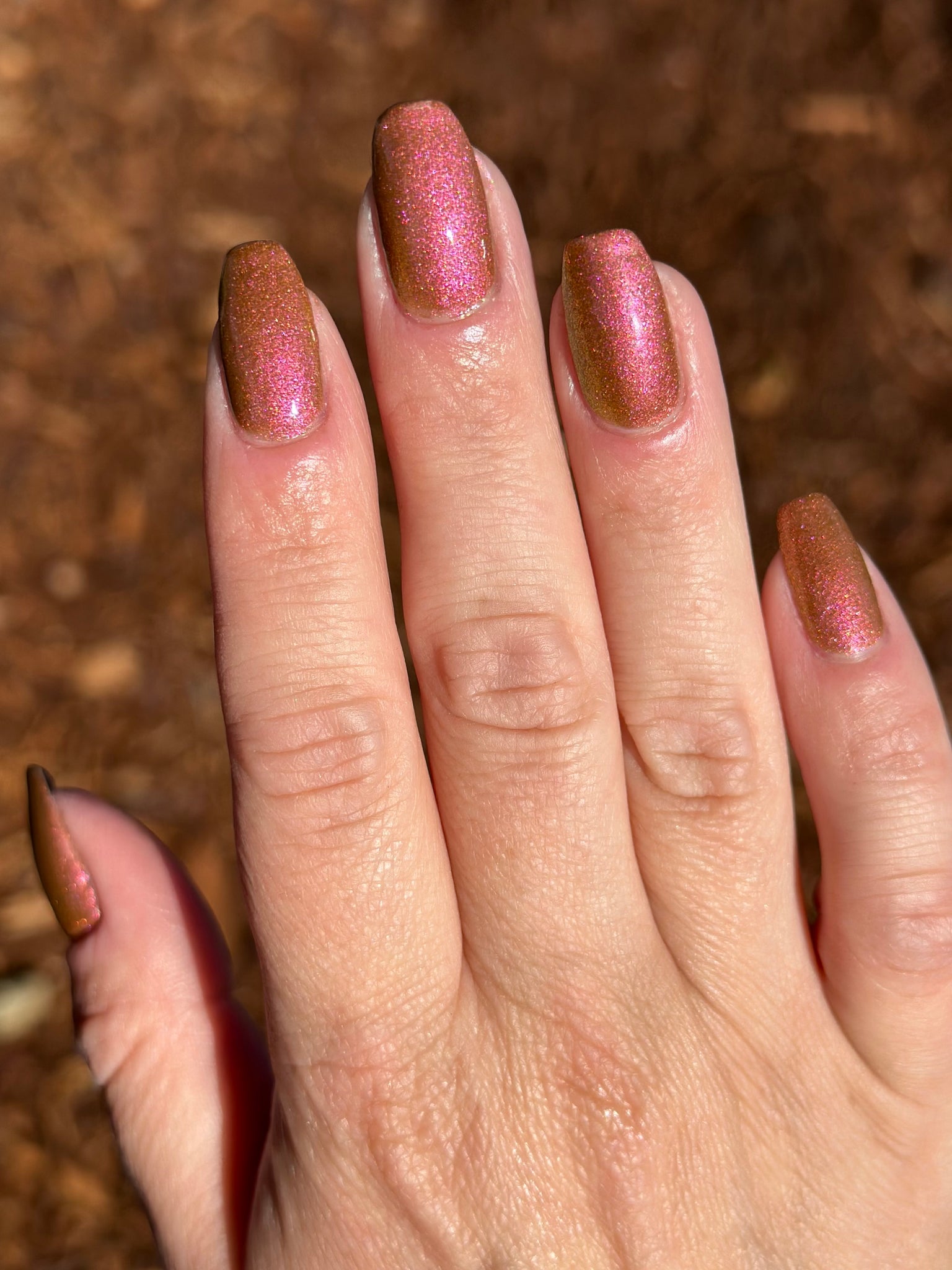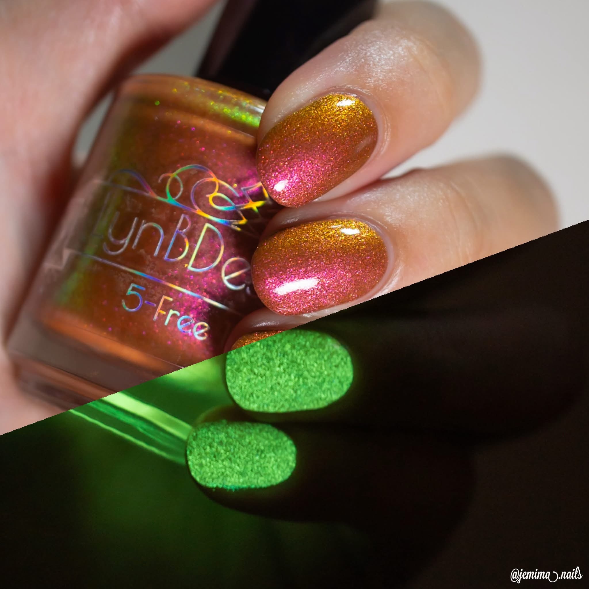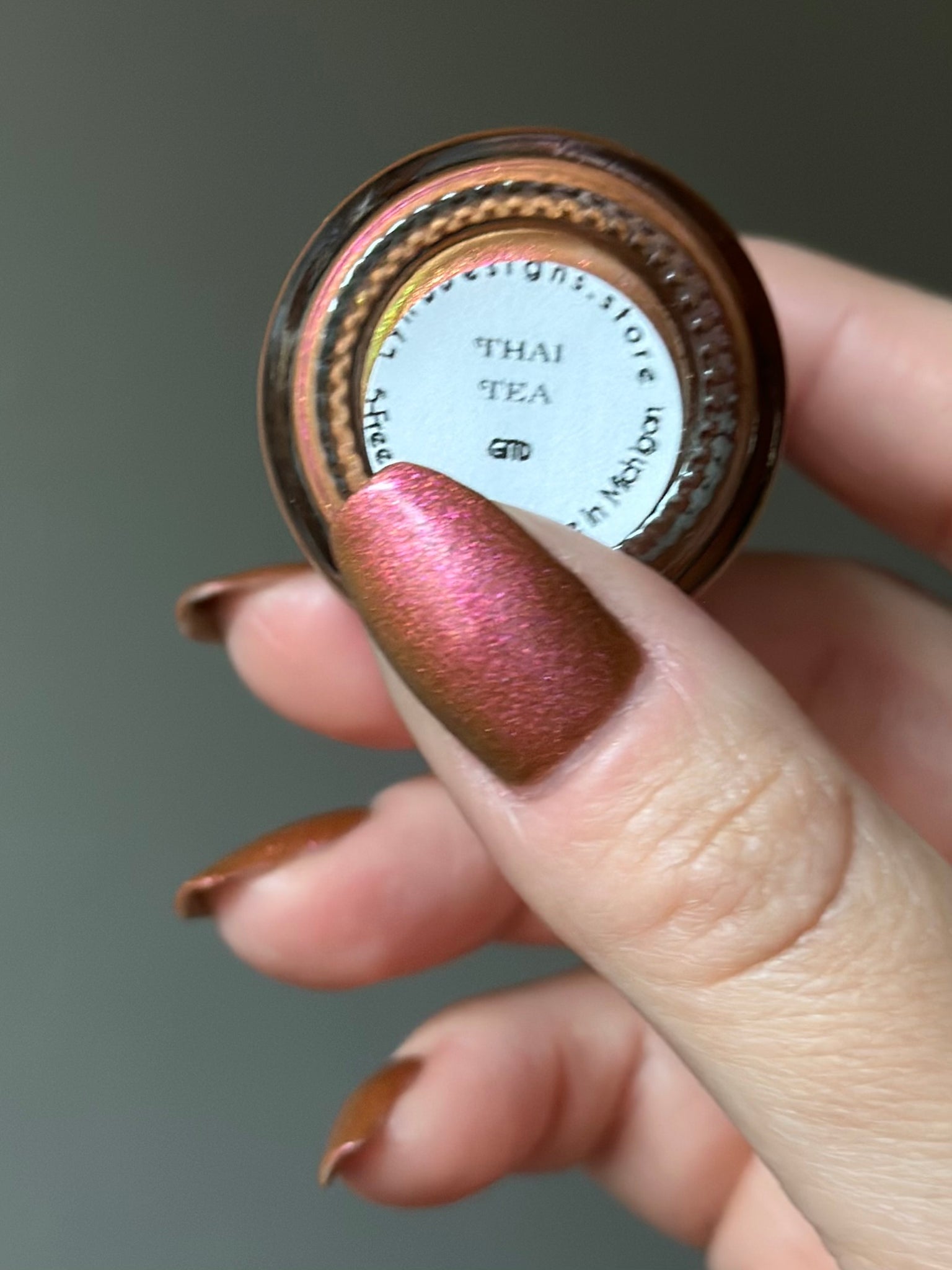 Thai Tea- warm brown base with pink to gold to green shifting shimmer and green glow in the dark