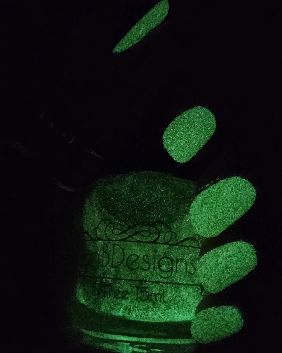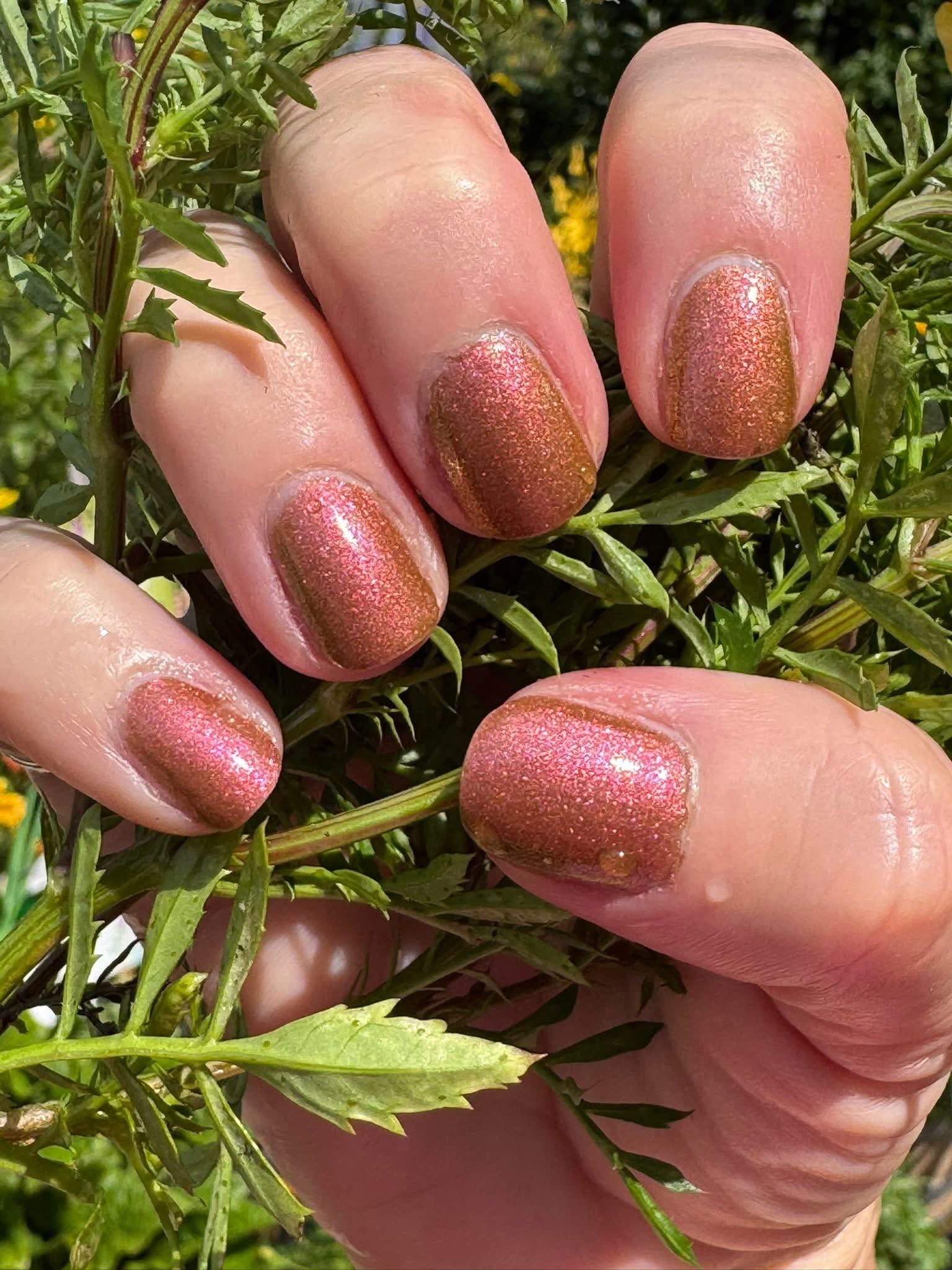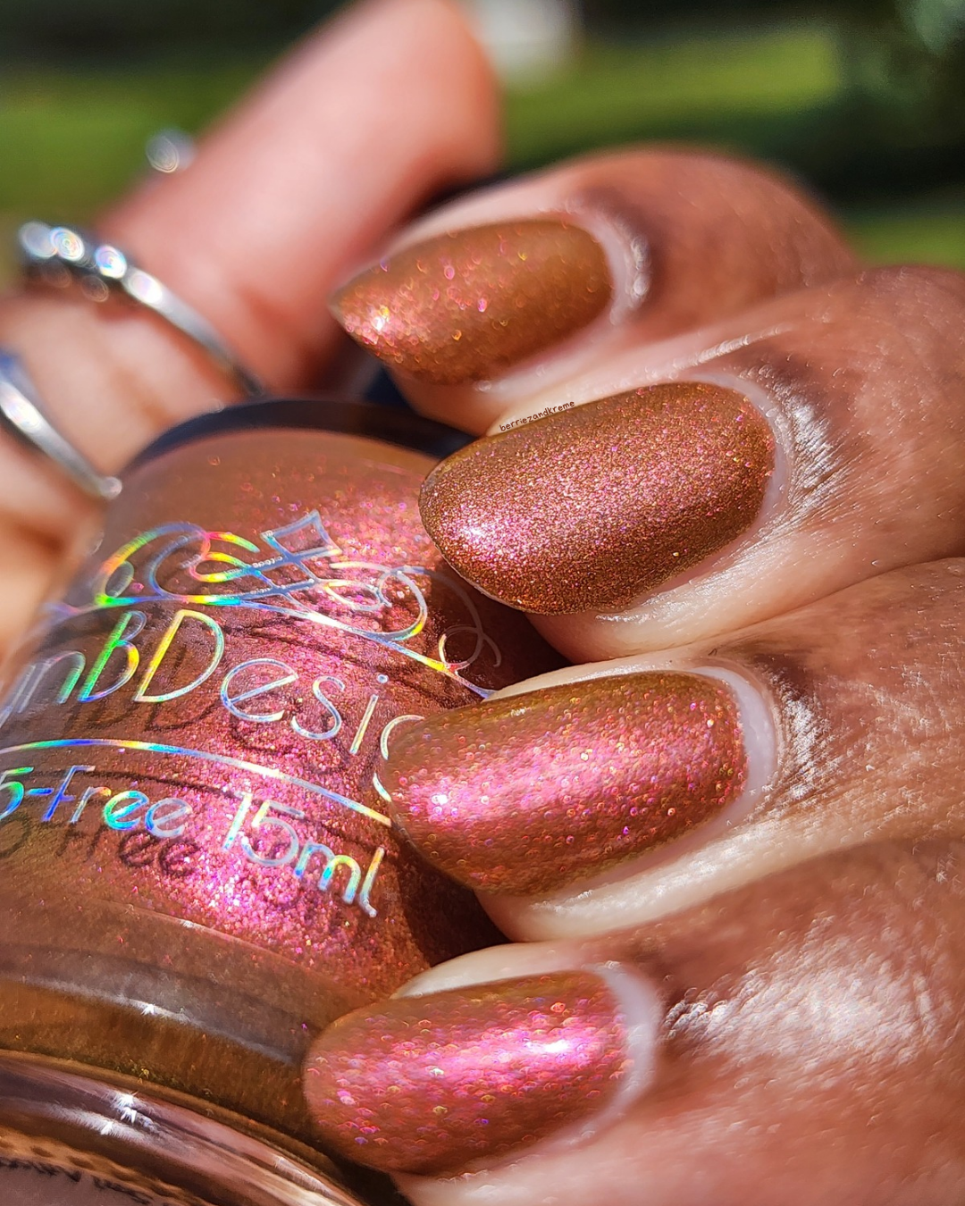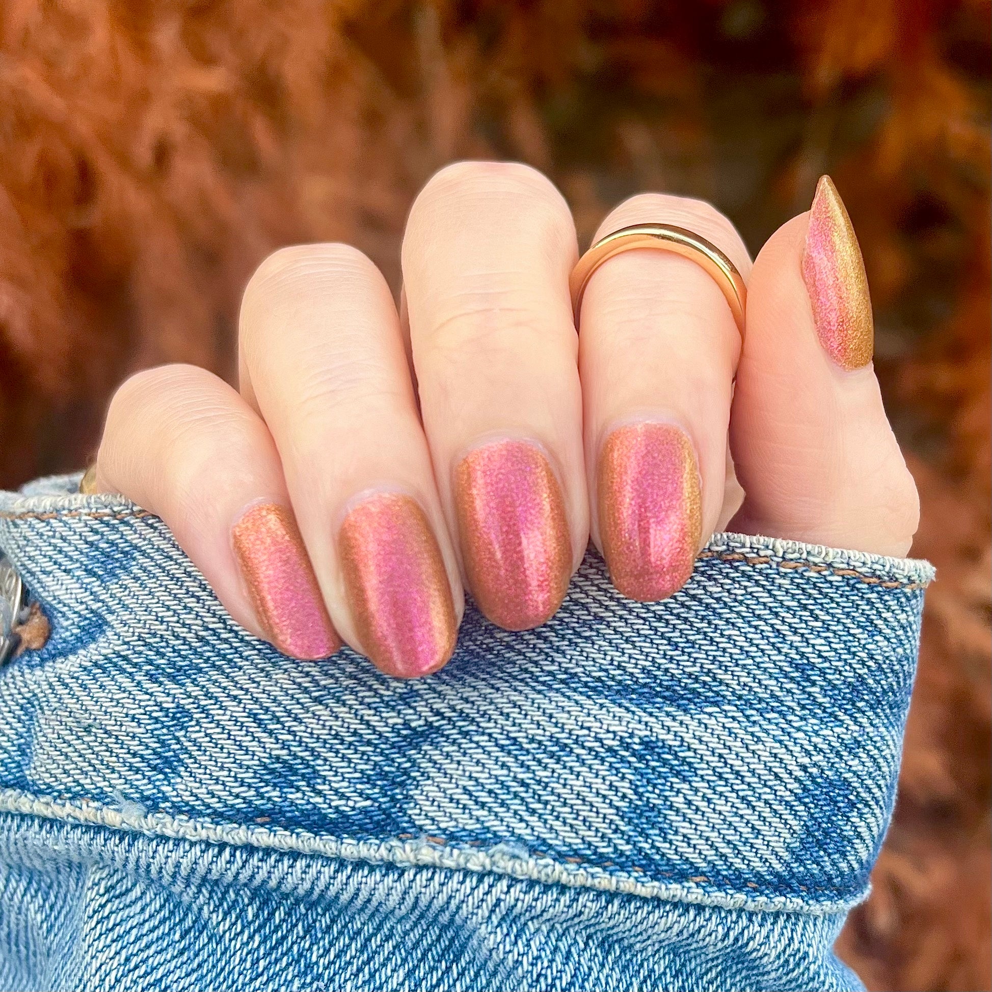 Thai Tea- warm brown base with pink to gold to green shifting shimmer and green glow in the dark