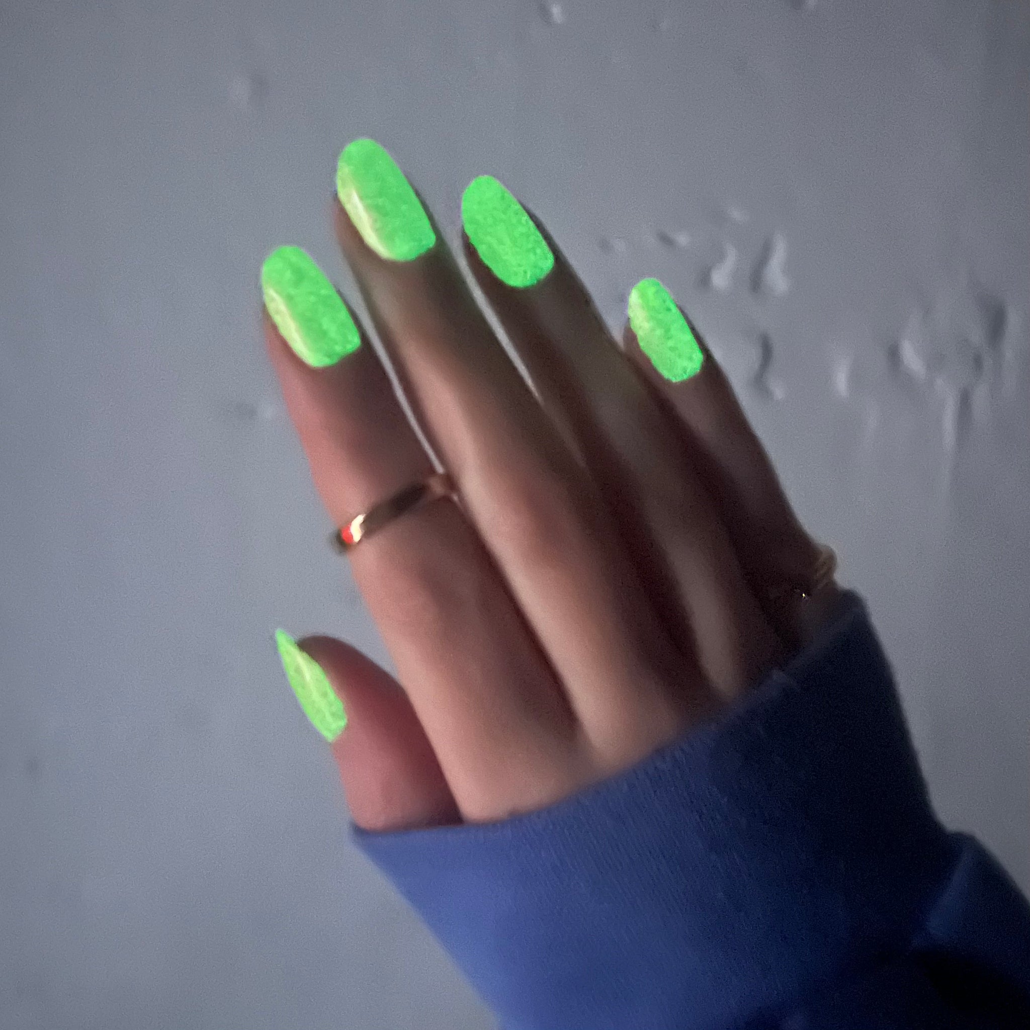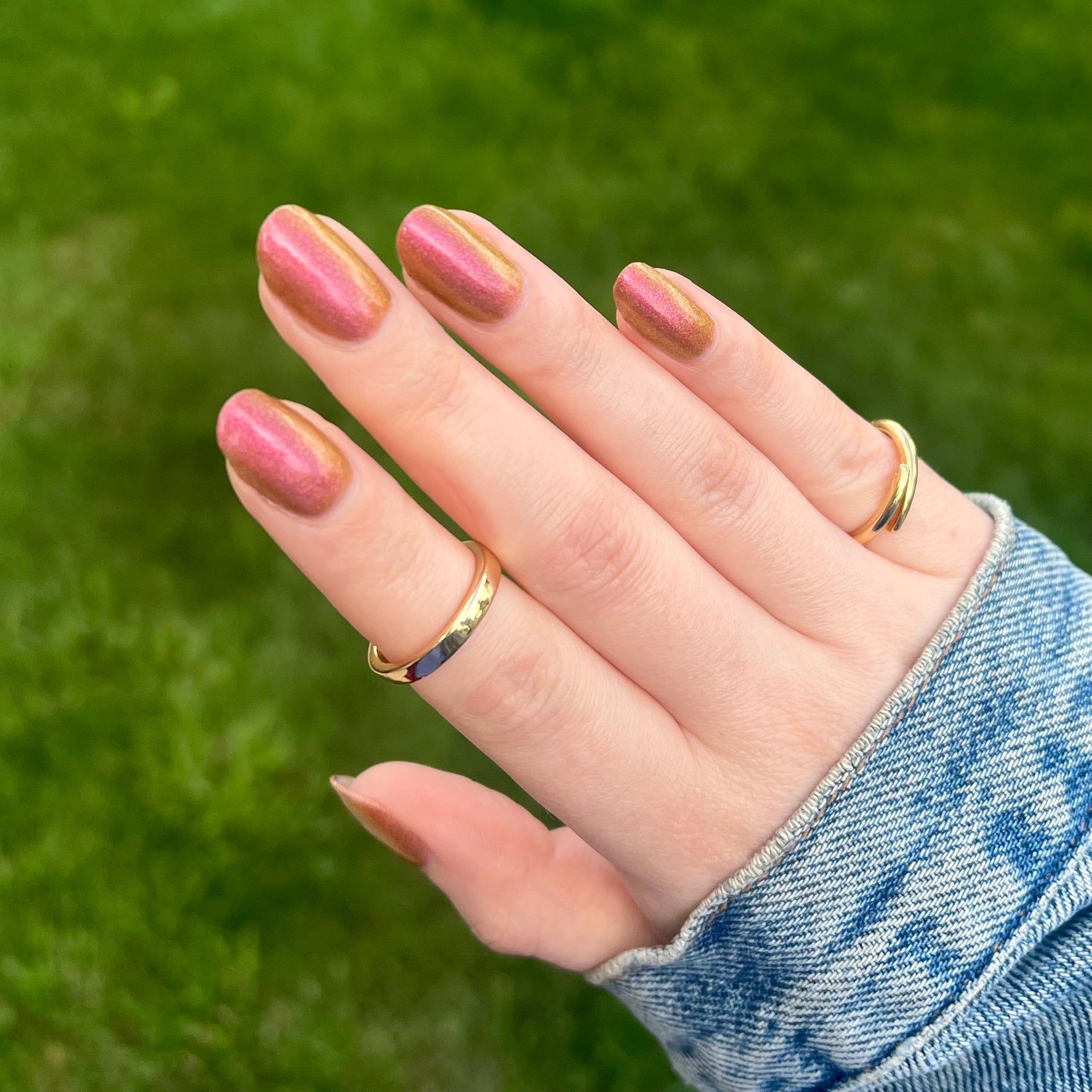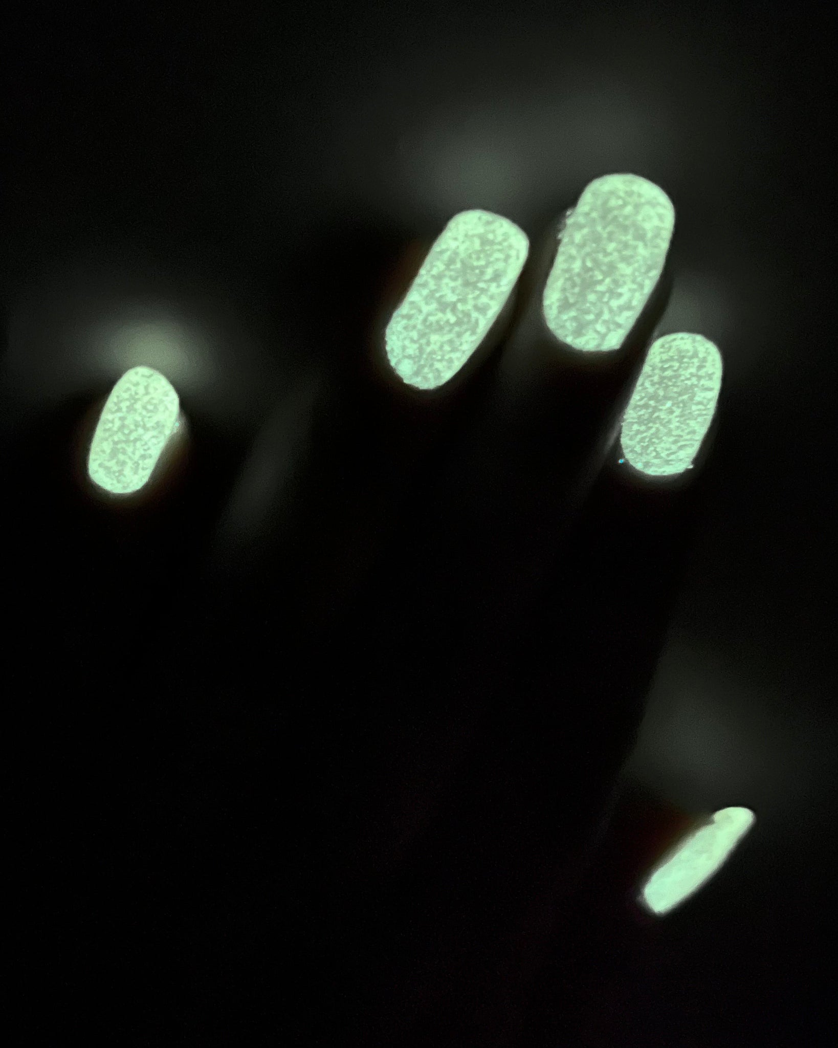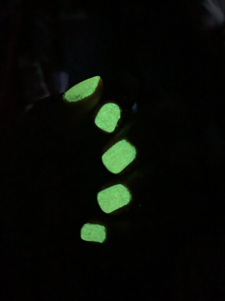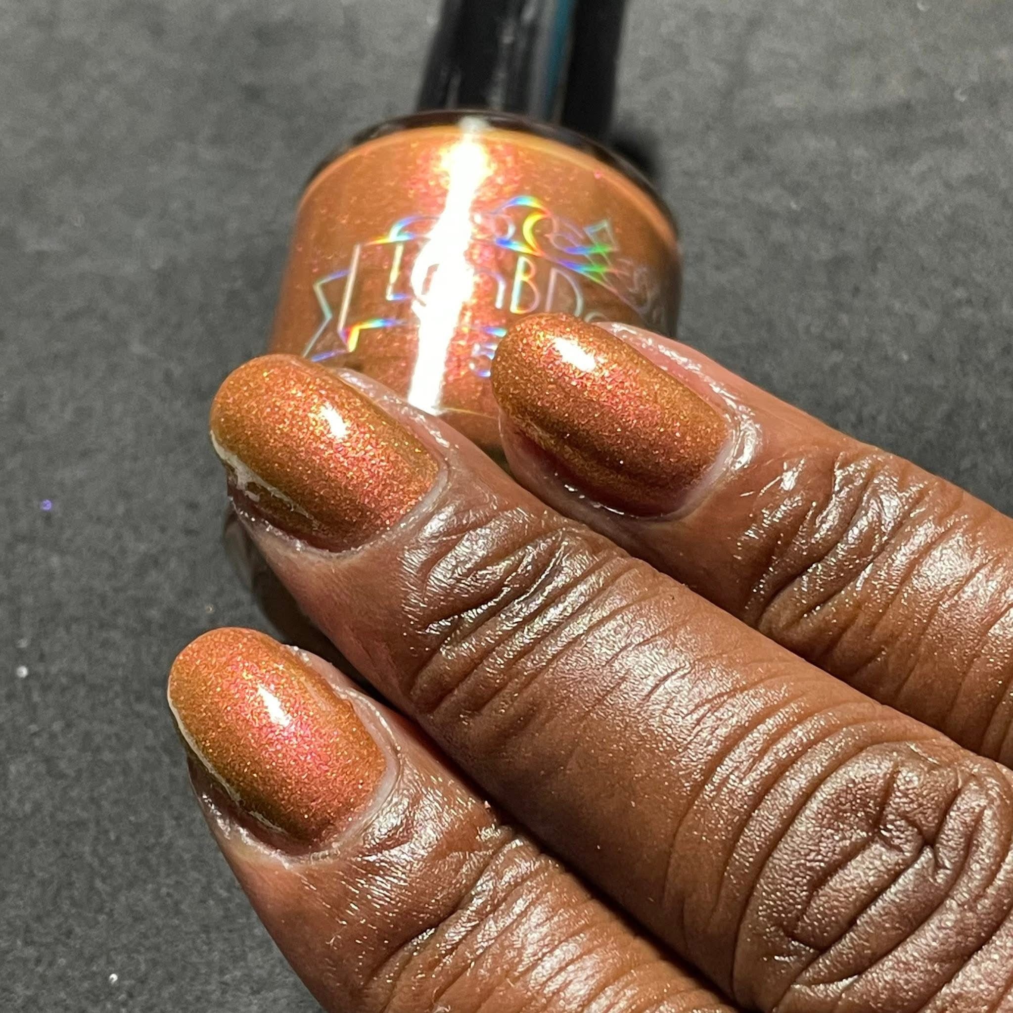 Thai Tea- warm brown base with pink to gold to green shifting shimmer and green glow in the dark